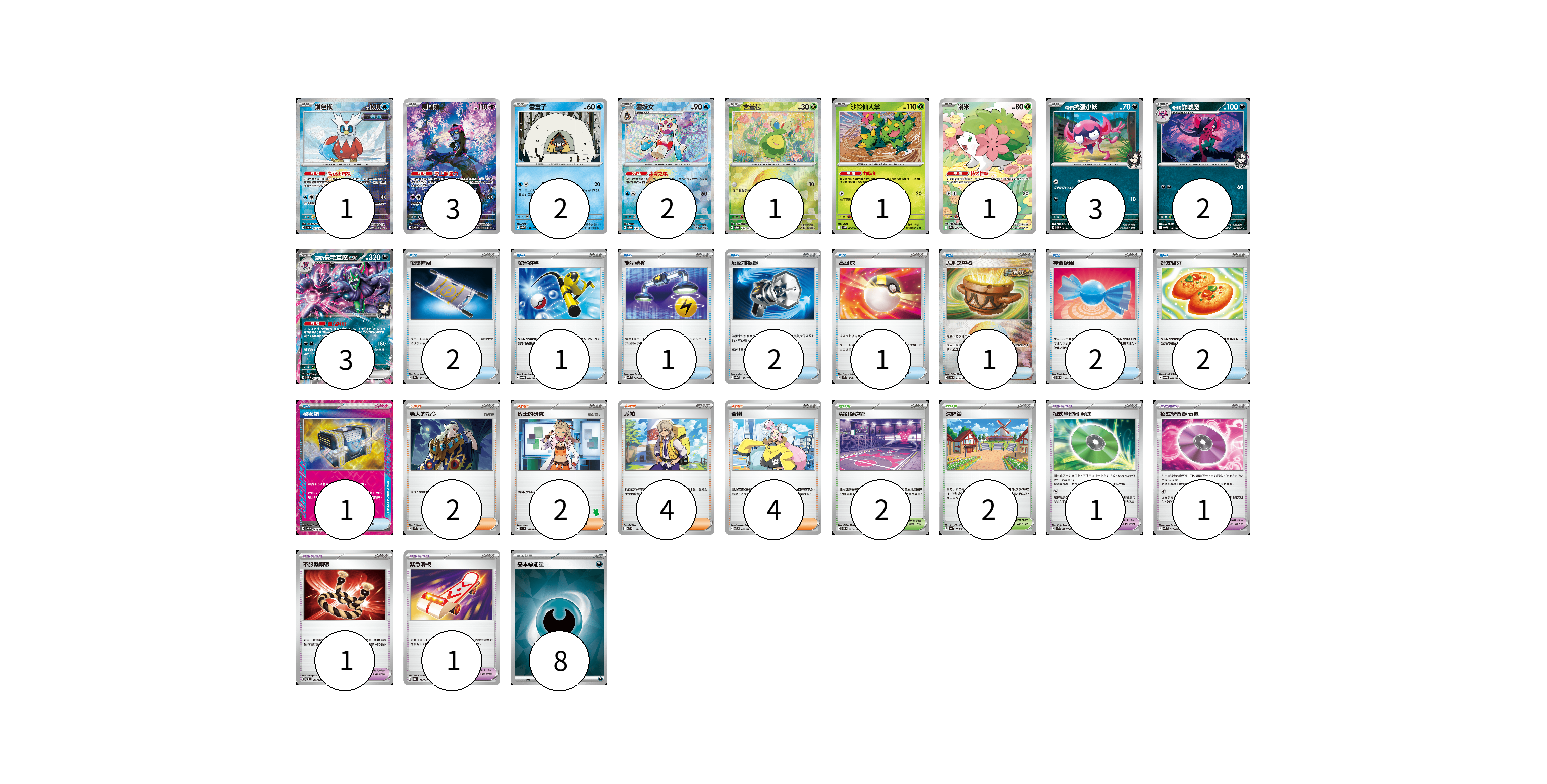 牌組構築方案 以此牌組為基礎新構築牌組 顯示卡面 顯示列表 寶可夢卡(19) 1 3 2 2 1 1 1 3 2 3 寶可夢道具(8) 4 1 1 1 1 物品卡(13) 2 1 1 2 1 1 2 2 1 支援者卡(8) 2 2 4 競技場卡(4) 2 2 能量卡(8) 8 寶可夢卡(19) 卡牌名稱 張數 卡牌名稱 張數 鐵包袱 SV8a 047/187 01 願增猿 SV6 107/101 03 雪童子 SV8a 037/187 02 雪妖女 SV8a 038/187 02 含羞苞 SV8a 001/187 01 沙鈴仙人掌 SV9 006/100 01 謝米 SV9a 066/063 01 <瑪俐的>搗蛋小妖 SVOM 005/021 03 <瑪俐的>詐唬魔 SVOM 006/021 02 <瑪俐的>長毛巨魔ex SVOM 007/021 03 寶可夢道具(8) 卡牌名稱 張數 卡牌名稱 張數 奇樹 SVTL 018/021 04 招式學習器 演進 SVK 025/042 01 招式學習器 衰退 SVK 026/042 01 不服輸頭帶 SVTL 016/021 01 緊急滑板 SV8a 153/187 01 物品卡(13) 卡牌名稱 張數 卡牌名稱 張數 夜間擔架 SV8a 151/187 02 厲害釣竿 SVOM 011/021 01 能量轉移 SVK 008/042 01 反擊捕捉器 SV8a 139/187 02 高級球 SVM 134/175 01 大地之容器 SV8a 143/187 01 神奇糖果 SVOM 014/021 02 好友寶芬 SVOM 012/021 02 秘密箱 SV6 092/101 01 支援者卡(8) 卡牌名稱 張數 卡牌名稱 張數 老大的指令 SVM 172/175 02 博士的研究 SVI 063/066 02 派帕 SVD 137/139 04 競技場卡(4) 卡牌名稱 張數 卡牌名稱 張數 尖釘鎮道館 SVOM 021/021 02 深缽鎮 SV4a 185/190 02 能量卡(8) 卡牌名稱 張數 卡牌名稱 張數 基本【惡】能量 SVOM DAR 08 以此牌組為基礎新構築牌組 牌組編碼 vEtPvi-OYxbuu-hdlaKA copy 列印牌組單 牌組編碼已複製 分享至SNS