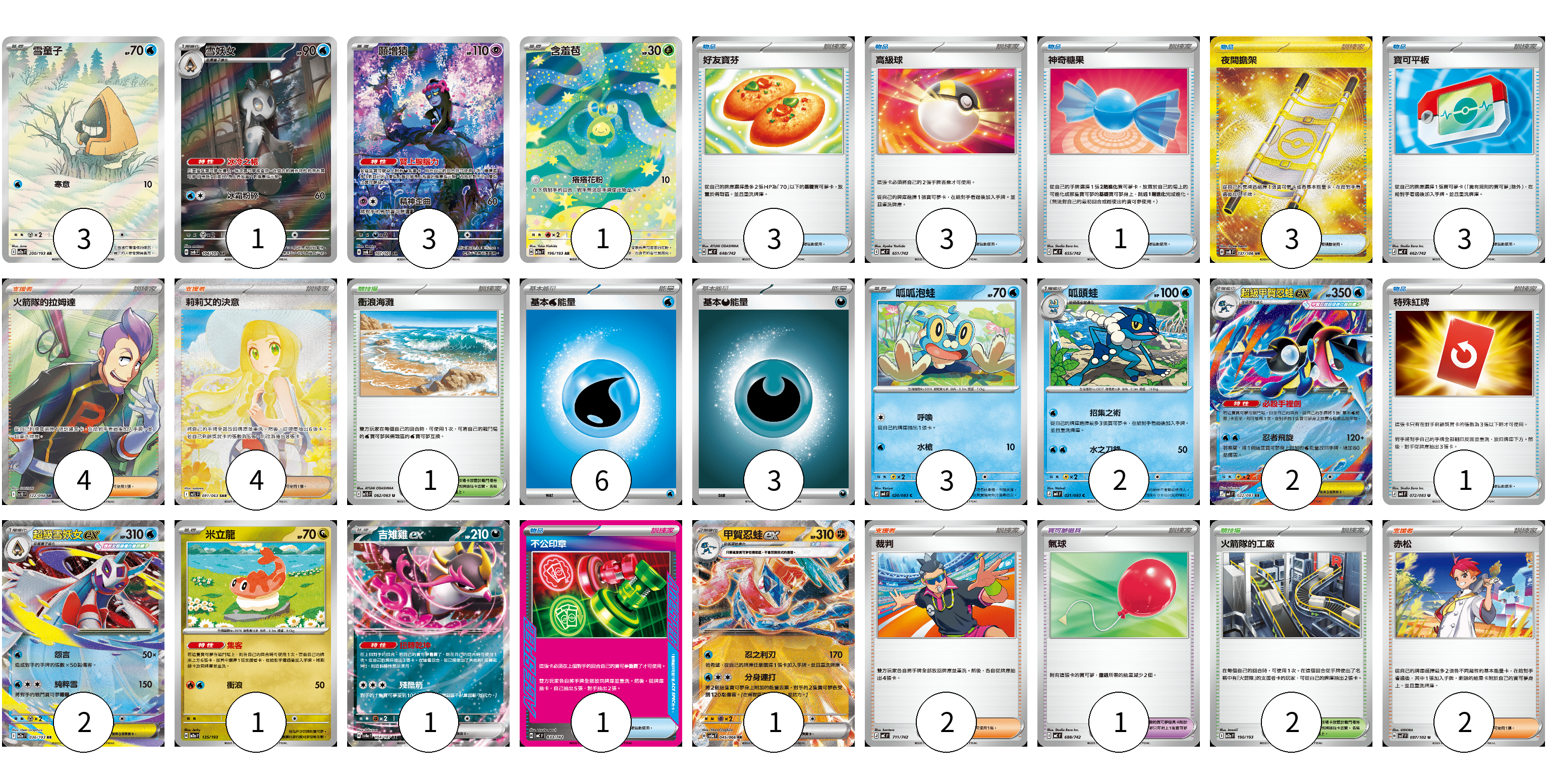 牌組構築方案 以此牌組為基礎新構築牌組 顯示卡面 顯示列表 寶可夢卡(20) 3 1 3 1 3 2 2 2 1 1 1 寶可夢道具(1) 1 物品卡(15) 3 3 1 3 3 1 1 支援者卡(12) 4 4 2 2 競技場卡(3) 1 2 能量卡(9) 6 3 寶可夢卡(20) 卡牌名稱 張數 卡牌名稱 張數 雪童子 M2a 200/193 03 雪妖女 SV6 104/101 01 願增猿 SV6 107/101 03 含羞苞 M2a 196/193 01 呱呱泡蛙 M4 020/083 03 呱頭蛙 M4 021/083 02 超級甲賀忍蛙ex M4 022/083 02 超級雪妖女ex M2a 036/193 02 米立龍 M2a 135/193 01 吉雉雞ex SV8a 104/187 01 甲賀忍蛙ex SV5a 045/066 01 寶可夢道具(1) 卡牌名稱 張數 卡牌名稱 張數 氣球 MC 688/742 01 物品卡(15) 卡牌名稱 張數 卡牌名稱 張數 好友寶芬 MC 648/742 03 高級球 MC 651/742 03 神奇糖果 MC 655/742 01 夜間擔架 SV8 137/106 03 寶可平板 MC 662/742 03 特殊紅牌 M4 072/083 01 不公印章 MC 633/742 01 支援者卡(12) 卡牌名稱 張數 卡牌名稱 張數 火箭隊的拉姆達 SV10 122/098 04 莉莉艾的決意 M1L 091/063 04 裁判 MC 711/742 02 赤松 SV7 097/102 02 競技場卡(3) 卡牌名稱 張數 卡牌名稱 張數 衝浪海灘 M1S 062/063 01 火箭隊的工廠 M2a 190/193 02 能量卡(9) 卡牌名稱 張數 卡牌名稱 張數 基本【水】能量 MC WAT 06 基本【惡】能量 MC DAR 03 以此牌組為基礎新構築牌組 牌組編碼 vEvjIh-bMrRUX-rKzfKy copy 列印牌組單 牌組編碼已複製 分享至SNS