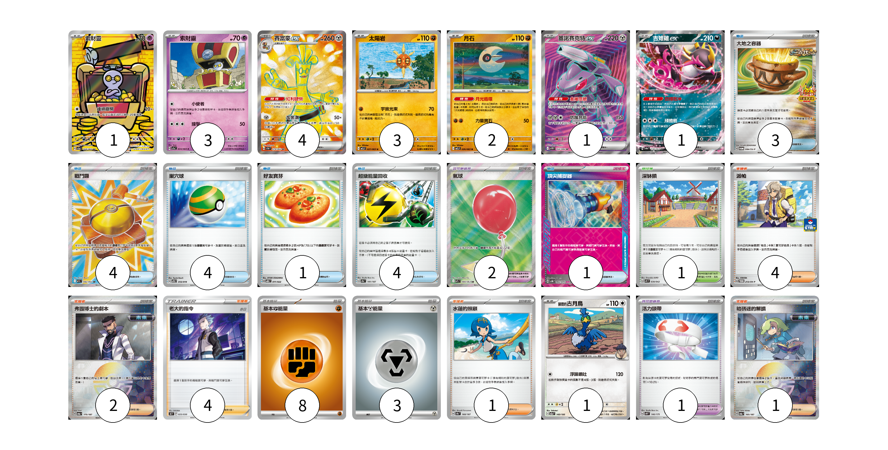 牌組構築方案 以此牌組為基礎新構築牌組 顯示卡面 顯示列表 寶可夢卡(16) 1 3 4 3 2 1 1 1 寶可夢道具(3) 2 1 物品卡(17) 3 4 4 1 4 1 支援者卡(12) 4 2 4 1 1 競技場卡(1) 1 能量卡(11) 8 3 寶可夢卡(16) 卡牌名稱 張數 卡牌名稱 張數 索財靈 SV3a 068/062 01 索財靈 SV7a 024/064 03 賽富豪ex SV3a 079/062 04 太陽岩 M1L 027/063 03 月石 M1L 026/063 02 蓋諾賽克特ex SV11B 164/086 01 吉雉雞ex SV6a 038/064 01 赫普的古月鳥 M2a 143/193 01 寶可夢道具(3) 卡牌名稱 張數 卡牌名稱 張數 氣球 M1L 084/063 02 活力頭帶 SVM 140/175 01 物品卡(17) 卡牌名稱 張數 卡牌名稱 張數 大地之容器 SV-P 084/SV-P 03 戰鬥鑼 M1L 082/063 04 巢穴球 SVTG 012/019 04 好友寶芬 MBG 011/022 01 超級能量回收 SV8a 141/187 04 頂尖捕捉器 SV5M 062/071 01 支援者卡(12) 卡牌名稱 張數 卡牌名稱 張數 派帕 SV-P 213/SV-P 04 弗圖博士的劇本 SV8a 175/187 02 老大的指令(赤日) SK 025/030 04 水蓮的照顧 SV8a 168/187 01 暗碼迷的解讀 SV8a 165/187 01 競技場卡(1) 卡牌名稱 張數 卡牌名稱 張數 深缽鎮 SVK 039/042 01 能量卡(11) 卡牌名稱 張數 卡牌名稱 張數 基本【鬥】能量 SVD FIG 08 基本【鋼】能量 SVB MET 03 以此牌組為基礎新構築牌組 牌組編碼 vHRaZl-uMCiHv-cnYmql copy 列印牌組單 牌組編碼已複製 分享至SNS