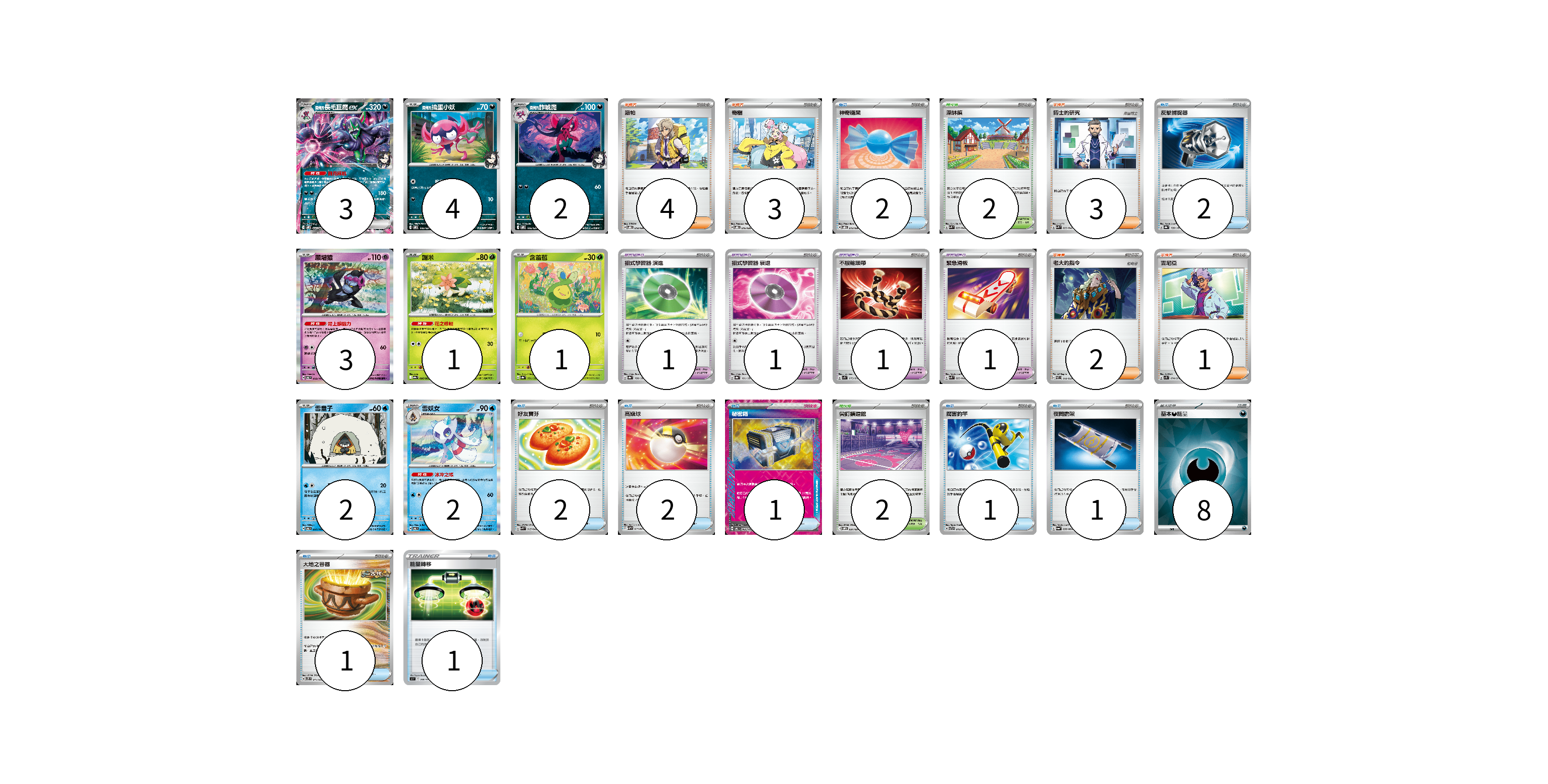 牌組構築方案 以此牌組為基礎新構築牌組 顯示卡面 顯示列表 寶可夢卡(18) 3 4 2 3 1 1 2 2 寶可夢道具(4) 1 1 1 1 物品卡(13) 2 2 2 2 1 1 1 1 1 支援者卡(13) 4 3 3 2 1 競技場卡(4) 2 2 能量卡(8) 8 寶可夢卡(18) 卡牌名稱 張數 卡牌名稱 張數 <瑪俐的>長毛巨魔ex SVOM 007/021 03 <瑪俐的>搗蛋小妖 SVOM 005/021 04 <瑪俐的>詐唬魔 SVOM 006/021 02 願增猿 SV6 055/101 03 謝米 SV9a 006/063 01 含羞苞 SV8a 001/187 01 雪童子 SV6 031/101 02 雪妖女 SV6 033/101 02 寶可夢道具(4) 卡牌名稱 張數 卡牌名稱 張數 招式學習器 演進 SV8a 160/187 01 招式學習器 衰退 SV8a 161/187 01 不服輸頭帶 SV1S 073/078 01 緊急滑板 SVK 023/042 01 物品卡(13) 卡牌名稱 張數 卡牌名稱 張數 神奇糖果 SVOD 013/020 02 反擊捕捉器 SV8a 139/187 02 好友寶芬 SVK 015/042 02 高級球 SVHM 013/022 02 秘密箱 SV6 092/101 01 厲害釣竿 SVTR 012/021 01 夜間擔架 SV6a 056/064 01 大地之容器 SVTS 011/022 01 能量轉移 SI 366/414 01 支援者卡(13) 卡牌名稱 張數 卡牌名稱 張數 派帕 SVOD 018/020 04 奇樹 SVOD 016/020 03 博士的研究 SVK 033/042 03 老大的指令 SVEL 019/020 02 吉尼亞 SV1S 074/078 01 競技場卡(4) 卡牌名稱 張數 卡牌名稱 張數 深缽鎮 SVK 039/042 02 尖釘鎮道館 SVOM 021/021 02 能量卡(8) 卡牌名稱 張數 卡牌名稱 張數 基本【惡】能量 SVM DAR 08 以此牌組為基礎新構築牌組 牌組編碼 vJEcNh-dqgnDM-sTsuqO copy 列印牌組單 牌組編碼已複製 分享至SNS