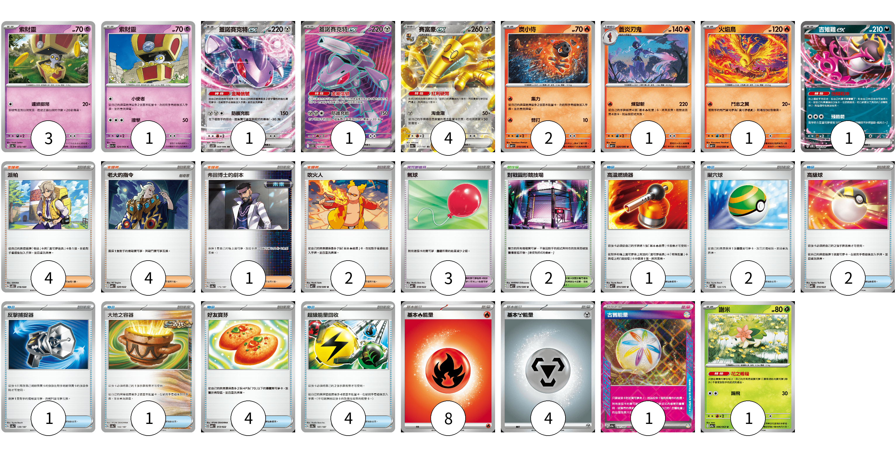 牌組構築方案 以此牌組為基礎新構築牌組 顯示卡面 顯示列表 寶可夢卡(16) 3 1 1 1 4 2 1 1 1 1 寶可夢道具(3) 3 物品卡(15) 1 2 2 1 1 4 4 支援者卡(11) 4 4 1 2 競技場卡(2) 2 能量卡(13) 8 4 1 寶可夢卡(16) 卡牌名稱 張數 卡牌名稱 張數 索財靈 SV8a 073/187 03 索財靈 SV7a 024/064 01 蓋諾賽克特ex SV11B 069/086 01 蓋諾賽克特ex SV11B 164/086 01 賽富豪ex SV8a 117/187 04 炭小侍 M2 019/080 02 蒼炎刃鬼 M2 020/080 01 火焰鳥 M2 014/080 01 吉雉雞ex SVOD 004/020 01 謝米 SV9a 006/063 01 寶可夢道具(3) 卡牌名稱 張數 卡牌名稱 張數 氣球 MBD 018/022 03 物品卡(15) 卡牌名稱 張數 卡牌名稱 張數 高溫燃燒器 M2 074/080 01 巢穴球 SVM 133/175 02 高級球 MBD 014/022 02 反擊捕捉器 SV8a 139/187 01 大地之容器 SV8a 143/187 01 好友寶芬 MBD 013/022 04 超級能量回收 SV8a 141/187 04 支援者卡(11) 卡牌名稱 張數 卡牌名稱 張數 派帕 SVOD 018/020 04 老大的指令 MBD 020/022 04 弗圖博士的劇本 SV8a 175/187 01 吹火人 M2 078/080 02 競技場卡(2) 卡牌名稱 張數 卡牌名稱 張數 對戰圓形競技場 M2 079/080 02 能量卡(13) 卡牌名稱 張數 卡牌名稱 張數 基本【火】能量 M-P FIR 08 基本【鋼】能量 M-P MET 04 古舊能量 SV8a 187/187 01 以此牌組為基礎新構築牌組 牌組編碼 vKqqEP-RkQIZP-riYCCm copy 列印牌組單 牌組編碼已複製 分享至SNS