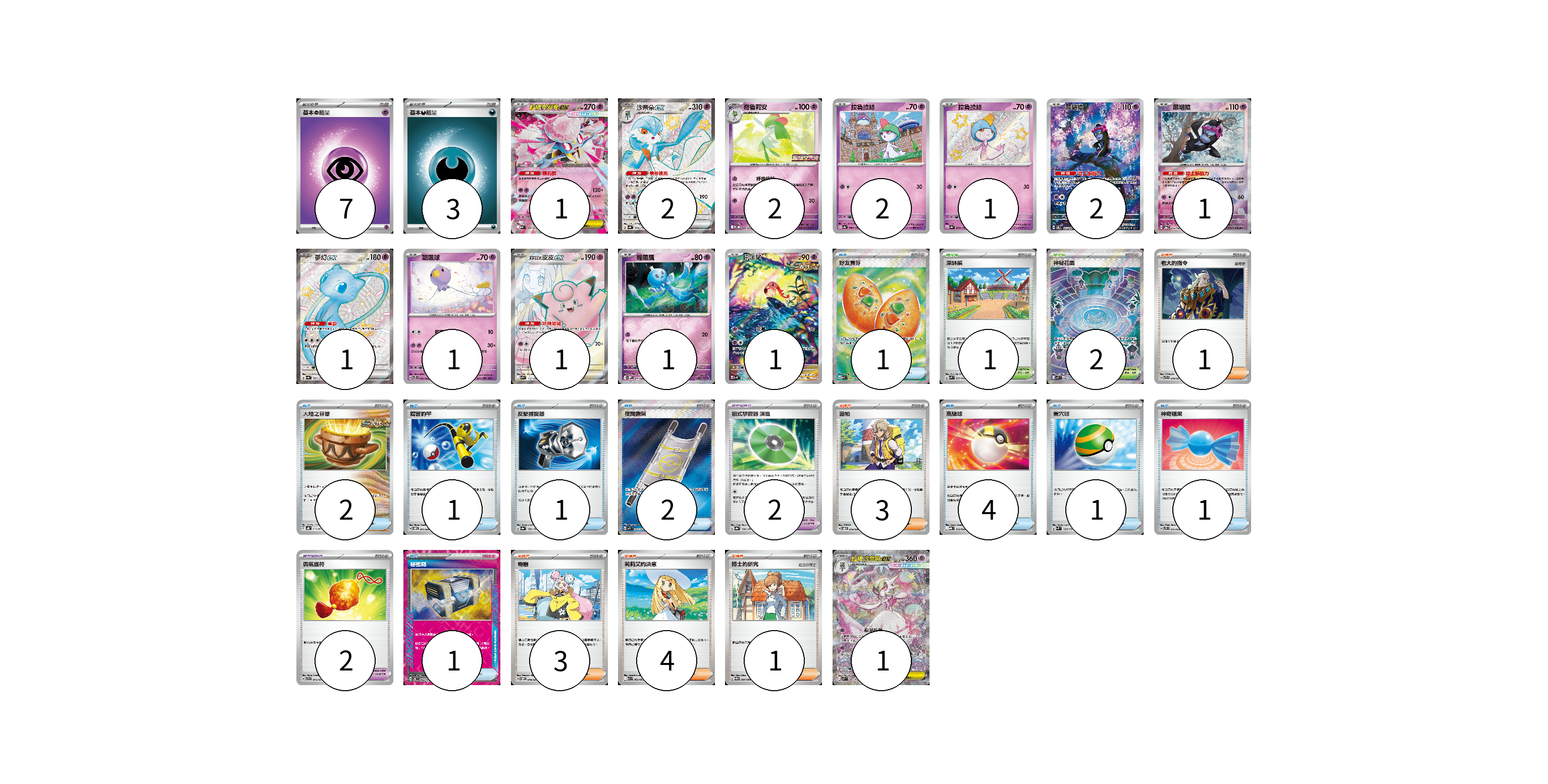 牌組構築方案 以此牌組為基礎新構築牌組 顯示卡面 顯示列表 寶可夢卡(17) 1 2 2 2 1 2 1 1 1 1 1 1 1 寶可夢道具(4) 2 2 物品卡(14) 1 2 1 1 2 4 1 1 1 支援者卡(12) 1 3 3 4 1 競技場卡(3) 1 2 能量卡(10) 7 3 寶可夢卡(17) 卡牌名稱 張數 卡牌名稱 張數 超級蒂安希ex MBD 006/022 01 沙奈朵ex SV4a 328/190 02 奇魯莉安 M-P 006/M-P 02 拉魯拉絲 SV4a 080/190 02 拉魯拉絲 SV4a 258/190 01 願增猿 SV6 107/101 02 願增猿 SV8a 075/187 01 夢幻ex SV4a 327/190 01 飄飄球 SVTS 005/022 01 莉莉艾的皮皮ex SV9 115/100 01 輕飄飄 SV11W 041/086 01 吼叫尾 SV4K 071/066 01 超級沙奈朵ex M1S 087/063 01 寶可夢道具(4) 卡牌名稱 張數 卡牌名稱 張數 招式學習器 演進 SV8a 160/187 02 勇氣護符 SVTR 015/021 02 物品卡(14) 卡牌名稱 張數 卡牌名稱 張數 好友寶芬 M1S 081/063 01 大地之容器 SVHK 011/022 02 厲害釣竿 SVOM 011/021 01 反擊捕捉器 SV8a 139/187 01 夜間擔架 M1L 083/063 02 高級球 MBG 012/022 04 巢穴球 SVM 133/175 01 神奇糖果 SVTS 015/022 01 秘密箱 SV6 092/101 01 支援者卡(12) 卡牌名稱 張數 卡牌名稱 張數 老大的指令 SVTR 019/021 01 派帕 SVOD 018/020 03 奇樹 SVOM 018/021 03 莉莉艾的決意 M1L 062/063 04 博士的研究 SV11B 084/086 01 競技場卡(3) 卡牌名稱 張數 卡牌名稱 張數 深缽鎮 SVK 039/042 01 神秘花園 M1S 086/063 02 能量卡(10) 卡牌名稱 張數 卡牌名稱 張數 基本【超】能量 MBD PSY 07 基本【惡】能量 MBG DAR 03 以此牌組為基礎新構築牌組 牌組編碼 vLJZNC-nYpIqb-cRehkn copy 列印牌組單 牌組編碼已複製 分享至SNS