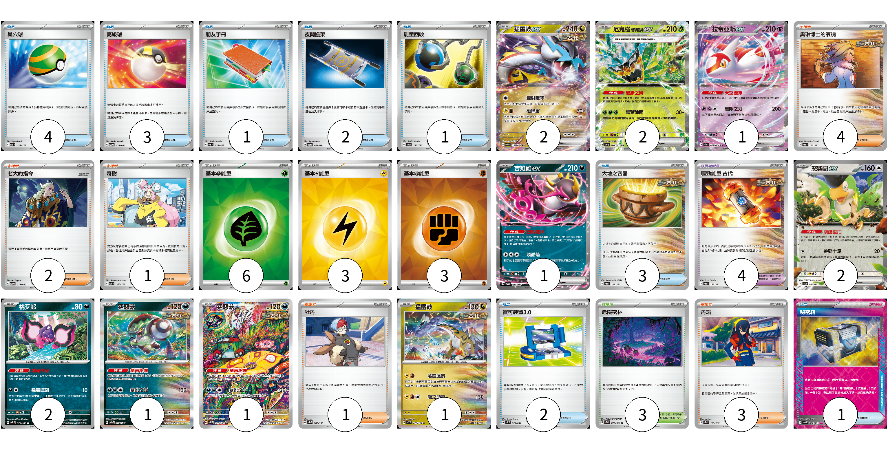 牌組構築方案 以此牌組為基礎新構築牌組 顯示卡面 顯示列表 寶可夢卡(13) 2 2 1 1 2 2 1 1 1 寶可夢道具(4) 4 物品卡(17) 4 3 1 2 1 3 2 1 支援者卡(11) 4 2 1 1 3 競技場卡(3) 3 能量卡(12) 6 3 3 寶可夢卡(13) 卡牌名稱 張數 卡牌名稱 張數 猛雷鼓ex SV5K 053/071 02 厄鬼椪 碧草面具ex SV6 016/101 02 拉帝亞斯ex SV7a 019/064 01 吉雉雞ex SVOD 004/020 01 怒鸚哥ex SVK 006/042 02 桃歹郎 SV8 075/106 02 猛惡菇 SV8a 099/187 01 猛惡菇 SV4K 077/066 01 猛雷鼓 SV7 075/102 01 寶可夢道具(4) 卡牌名稱 張數 卡牌名稱 張數 驅勁能量 古代 SV8a 157/187 04 物品卡(17) 卡牌名稱 張數 卡牌名稱 張數 巢穴球 SVM 133/175 04 高級球 SVOD 012/020 03 朋友手冊 SVK 014/042 01 夜間擔架 SVOM 016/021 02 能量回收 SVM 125/175 01 大地之容器 SV8a 143/187 03 寶可裝置3.0 SVK 021/042 02 秘密箱 SV6 092/101 01 支援者卡(11) 卡牌名稱 張數 卡牌名稱 張數 奧琳博士的氣魄 SV8a 167/187 04 老大的指令 SVOD 019/020 02 奇樹 SVM 160/175 01 牡丹 SV4a 182/190 01 丹瑜 SV8a 170/187 03 競技場卡(3) 卡牌名稱 張數 卡牌名稱 張數 危險密林 SV5K 070/071 03 能量卡(12) 卡牌名稱 張數 卡牌名稱 張數 基本【草】能量 SVK GRA 06 基本【雷】能量 SVK LIG 03 基本【鬥】能量 SVK FIG 03 以此牌組為基礎新構築牌組 牌組編碼 vLPvmW-LQQMUx-ReXzcM copy 列印牌組單 牌組編碼已複製 分享至SNS