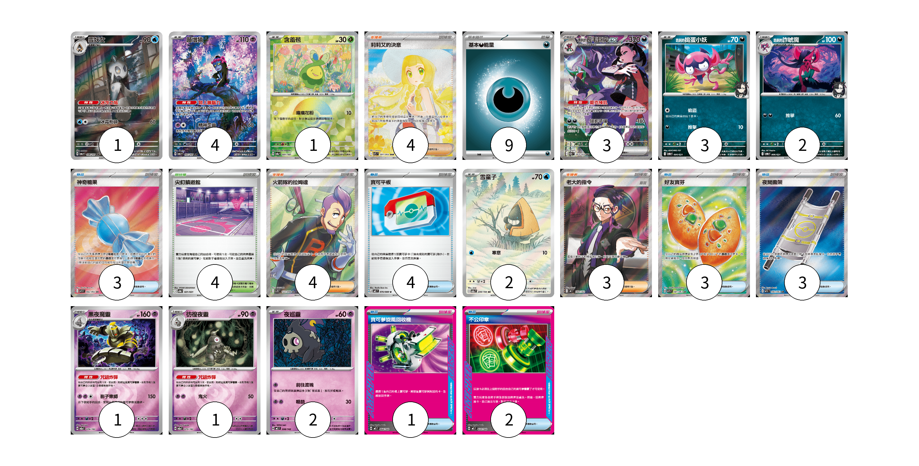 牌組構築方案 以此牌組為基礎新構築牌組 顯示卡面 顯示列表 寶可夢卡(20) 1 4 1 3 3 2 2 1 1 2 物品卡(16) 3 4 3 3 1 2 支援者卡(11) 4 4 3 競技場卡(4) 4 能量卡(9) 9 寶可夢卡(20) 卡牌名稱 張數 卡牌名稱 張數 雪妖女 SV6 104/101 01 願增猿 SV6 107/101 04 含羞苞 SV8a 001/187 01 <瑪俐的>長毛巨魔ex M2a 243/193 03 <瑪俐的>搗蛋小妖 SVOM 005/021 03 <瑪俐的>詐唬魔 SVOM 006/021 02 雪童子 M2a 200/193 02 黑夜魔靈 M2a 074/193 01 彷徨夜靈 M2a 073/193 01 夜巡靈 MC 308/742 02 物品卡(16) 卡牌名稱 張數 卡牌名稱 張數 神奇糖果 M1S 082/063 03 寶可平板 M3 070/080 04 好友寶芬 M1S 081/063 03 夜間擔架 M1L 083/063 03 寶可夢旋風回收機 MC 664/742 01 不公印章 MC 633/742 02 支援者卡(11) 卡牌名稱 張數 卡牌名稱 張數 莉莉艾的決意 M1L 091/063 04 火箭隊的拉姆達 SV10 122/098 04 老大的指令(烏羽) MC 760/742 03 競技場卡(4) 卡牌名稱 張數 卡牌名稱 張數 尖釘鎮道館 SVOM 021/021 04 能量卡(9) 卡牌名稱 張數 卡牌名稱 張數 基本【惡】能量 M-P DAR 09 以此牌組為基礎新構築牌組 牌組編碼 vLkSQC-VLmfmx-zfXVhd copy 列印牌組單 牌組編碼已複製 分享至SNS