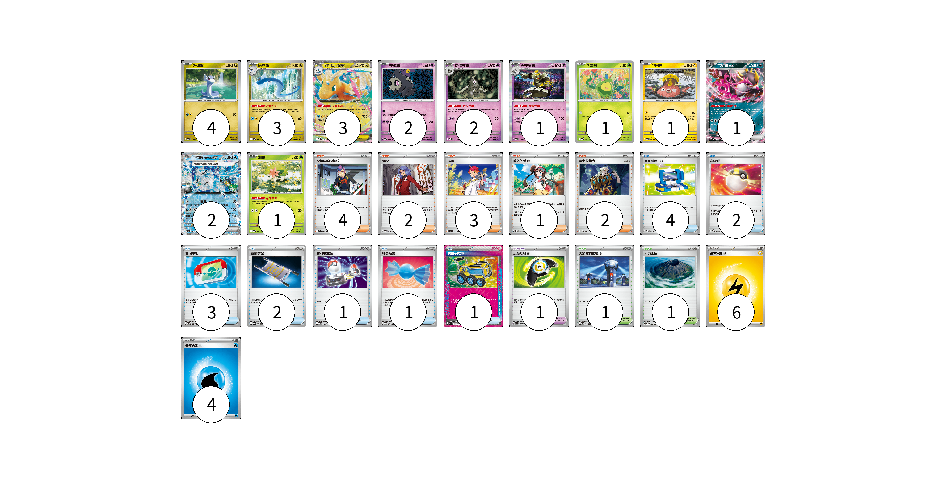牌組構築方案 以此牌組為基礎新構築牌組 顯示卡面 顯示列表 寶可夢卡(21) 4 3 3 2 2 1 1 1 1 2 1 寶可夢道具(1) 1 物品卡(14) 4 2 3 2 1 1 1 支援者卡(12) 4 2 3 1 2 競技場卡(2) 1 1 能量卡(10) 6 4 寶可夢卡(21) 卡牌名稱 張數 卡牌名稱 張數 迷你龍 M2a 124/193 04 哈克龍 M2a 125/193 03 超級快龍ex M2a 126/193 03 夜巡靈 M2a 072/193 02 彷徨夜靈 M2a 073/193 02 黑夜魔靈 M2a 074/193 01 含羞苞 SV8a 001/187 01 泥巴魚 M2a 050/193 01 吉雉雞ex SV6a 038/064 01 厄鬼椪 水井面具ex SV8a 050/187 02 謝米 SV9a 006/063 01 寶可夢道具(1) 卡牌名稱 張數 卡牌名稱 張數 反擊增幅器 SV7a 059/064 01 物品卡(14) 卡牌名稱 張數 卡牌名稱 張數 寶可裝置3.0 MC 660/742 04 高級球 MBG 012/022 02 寶可平板 MC 662/742 03 夜間擔架 SV6a 056/064 02 寶可夢交替 MBG 015/022 01 神奇糖果 MBG 013/022 01 貴重手推車 SVK 020/042 01 支援者卡(12) 卡牌名稱 張數 卡牌名稱 張數 火箭隊的拉姆達 SV10 094/098 04 悟松 SV5a 062/066 02 赤松 SV7 097/102 03 鳴依的勉勵 M3 075/080 01 老大的指令 MBG 021/022 02 競技場卡(2) 卡牌名稱 張數 卡牌名稱 張數 火箭隊的監視塔 SV10 096/098 01 引力山岳 SV8 106/106 01 能量卡(10) 卡牌名稱 張數 卡牌名稱 張數 基本【雷】能量 MC LIG 06 基本【水】能量 MC WAT 04 以此牌組為基礎新構築牌組 牌組編碼 vOyEnr-ZtytBb-BqUcZu copy 列印牌組單 牌組編碼已複製 分享至SNS