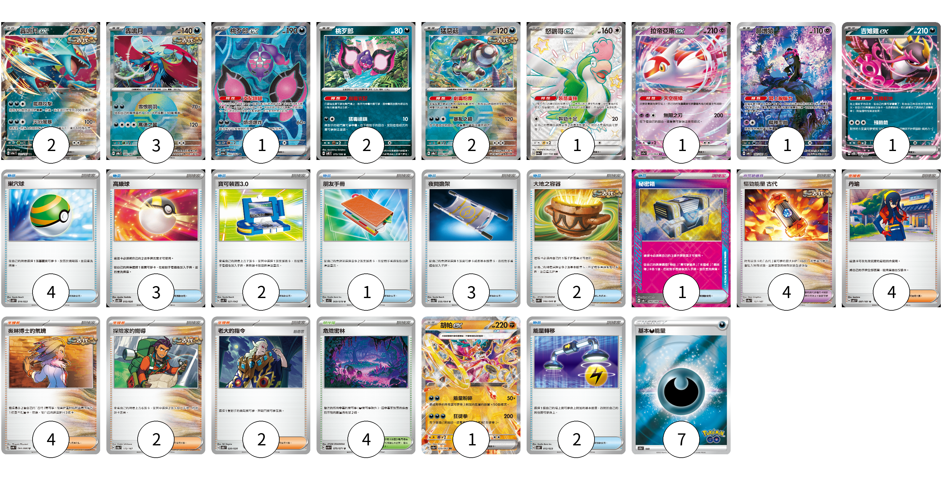 牌組構築方案 以此牌組為基礎新構築牌組 顯示卡面 顯示列表 寶可夢卡(15) 2 3 1 2 2 1 1 1 1 1 寶可夢道具(4) 4 物品卡(18) 4 3 2 1 3 2 1 2 支援者卡(12) 4 4 2 2 競技場卡(4) 4 能量卡(7) 7 寶可夢卡(15) 卡牌名稱 張數 卡牌名稱 張數 轟鳴月ex SV8a 101/187 02 轟鳴月 SV8a 100/187 03 桃歹郎ex SV6a 082/064 01 桃歹郎 SV8 075/106 02 猛惡菇 SV8a 099/187 02 怒鸚哥ex SV4a 337/190 01 拉帝亞斯ex SV7a 019/064 01 願增猿 SV6 107/101 01 吉雉雞ex SVOD 004/020 01 胡帕ex SV3a 029/062 01 寶可夢道具(4) 卡牌名稱 張數 卡牌名稱 張數 驅勁能量 古代 SV8a 157/187 04 物品卡(18) 卡牌名稱 張數 卡牌名稱 張數 巢穴球 SVAW 014/023 04 高級球 SVOD 012/020 03 寶可裝置3.0 SVK 021/042 02 朋友手冊 SV1S 069/078 01 夜間擔架 SV6a 056/064 03 大地之容器 SV4K 060/066 02 秘密箱 SV6 092/101 01 能量轉移 SVAM 012/023 02 支援者卡(12) 卡牌名稱 張數 卡牌名稱 張數 丹瑜 SV6 097/101 04 奧琳博士的氣魄 SV4K 064/066 04 探險家的嚮導 SV8a 172/187 02 老大的指令 SVEM 020/020 02 競技場卡(4) 卡牌名稱 張數 卡牌名稱 張數 危險密林 SV5K 070/071 04 能量卡(7) 卡牌名稱 張數 卡牌名稱 張數 基本惡能量 S10b DAR 07 以此牌組為基礎新構築牌組 牌組編碼 vRLTri-WZIFFO-TgTLxN copy 列印牌組單 牌組編碼已複製 分享至SNS