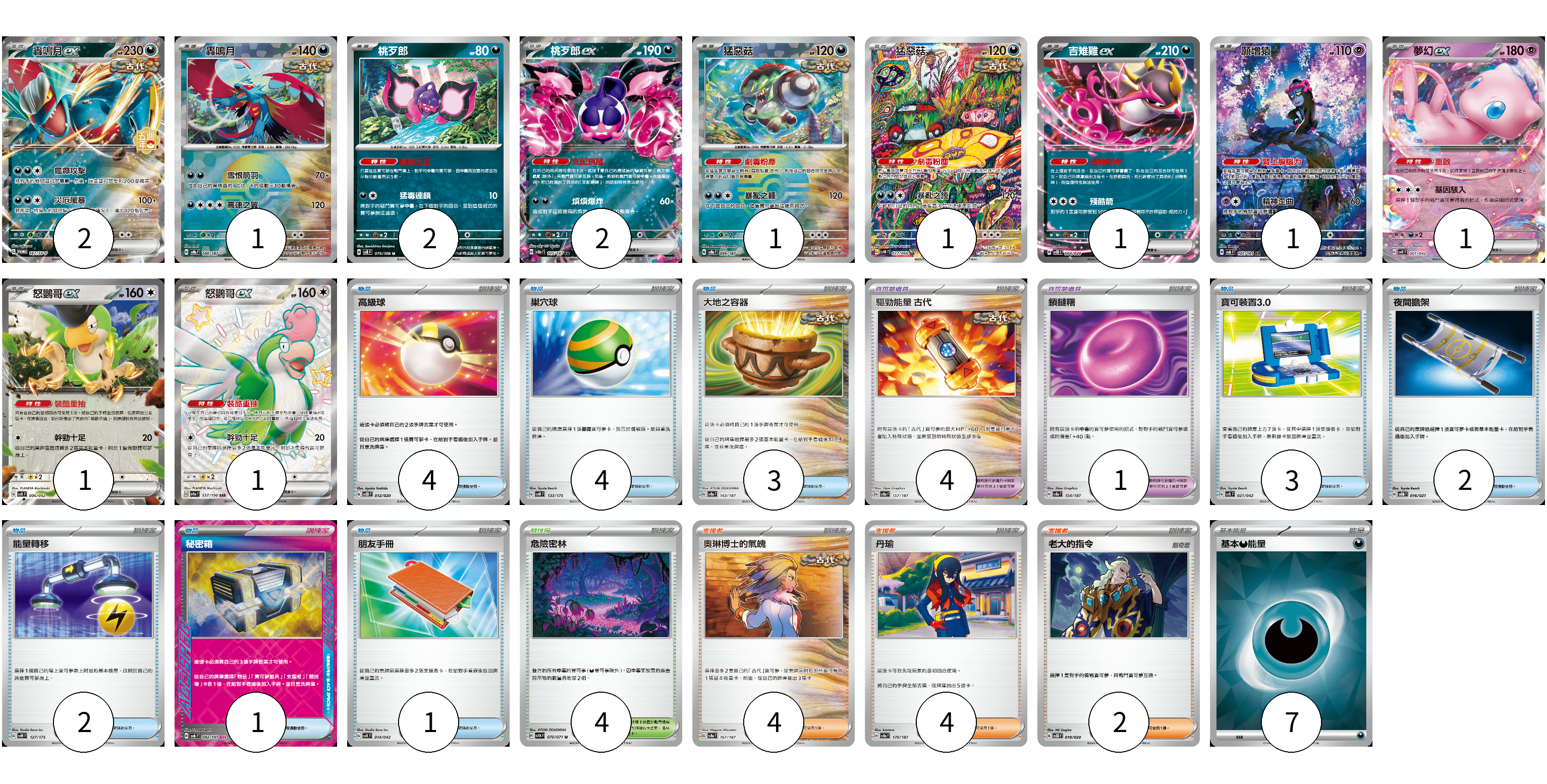 牌組構築方案 以此牌組為基礎新構築牌組 顯示卡面 顯示列表 寶可夢卡(14) 2 1 2 2 1 1 1 1 1 1 1 寶可夢道具(5) 4 1 物品卡(20) 4 4 3 3 2 2 1 1 支援者卡(10) 4 4 2 競技場卡(4) 4 能量卡(7) 7 寶可夢卡(14) 卡牌名稱 張數 卡牌名稱 張數 轟鳴月ex SV-P 167/SV-P 02 轟鳴月 SV8a 100/187 01 桃歹郎 SV8 075/106 02 桃歹郎ex SV8a 105/187 02 猛惡菇 SV8a 099/187 01 猛惡菇 SV4K 077/066 01 吉雉雞ex SVOD 004/020 01 願增猿 SV6 107/101 01 夢幻ex SVK 001/042 01 怒鸚哥ex SVK 006/042 01 怒鸚哥ex SV4a 337/190 01 寶可夢道具(5) 卡牌名稱 張數 卡牌名稱 張數 驅勁能量 古代 SV8a 157/187 04 鎖鏈糬 SV8a 154/187 01 物品卡(20) 卡牌名稱 張數 卡牌名稱 張數 高級球 SVOD 012/020 04 巢穴球 SVM 133/175 04 大地之容器 SV8a 143/187 03 寶可裝置3.0 SVK 021/042 03 夜間擔架 SVOM 016/021 02 能量轉移 SVM 127/175 02 秘密箱 SV6 092/101 01 朋友手冊 SVK 014/042 01 支援者卡(10) 卡牌名稱 張數 卡牌名稱 張數 奧琳博士的氣魄 SV8a 167/187 04 丹瑜 SV8a 170/187 04 老大的指令 SVOD 019/020 02 競技場卡(4) 卡牌名稱 張數 卡牌名稱 張數 危險密林 SV5K 070/071 04 能量卡(7) 卡牌名稱 張數 卡牌名稱 張數 基本【惡】能量 SVM DAR 07 以此牌組為基礎新構築牌組 牌組編碼 vTjlsv-skqaXv-jfkYcy copy 列印牌組單 牌組編碼已複製 分享至SNS