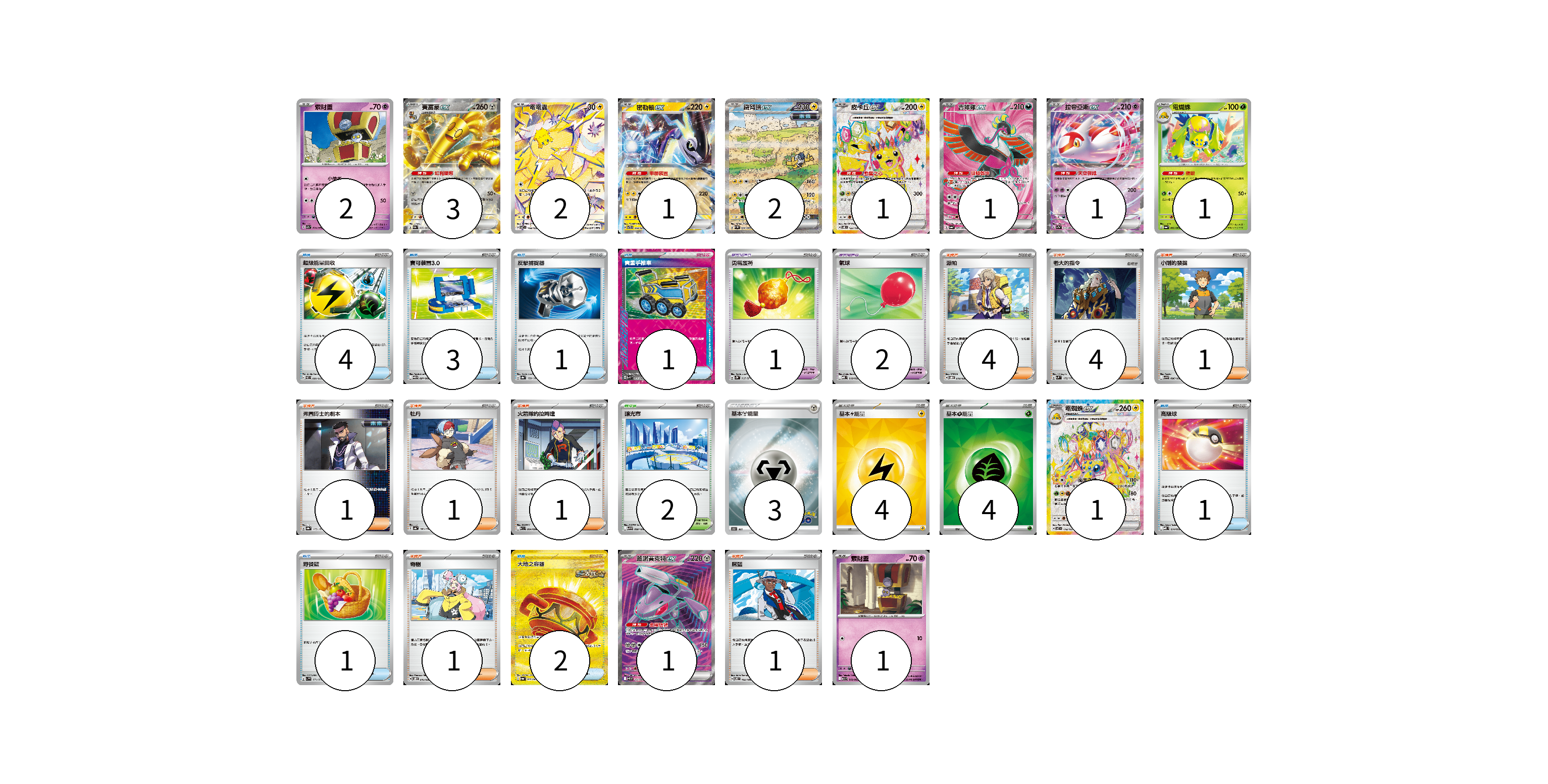 牌組構築方案 以此牌組為基礎新構築牌組 顯示卡面 顯示列表 寶可夢卡(17) 2 3 2 1 2 1 1 1 1 1 1 1 寶可夢道具(3) 1 2 物品卡(13) 4 3 1 1 1 1 2 支援者卡(14) 4 4 1 1 1 1 1 1 競技場卡(2) 2 能量卡(11) 3 4 4 寶可夢卡(17) 卡牌名稱 張數 卡牌名稱 張數 索財靈 SV7a 024/064 02 賽富豪ex SV3a 050/062 03 電電蟲 SV7 108/102 02 密勒頓ex SVTR 008/021 01 鐵臂膀ex SV4M 088/066 02 皮卡丘ex SV8 122/106 01 吉雉雞ex SV6a 081/064 01 拉帝亞斯ex SV7a 019/064 01 電蜘蛛 SV6a 002/064 01 電蜘蛛ex SV7 118/102 01 蓋諾賽克特ex SV11B 164/086 01 索財靈 M1L 019/063 01 寶可夢道具(3) 卡牌名稱 張數 卡牌名稱 張數 勇氣護符 SV2D 067/071 01 氣球 MBD 018/022 02 物品卡(13) 卡牌名稱 張數 卡牌名稱 張數 超級能量回收 SVEL 009/020 04 寶可裝置3.0 SV11B 081/086 03 反擊捕捉器 SV8a 139/187 01 貴重手推車 SVK 020/042 01 高級球 MBD 014/022 01 野餐籃 SV1V 071/078 01 大地之容器 SV6a 093/064 02 支援者卡(14) 卡牌名稱 張數 卡牌名稱 張數 派帕 SVOD 018/020 04 老大的指令 SVM 172/175 04 小剛的發掘 SV9 096/100 01 弗圖博士的劇本 SV8a 175/187 01 牡丹 SV4a 182/190 01 火箭隊的拉姆達 SV10 094/098 01 奇樹 SVOD 016/020 01 席藍 SV8 102/106 01 競技場卡(2) 卡牌名稱 張數 卡牌名稱 張數 釀光市 SV9 098/100 02 能量卡(11) 卡牌名稱 張數 卡牌名稱 張數 基本鋼能量 S10b MET 03 基本【雷】能量 SVQP LIG 04 基本【草】能量 SVK GRA 04 以此牌組為基礎新構築牌組 牌組編碼 vVtboI-JJbhsN-pKKPtz copy 列印牌組單 牌組編碼已複製 分享至SNS