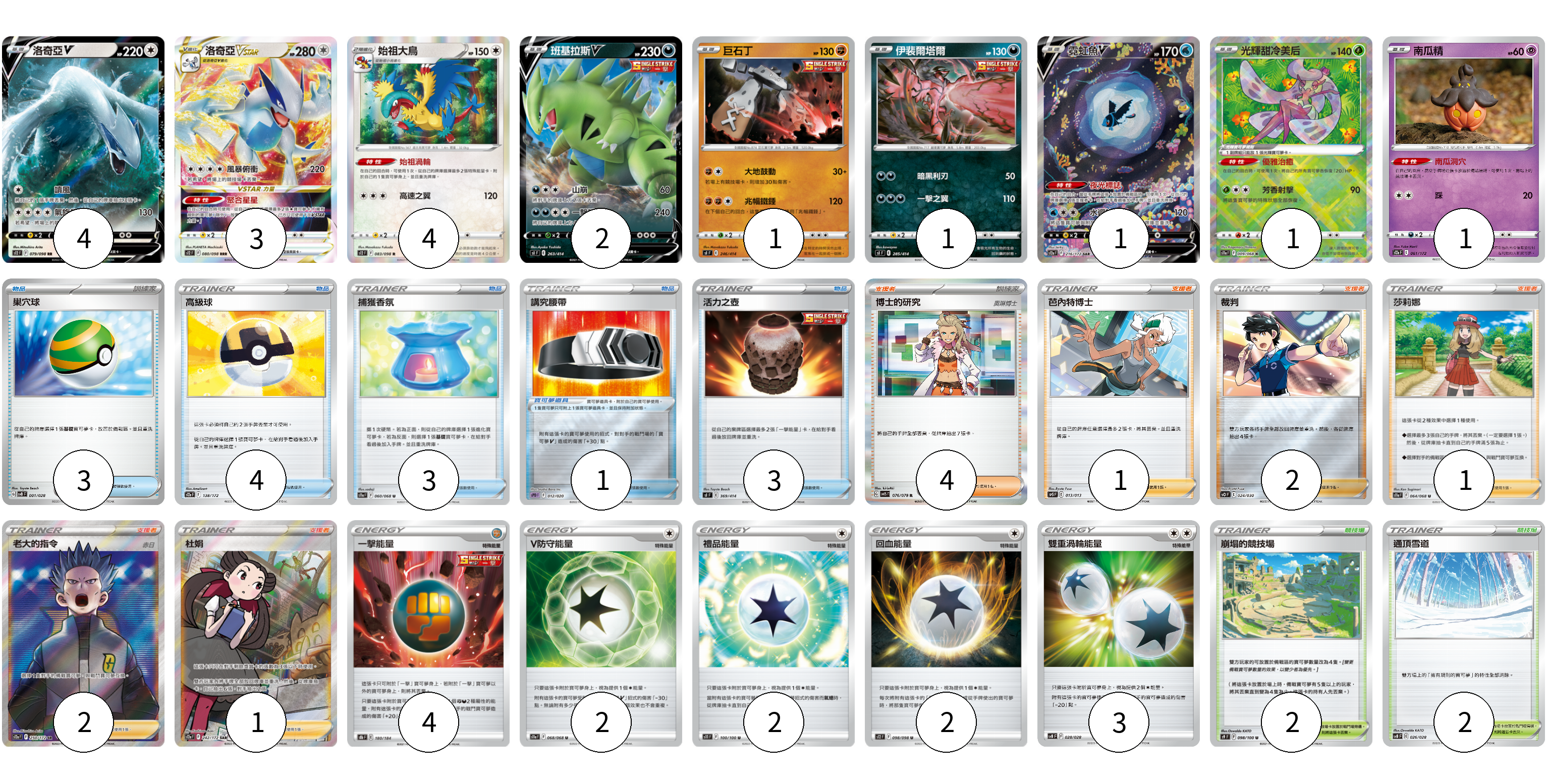 牌組構築方案 以此牌組為基礎新構築牌組 顯示卡面 顯示列表 寶可夢卡(18) 4 3 4 2 1 1 1 1 1 寶可夢道具(1) 1 物品卡(13) 3 4 3 3 支援者卡(11) 4 1 2 1 2 1 競技場卡(4) 2 2 能量卡(13) 4 2 2 2 3 寶可夢卡(18) 卡牌名稱 張數 卡牌名稱 張數 洛奇亞V S12 079/098 04 洛奇亞VSTAR S12 080/098 03 始祖大鳥 S12 083/098 04 班基拉斯V SI 263/414 02 巨石丁 SI 246/414 01 伊裴爾塔爾 SI 285/414 01 霓虹魚V S12a 216/172 01 光輝甜冷美后 S11a 009/068 01 南瓜精 S12a 061/172 01 寶可夢道具(1) 卡牌名稱 張數 卡牌名稱 張數 講究腰帶 SPD 012/020 01 物品卡(13) 卡牌名稱 張數 卡牌名稱 張數 巢穴球 SVB 001/028 03 高級球 S12a 138/172 04 捕獲香氛 S11a 060/068 03 活力之壺 SI 369/414 03 支援者卡(11) 卡牌名稱 張數 卡牌名稱 張數 博士的研究(奧琳博士) SV1S 076/078 04 芭內特博士 SP5 013/013 01 裁判 SO 024/030 02 莎莉娜 S11a 064/068 01 老大的指令(赤日) S12a 250/172 02 杜娟 S12a 242/172 01 競技場卡(4) 卡牌名稱 張數 卡牌名稱 張數 崩塌的競技場 S9 098/100 02 通頂雪道 SVB 026/028 02 能量卡(13) 卡牌名稱 張數 卡牌名稱 張數 一擊能量 S8b 180/184 04 V防守能量 S11a 068/068 02 禮品能量 S11 100/100 02 回血能量 S12 098/098 02 雙重渦輪能量 SVB 028/028 03 以此牌組為基礎新構築牌組 牌組編碼 vYOwDJ-bGNbth-cVRzXb copy 列印牌組單 牌組編碼已複製 分享至SNS