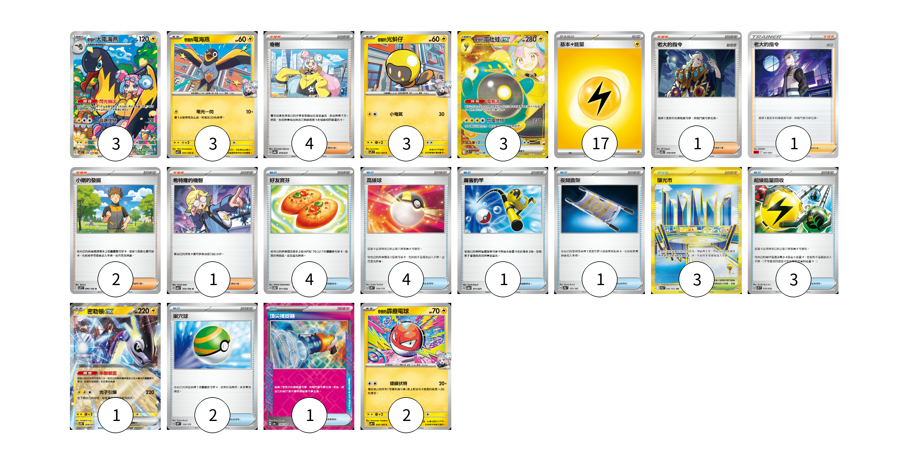 牌組構築方案 以此牌組為基礎新構築牌組 顯示卡面 顯示列表 寶可夢卡(15) 3 3 3 3 1 2 物品卡(16) 4 4 1 1 3 2 1 支援者卡(9) 4 1 1 2 1 競技場卡(3) 3 能量卡(17) 17 寶可夢卡(15) 卡牌名稱 張數 卡牌名稱 張數 奇樹的大電海燕 SV9 104/100 03 奇樹的電海燕 SV9 031/100 03 奇樹的光蚪仔 SV9 029/100 03 奇樹的電肚蛙ex SV9 130/100 03 密勒頓ex SVTR 008/021 01 奇樹的霹靂電球 SV9 026/100 02 物品卡(16) 卡牌名稱 張數 卡牌名稱 張數 好友寶芬 SVTM 011/022 04 高級球 SVM 134/175 04 厲害釣竿 SVOM 011/021 01 夜間擔架 SV8a 151/187 01 超級能量回收 SVK 010/042 03 巢穴球 SVM 133/175 02 頂尖捕捉器 SV8a 148/187 01 支援者卡(9) 卡牌名稱 張數 卡牌名稱 張數 奇樹 SVOM 018/021 04 老大的指令 SVTG 019/019 01 老大的指令(赤日) SDL 021/021 01 小剛的發掘 SV9 096/100 02 希特隆的機智 SV8 103/106 01 競技場卡(3) 卡牌名稱 張數 卡牌名稱 張數 釀光市 SV9a 092/063 03 能量卡(17) 卡牌名稱 張數 卡牌名稱 張數 基本【雷】能量 SVB LIG 17 以此牌組為基礎新構築牌組 牌組編碼 vYtlAC-ePTeKj-MPSlsq copy 列印牌組單 牌組編碼已複製 分享至SNS