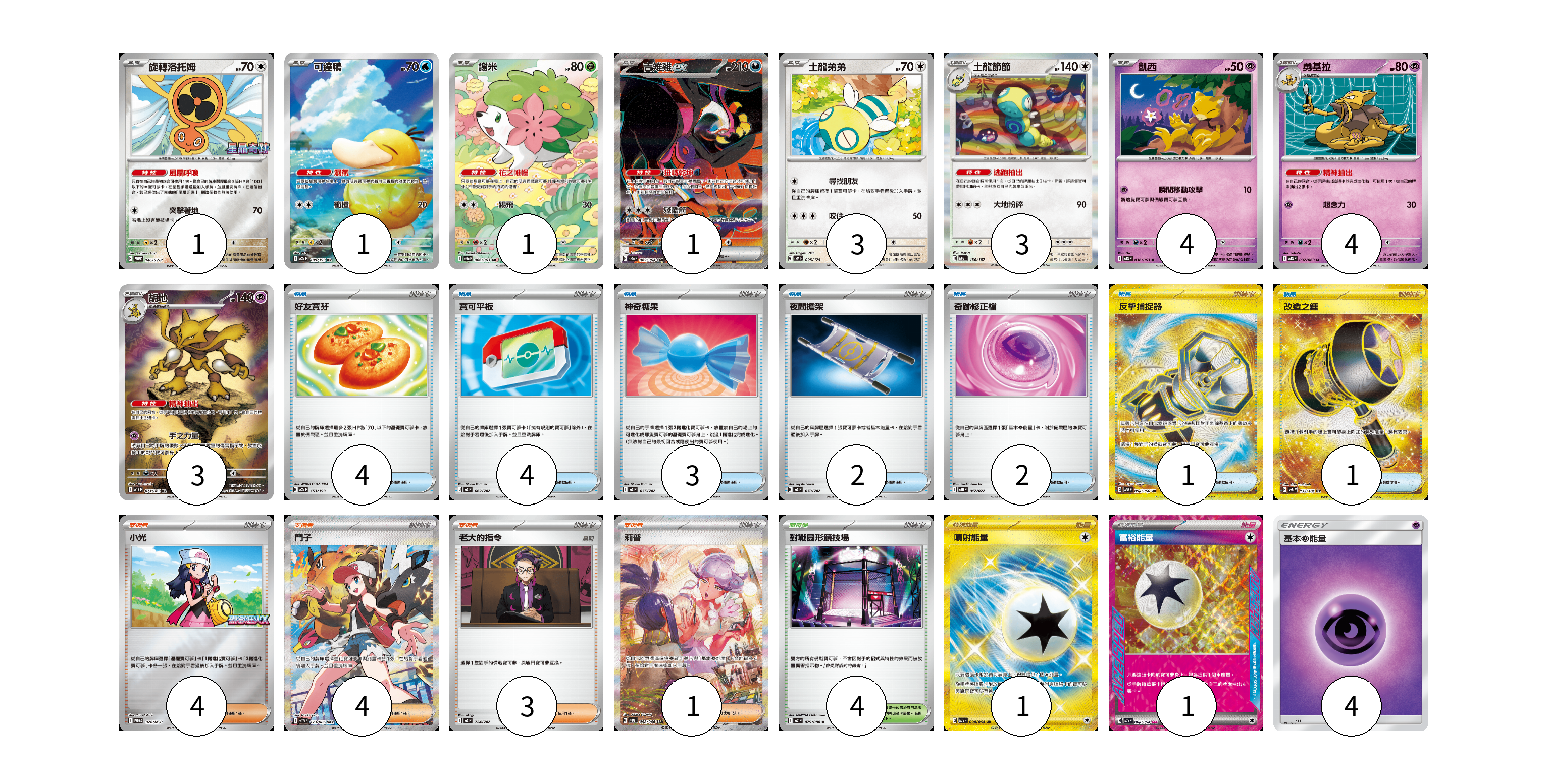 牌組構築方案 以此牌組為基礎新構築牌組 顯示卡面 顯示列表 寶可夢卡(21) 1 1 1 1 3 3 4 4 3 物品卡(17) 4 4 3 2 2 1 1 支援者卡(12) 4 4 3 1 競技場卡(4) 4 能量卡(6) 1 1 4 寶可夢卡(21) 卡牌名稱 張數 卡牌名稱 張數 旋轉洛托姆 SV-P 146/SV-P 01 可達鴨 M2a 199/193 01 謝米 SV9a 066/063 01 吉雉雞ex SV6a 089/064 01 土龍弟弟 SVM 095/175 03 土龍節節 SV8a 130/187 03 凱西 M1S 036/063 04 勇基拉 M1S 037/063 04 胡地 M1S 071/063 03 物品卡(17) 卡牌名稱 張數 卡牌名稱 張數 好友寶芬 M2a 153/193 04 寶可平板 MC 662/742 04 神奇糖果 MC 655/742 03 夜間擔架 MC 670/742 02 奇跡修正檔 MBD 017/022 02 反擊捕捉器 SV4M 094/066 01 改造之錘 SV6 132/101 01 支援者卡(12) 卡牌名稱 張數 卡牌名稱 張數 小光 M-P 028/M-P 04 鬥子 SV11W 173/086 04 老大的指令 MC 724/742 03 莉普 SV4M 092/066 01 競技場卡(4) 卡牌名稱 張數 卡牌名稱 張數 對戰圓形競技場 M2 079/080 04 能量卡(6) 卡牌名稱 張數 卡牌名稱 張數 噴射能量 SV7a 094/064 01 富裕能量 SV7a 064/064 01 基本超能量 AS6D PSY 04 以此牌組為基礎新構築牌組 牌組編碼 vZXKPG-oNEIjv-ppGBdE copy 列印牌組單 牌組編碼已複製 分享至SNS
