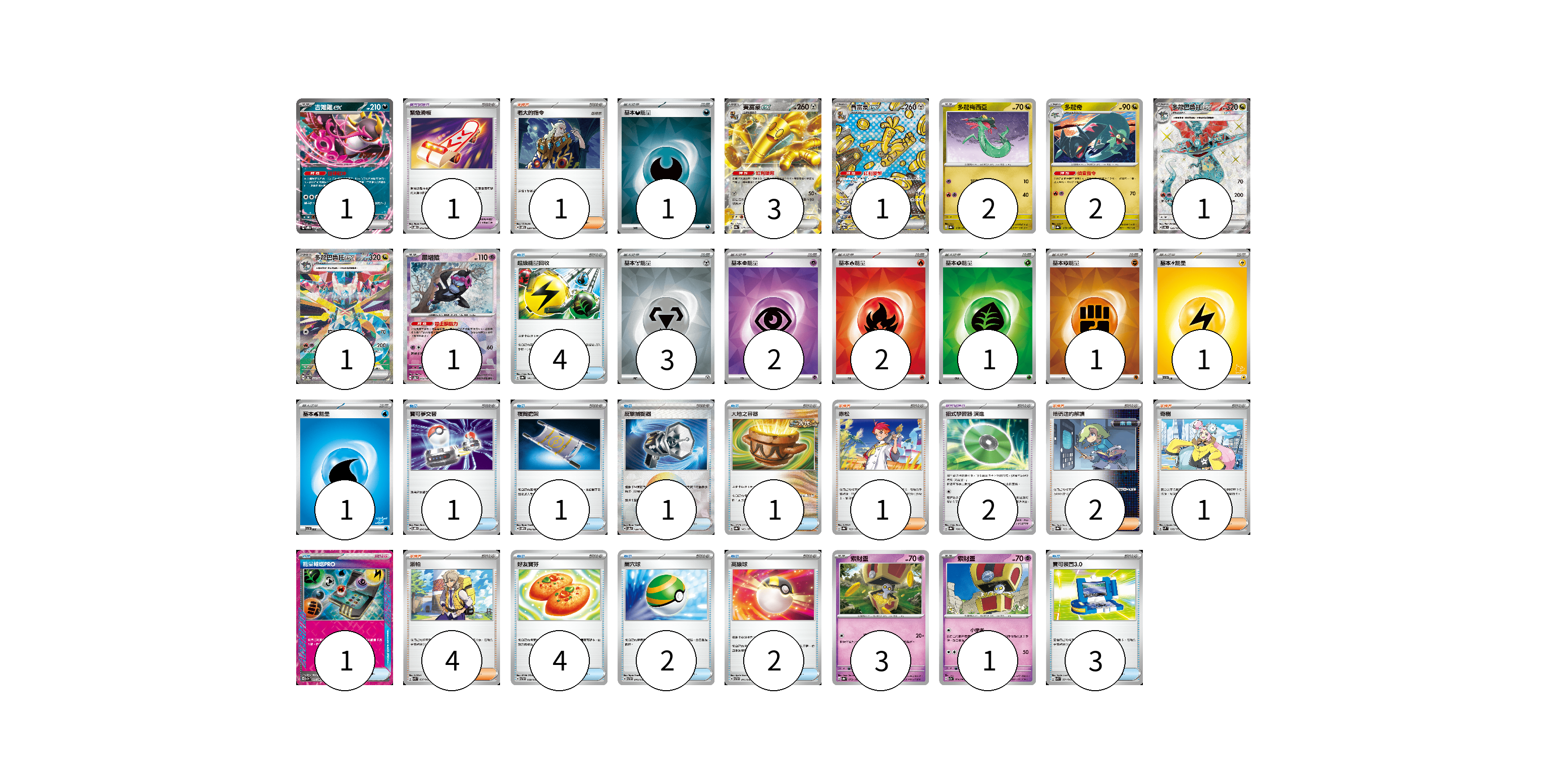 牌組構築方案 以此牌組為基礎新構築牌組 顯示卡面 顯示列表 寶可夢卡(16) 1 3 1 2 2 1 1 1 3 1 寶可夢道具(3) 1 2 物品卡(20) 4 1 1 1 1 1 4 2 2 3 支援者卡(9) 1 1 2 1 4 能量卡(12) 1 3 2 2 1 1 1 1 寶可夢卡(16) 卡牌名稱 張數 卡牌名稱 張數 吉雉雞ex SVOD 004/020 01 賽富豪ex SV8a 117/187 03 賽富豪ex SV8a 220/187 01 多龍梅西亞 SV8a 118/187 02 多龍奇 SV8a 119/187 02 多龍巴魯托ex SV6 120/101 01 多龍巴魯托ex SV8a 221/187 01 願增猿 SV8a 075/187 01 索財靈 SV8a 073/187 03 索財靈 SV7a 024/064 01 寶可夢道具(3) 卡牌名稱 張數 卡牌名稱 張數 緊急滑板 SVOD 015/020 01 招式學習器 演進 SV8a 160/187 02 物品卡(20) 卡牌名稱 張數 卡牌名稱 張數 超級能量回收 SV8a 141/187 04 寶可夢交替 SVOD 014/020 01 夜間擔架 SVOM 016/021 01 反擊捕捉器 SV8a 139/187 01 大地之容器 SV8a 143/187 01 能量輸送PRO SV7a 052/064 01 好友寶芬 SVTH 009/018 04 巢穴球 SVTH 010/018 02 高級球 SVTH 011/018 02 寶可裝置3.0 SVK 021/042 03 支援者卡(9) 卡牌名稱 張數 卡牌名稱 張數 老大的指令 SVOM 020/021 01 赤松 SV8a 163/187 01 暗碼迷的解讀 SV8a 165/187 02 奇樹 SVM 160/175 01 派帕 SVK 035/042 04 能量卡(12) 卡牌名稱 張數 卡牌名稱 張數 基本【惡】能量 SVOM DAR 01 基本【鋼】能量 SVOD MET 03 基本【超】能量 SVOD PSY 02 基本【火】能量 SVK FIR 02 基本【草】能量 SVK GRA 01 基本【鬥】能量 SVK FIG 01 基本【雷】能量 SVI LIG 01 基本【水】能量 SVI WAT 01 以此牌組為基礎新構築牌組 牌組編碼 vcVTQQ-amzFMt-QFxwVI copy 列印牌組單 牌組編碼已複製 分享至SNS