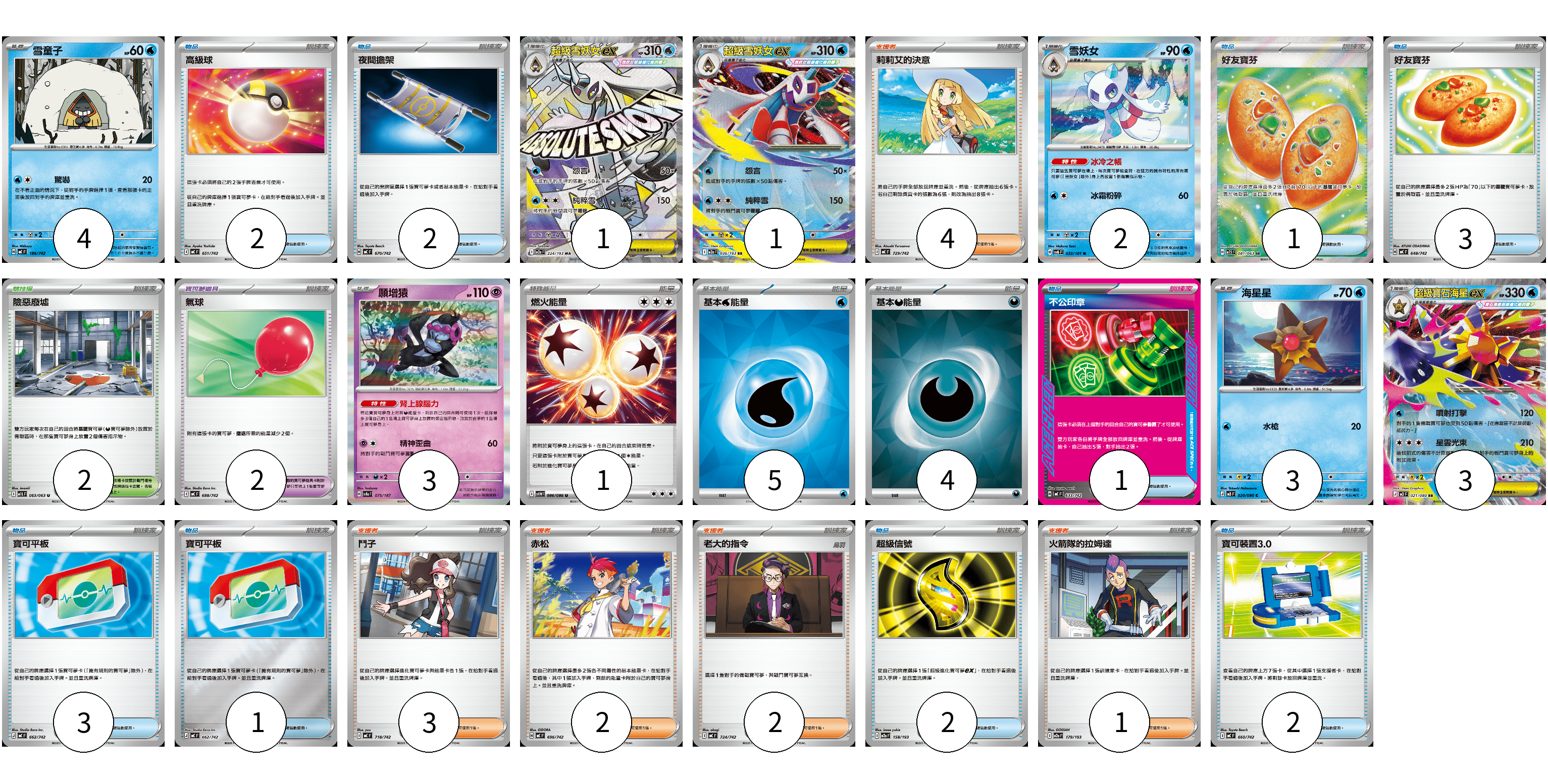 牌組構築方案 以此牌組為基礎新構築牌組 顯示卡面 顯示列表 寶可夢卡(17) 4 1 1 2 3 3 3 寶可夢道具(2) 2 物品卡(17) 2 2 1 3 1 3 1 2 2 支援者卡(12) 4 3 2 2 1 競技場卡(2) 2 能量卡(10) 1 5 4 寶可夢卡(17) 卡牌名稱 張數 卡牌名稱 張數 雪童子 MC 186/742 04 超級雪妖女ex M2a 224/193 01 超級雪妖女ex M2a 036/193 01 雪妖女 SV6 033/101 02 願增猿 SV8a 075/187 03 海星星 M3 020/080 03 超級寶石海星ex M3 021/080 03 寶可夢道具(2) 卡牌名稱 張數 卡牌名稱 張數 氣球 MC 688/742 02 物品卡(17) 卡牌名稱 張數 卡牌名稱 張數 高級球 MC 651/742 02 夜間擔架 MC 670/742 02 好友寶芬 M1S 081/063 01 好友寶芬 MC 648/742 03 不公印章 MC 633/742 01 寶可平板 MC 662/742 03 寶可平板 MC 662/742 01 超級信號 M2a 158/193 02 寶可裝置3.0 MC 660/742 02 支援者卡(12) 卡牌名稱 張數 卡牌名稱 張數 莉莉艾的決意 MC 729/742 04 鬥子 MC 718/742 03 赤松 MC 696/742 02 老大的指令 MC 724/742 02 火箭隊的拉姆達 M2a 179/193 01 競技場卡(2) 卡牌名稱 張數 卡牌名稱 張數 險惡廢墟 M1L 063/063 02 能量卡(10) 卡牌名稱 張數 卡牌名稱 張數 燃火能量 SV11W 086/086 01 基本【水】能量 SVM WAT 05 基本【惡】能量 SVM DAR 04 以此牌組為基礎新構築牌組 牌組編碼 vdjMEh-jjptDZ-jlcApV copy 列印牌組單 牌組編碼已複製 分享至SNS
