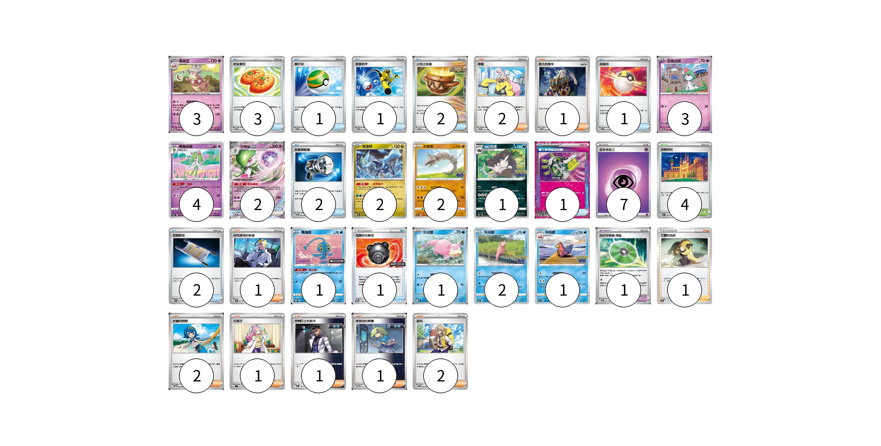 牌組構築方案 以此牌組為基礎新構築牌組 顯示卡面 顯示列表 寶可夢卡(22) 3 3 4 2 2 2 1 1 1 2 1 寶可夢道具(1) 1 物品卡(14) 3 1 1 2 1 2 1 2 1 支援者卡(12) 2 1 1 1 2 1 1 1 2 競技場卡(4) 4 能量卡(7) 7 寶可夢卡(22) 卡牌名稱 張數 卡牌名稱 張數 呆呆王 SV7 039/102 03 拉魯拉絲 SVTS 002/022 03 奇魯莉安 SVTS 003/022 04 沙奈朵ex SVTS 004/022 02 酋雷姆 SV6a 047/064 02 大岩蛇 S10b 036/071 02 阿羅拉 拉達 S10b 042/071 01 瑪納霏 SV-P 135/SV-P 01 呆呆獸 SV4a 036/190 01 呆呆獸 S10b 019/071 02 呆殼獸 S10b 020/071 01 寶可夢道具(1) 卡牌名稱 張數 卡牌名稱 張數 招式學習器 演進 SVTL 017/021 01 物品卡(14) 卡牌名稱 張數 卡牌名稱 張數 好友寶芬 SVTG 011/019 03 巢穴球 SVTG 012/019 01 厲害釣竿 SVTG 009/019 01 大地之容器 SVTG 010/019 02 高級球 SVTR 014/021 01 反擊捕捉器 SVTS 009/022 02 寶可夢旋風回收機 SV6 093/101 01 夜間擔架 SV6a 056/064 02 洗翠的沉重球 SV-P 138/SV-P 01 支援者卡(12) 卡牌名稱 張數 卡牌名稱 張數 奇樹 SVTG 017/019 02 老大的指令 SVTG 019/019 01 阿克羅瑪的執著 SV6a 059/064 01 竹蘭的霸氣 S12a 153/172 01 水蓮的照顧 SV5a 064/066 02 米莫莎 SV1V 077/078 01 弗圖博士的劇本 SVHM 021/022 01 暗碼迷的解讀 SV5M 067/071 01 派帕 SVTL 020/021 02 競技場卡(4) 卡牌名稱 張數 卡牌名稱 張數 夜間學院 SV6a 064/064 04 能量卡(7) 卡牌名稱 張數 卡牌名稱 張數 基本【超】能量 SVTS PSY 07 以此牌組為基礎新構築牌組 牌組編碼 vfGqMx-HPXQWK-amMiVu copy 列印牌組單 牌組編碼已複製 分享至SNS