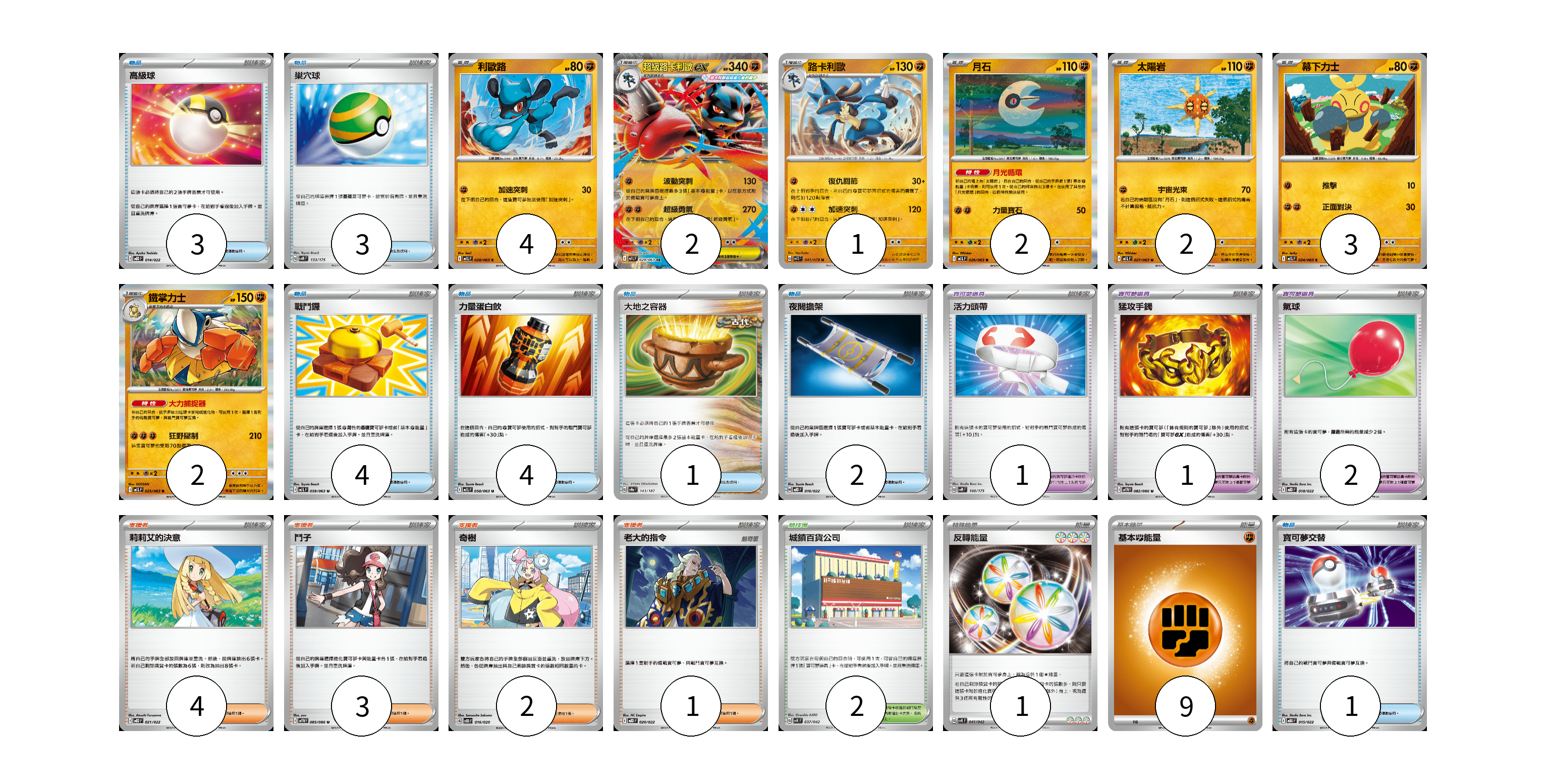 牌組構築方案 以此牌組為基礎新構築牌組 顯示卡面 顯示列表 寶可夢卡(16) 4 2 1 2 2 3 2 寶可夢道具(4) 1 1 2 物品卡(18) 3 3 4 4 1 2 1 支援者卡(10) 4 3 2 1 競技場卡(2) 2 能量卡(10) 1 9 寶可夢卡(16) 卡牌名稱 張數 卡牌名稱 張數 利歐路 M1L 028/063 04 超級路卡利歐ex M1L 029/063 02 路卡利歐 SV1S 041/078 01 月石 M1L 026/063 02 太陽岩 M1L 027/063 02 幕下力士 M1L 024/063 03 鐵掌力士 M1L 025/063 02 寶可夢道具(4) 卡牌名稱 張數 卡牌名稱 張數 活力頭帶 SVM 140/175 01 猛攻手鐲 SV11W 082/086 01 氣球 MBD 018/022 02 物品卡(18) 卡牌名稱 張數 卡牌名稱 張數 高級球 MBD 014/022 03 巢穴球 SVM 133/175 03 戰鬥鑼 M1L 059/063 04 力量蛋白飲 M1L 058/063 04 大地之容器 SV8a 143/187 01 夜間擔架 MBD 016/022 02 寶可夢交替 MBG 015/022 01 支援者卡(10) 卡牌名稱 張數 卡牌名稱 張數 莉莉艾的決意 MBD 021/022 04 鬥子 SV11W 085/086 03 奇樹 SVOD 016/020 02 老大的指令 MBD 020/022 01 競技場卡(2) 卡牌名稱 張數 卡牌名稱 張數 城鎮百貨公司 SVK 037/042 02 能量卡(10) 卡牌名稱 張數 卡牌名稱 張數 反轉能量 SVK 041/042 01 基本【鬥】能量 M-P FIG 09 以此牌組為基礎新構築牌組 牌組編碼 vhrsgZ-olWMQE-DuxhCe copy 列印牌組單 牌組編碼已複製 分享至SNS