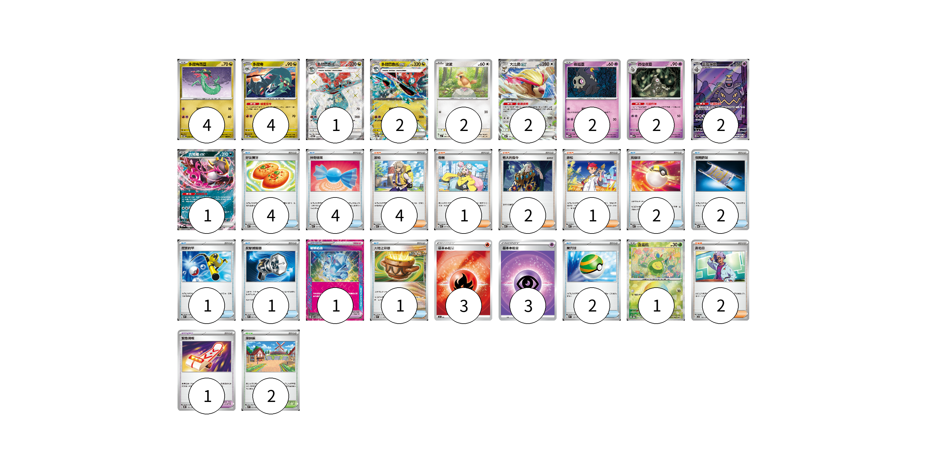 牌組構築方案 以此牌組為基礎新構築牌組 顯示卡面 顯示列表 寶可夢卡(23) 4 4 1 2 2 2 2 2 2 1 1 寶可夢道具(2) 1 1 物品卡(17) 4 4 2 2 1 1 1 2 支援者卡(10) 4 1 2 1 2 競技場卡(2) 2 能量卡(6) 3 3 寶可夢卡(23) 卡牌名稱 張數 卡牌名稱 張數 多龍梅西亞 SV6 079/101 04 多龍奇 SV6 080/101 04 多龍巴魯托ex SV6 120/101 01 多龍巴魯托ex SV6 081/101 02 波波 SV3 087/108 02 大比鳥ex SV4a 139/190 02 夜巡靈 SV6a 018/064 02 彷徨夜靈 SV6a 019/064 02 黑夜魔靈 SV6a 070/064 02 吉雉雞ex SV6a 038/064 01 含羞苞 SV8a 001/187 01 寶可夢道具(2) 卡牌名稱 張數 卡牌名稱 張數 璀璨結晶 SV7 094/102 01 緊急滑板 SV8a 153/187 01 物品卡(17) 卡牌名稱 張數 卡牌名稱 張數 好友寶芬 SVK 015/042 04 神奇糖果 SVK 019/042 04 高級球 SVK 018/042 02 夜間擔架 SV6a 056/064 02 厲害釣竿 SVK 011/042 01 反擊捕捉器 SVK 009/042 01 大地之容器 SVK 012/042 01 巢穴球 SVM 133/175 02 支援者卡(10) 卡牌名稱 張數 卡牌名稱 張數 派帕 SVK 035/042 04 奇樹 SVK 031/042 01 老大的指令 SVK 036/042 02 赤松 SVK 027/042 01 吉尼亞 SVD 129/139 02 競技場卡(2) 卡牌名稱 張數 卡牌名稱 張數 深缽鎮 SVK 039/042 02 能量卡(6) 卡牌名稱 張數 卡牌名稱 張數 基本【火】能量 SO FIR 03 基本【超】能量 SI PSY 03 以此牌組為基礎新構築牌組 牌組編碼 viFhtV-bMGeEL-GLOKBt copy 列印牌組單 牌組編碼已複製 分享至SNS