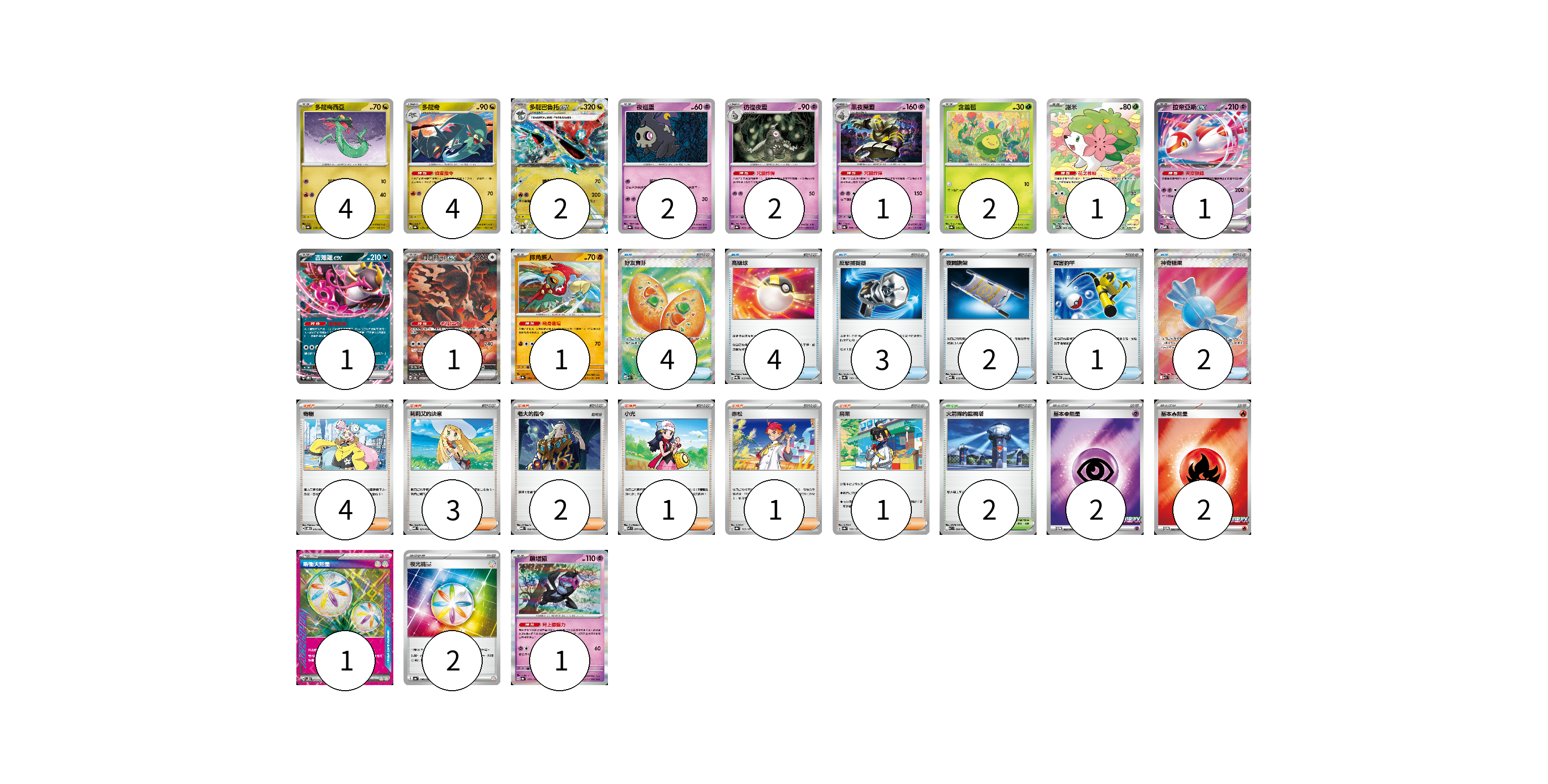 牌組構築方案 以此牌組為基礎新構築牌組 顯示卡面 顯示列表 寶可夢卡(23) 4 4 2 2 2 1 2 1 1 1 1 1 1 物品卡(16) 4 4 3 2 1 2 支援者卡(12) 4 3 2 1 1 1 競技場卡(2) 2 能量卡(7) 2 2 1 2 寶可夢卡(23) 卡牌名稱 張數 卡牌名稱 張數 多龍梅西亞 SV8a 118/187 04 多龍奇 SV8a 119/187 04 多龍巴魯托ex SV8a 120/187 02 夜巡靈 SV8a 064/187 02 彷徨夜靈 SV8a 065/187 02 黑夜魔靈 SV8a 066/187 01 含羞苞 SV8a 001/187 02 謝米 SV9a 066/063 01 拉帝亞斯ex MBD 003/022 01 吉雉雞ex SVOD 004/020 01 月月熊 赫月ex SV8a 225/187 01 摔角鷹人 SV8a 084/187 01 願增猿 SV8a 075/187 01 物品卡(16) 卡牌名稱 張數 卡牌名稱 張數 好友寶芬 M1S 081/063 04 高級球 SVQL 015/022 04 反擊捕捉器 SV8a 139/187 03 夜間擔架 MBD 016/022 02 厲害釣竿 SVOD 010/020 01 神奇糖果 M1S 082/063 02 支援者卡(12) 卡牌名稱 張數 卡牌名稱 張數 奇樹 SVOD 016/020 04 莉莉艾的決意 MBD 021/022 03 老大的指令 MBD 020/022 02 小光 M2 077/080 01 赤松 SV8a 163/187 01 烏栗 SV8a 169/187 01 競技場卡(2) 卡牌名稱 張數 卡牌名稱 張數 火箭隊的監視塔 SV10 096/098 02 能量卡(7) 卡牌名稱 張數 卡牌名稱 張數 基本【超】能量 M-P 033/M-P 02 基本【火】能量 M-P 032/M-P 02 新衝天能量 SV5K 071/071 01 夜光能量 SV4a 190/190 02 以此牌組為基礎新構築牌組 牌組編碼 vicGmm-BgbwMy-znZkJt copy 列印牌組單 牌組編碼已複製 分享至SNS