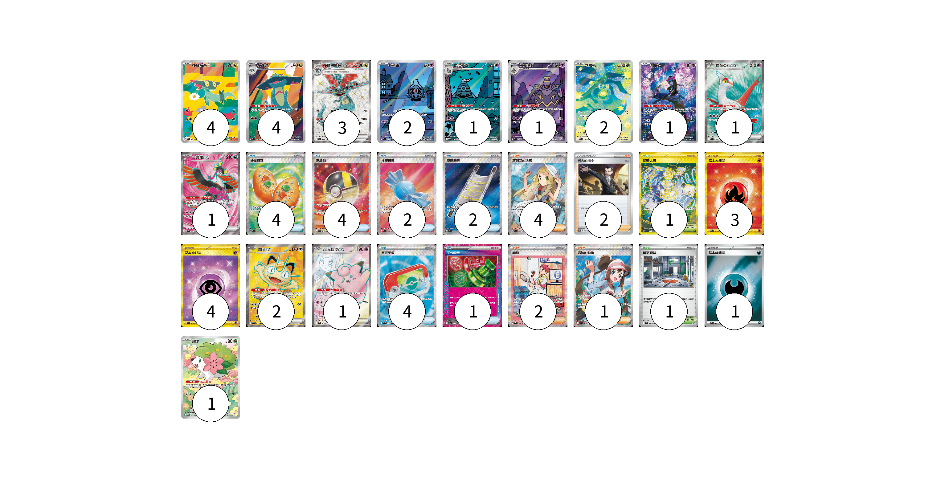 牌組構築方案 以此牌組為基礎新構築牌組 顯示卡面 顯示列表 寶可夢卡(24) 4 4 3 2 1 1 2 1 1 1 2 1 1 物品卡(17) 4 4 2 2 4 1 支援者卡(9) 4 2 2 1 競技場卡(2) 1 1 能量卡(8) 3 4 1 寶可夢卡(24) 卡牌名稱 張數 卡牌名稱 張數 多龍梅西亞 M2a 211/193 04 多龍奇 M2a 212/193 04 多龍巴魯托ex SV6 120/101 03 夜巡靈 SV6a 068/064 02 彷徨夜靈 SV6a 069/064 01 黑夜魔靈 SV6a 070/064 01 含羞苞 M2a 196/193 02 願增猿 SV6 107/101 01 拉帝亞斯ex SV7a 078/064 01 吉雉雞ex SV6a 081/064 01 喵喵ex M3 100/080 02 莉莉艾的皮皮ex SV9 115/100 01 謝米 SV9a 066/063 01 物品卡(17) 卡牌名稱 張數 卡牌名稱 張數 好友寶芬 M1S 081/063 04 高級球 M2a 216/193 04 神奇糖果 M1S 082/063 02 夜間擔架 M1L 083/063 02 寶可平板 M3 103/080 04 不公印章 SV5a 053/066 01 支援者卡(9) 卡牌名稱 張數 卡牌名稱 張數 莉莉艾的決意 M1L 086/063 04 老大的指令(坂木) SC1D 161/164 02 赤松 SV8a 227/187 02 鳴依的勉勵 M3 107/080 01 競技場卡(2) 卡牌名稱 張數 卡牌名稱 張數 阻礙之塔 SV10 132/098 01 險惡廢墟 M1L 063/063 01 能量卡(8) 卡牌名稱 張數 卡牌名稱 張數 基本【火】能量 SV3 141/108 03 基本【超】能量 SV2a 210/165 04 基本【惡】能量 MC DAR 01 以此牌組為基礎新構築牌組 牌組編碼 vjLoez-nwmwpA-mqNMtA copy 列印牌組單 牌組編碼已複製 分享至SNS
