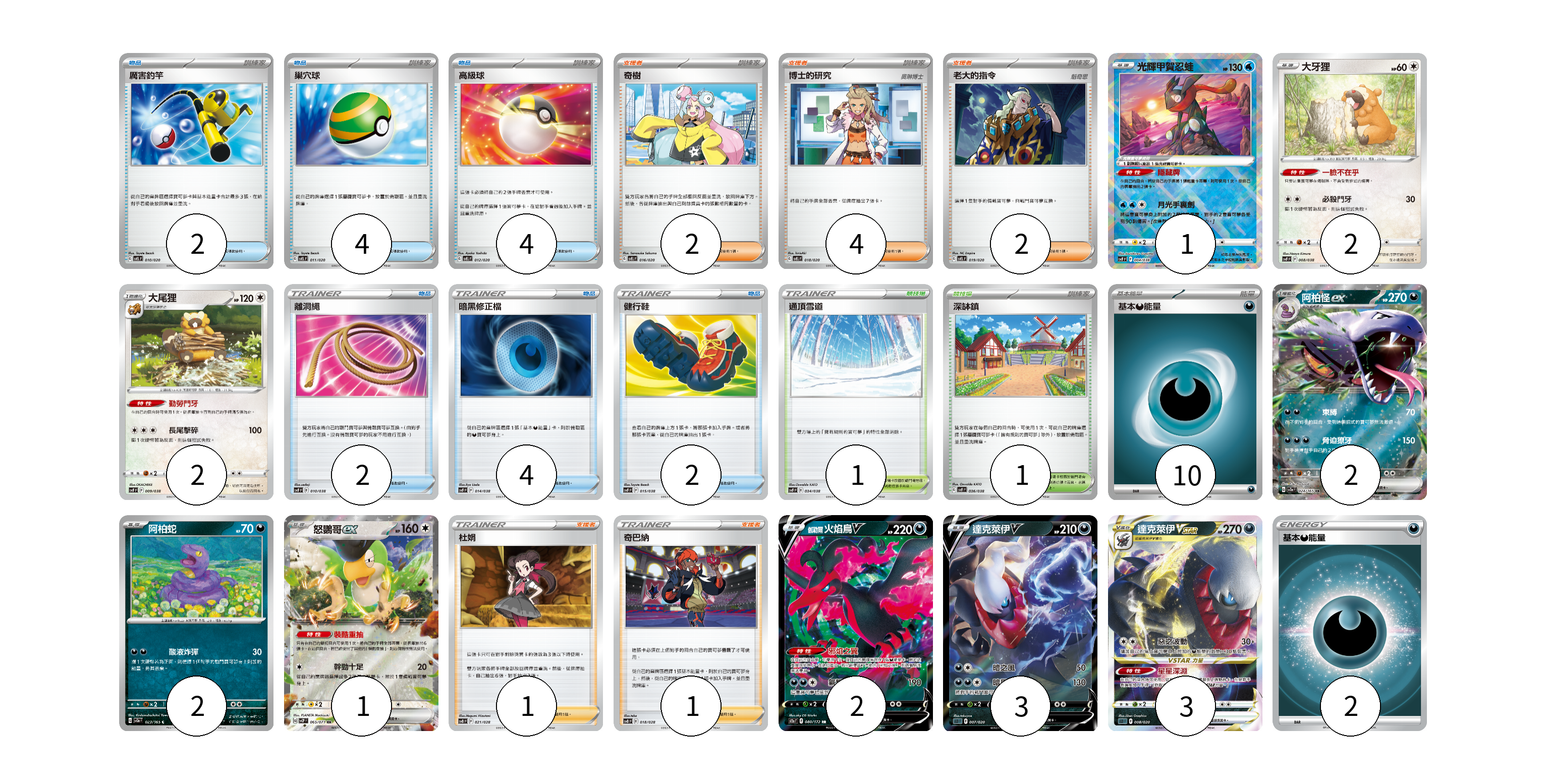 牌組構築方案 以此牌組為基礎新構築牌組 顯示卡面 顯示列表 寶可夢卡(20) 2 1 2 2 2 2 1 2 3 3 物品卡(16) 4 4 2 4 2 支援者卡(10) 2 4 2 1 1 競技場卡(2) 1 1 能量卡(12) 10 2 寶可夢卡(20) 卡牌名稱 張數 卡牌名稱 張數 厲害釣竿 SVEL 010/020 02 光輝甲賀忍蛙 SVF 004/038 01 大牙狸 SVF 008/038 02 大尾狸 SVF 009/038 02 阿柏怪ex SV2a 024/165 02 阿柏蛇 SV2a 023/165 02 怒鸚哥ex SV2P 065/071 01 伽勒爾 火焰鳥V S12a 080/172 02 達克萊伊V SLD 007/020 03 達克萊伊VSTAR SLD 008/020 03 物品卡(16) 卡牌名稱 張數 卡牌名稱 張數 巢穴球 SVEL 011/020 04 高級球 SVEL 012/020 04 離洞繩 SVF 010/038 02 暗黑修正檔 SVF 014/038 04 健行鞋 SVF 015/038 02 支援者卡(10) 卡牌名稱 張數 卡牌名稱 張數 奇樹 SVEL 016/020 02 博士的研究 SVEL 018/020 04 老大的指令 SVEL 019/020 02 杜娟 SVB 021/028 01 奇巴納 SVB 018/028 01 競技場卡(2) 卡牌名稱 張數 卡牌名稱 張數 通頂雪道 SVF 034/038 01 深缽鎮 SVF 036/038 01 能量卡(12) 卡牌名稱 張數 卡牌名稱 張數 基本【惡】能量 SVF DAR 10 基本惡能量 SLD DAR 02 以此牌組為基礎新構築牌組 牌組編碼 vjkZux-IjeExA-bRKDLG copy 列印牌組單 牌組編碼已複製 分享至SNS