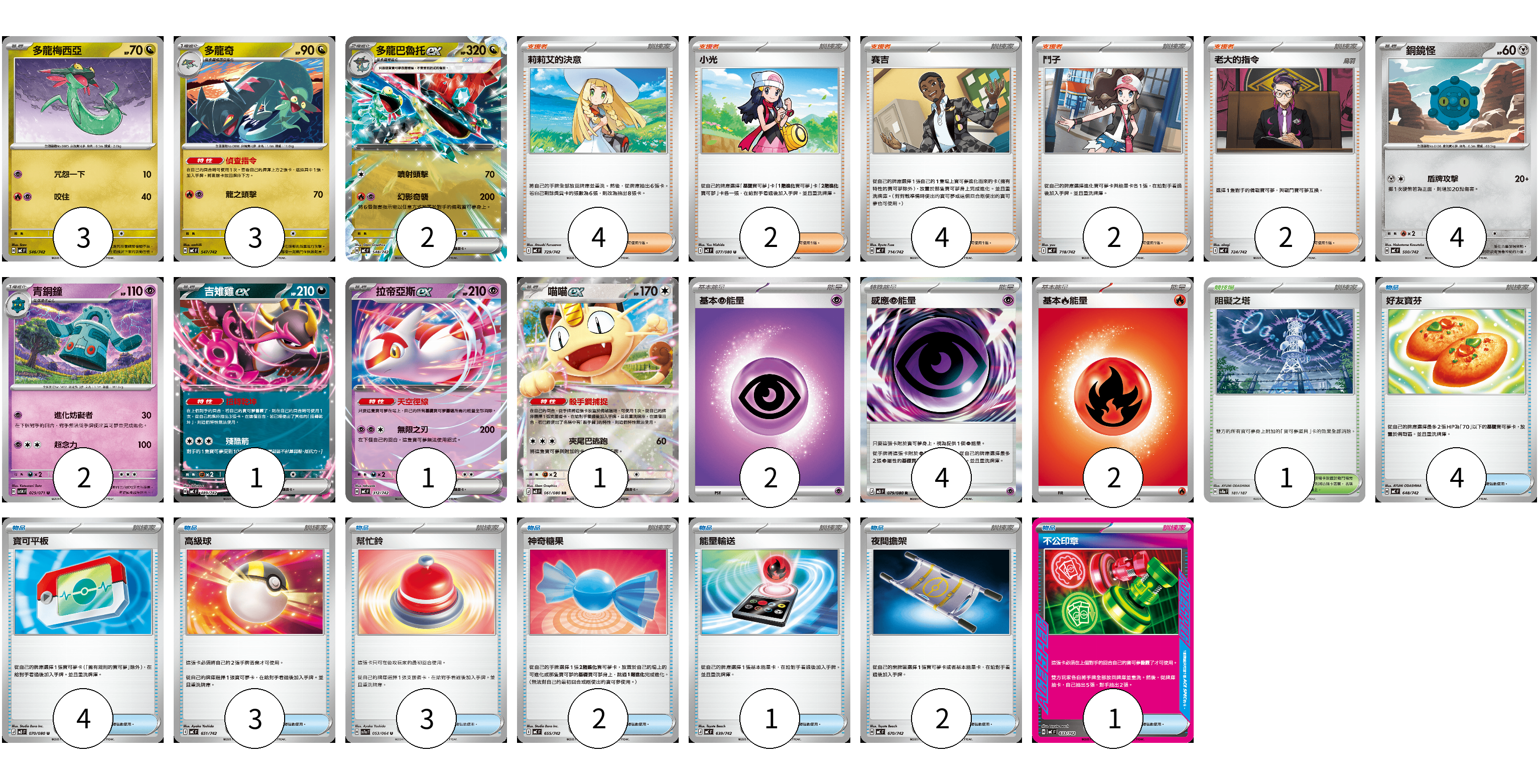 牌組構築方案 以此牌組為基礎新構築牌組 顯示卡面 顯示列表 寶可夢卡(17) 3 3 2 4 2 1 1 1 物品卡(20) 4 4 3 3 2 1 2 1 支援者卡(14) 4 2 4 2 2 競技場卡(1) 1 能量卡(8) 2 4 2 寶可夢卡(17) 卡牌名稱 張數 卡牌名稱 張數 多龍梅西亞 MC 546/742 03 多龍奇 MC 547/742 03 多龍巴魯托ex MC 548/742 02 銅鏡怪 MC 500/742 04 青銅鐘 SV5K 029/071 02 吉雉雞ex MC 489/742 01 拉帝亞斯ex MC 312/742 01 喵喵ex M3 061/080 01 物品卡(20) 卡牌名稱 張數 卡牌名稱 張數 好友寶芬 MC 648/742 04 寶可平板 M3 070/080 04 高級球 MC 651/742 03 幫忙鈴 SV7a 053/064 03 神奇糖果 MC 655/742 02 能量輸送 MC 639/742 01 夜間擔架 MC 670/742 02 不公印章 MC 633/742 01 支援者卡(14) 卡牌名稱 張數 卡牌名稱 張數 莉莉艾的決意 MC 729/742 04 小光 M2 077/080 02 賽吉 MC 714/742 04 鬥子 MC 718/742 02 老大的指令 MC 724/742 02 競技場卡(1) 卡牌名稱 張數 卡牌名稱 張數 阻礙之塔 SV8a 181/187 01 能量卡(8) 卡牌名稱 張數 卡牌名稱 張數 基本【超】能量 MC PSY 02 感應【超】能量 M3 079/080 04 基本【火】能量 MC FIR 02 以此牌組為基礎新構築牌組 牌組編碼 vnKvLm-bNhGJG-HaomvN copy 列印牌組單 牌組編碼已複製 分享至SNS