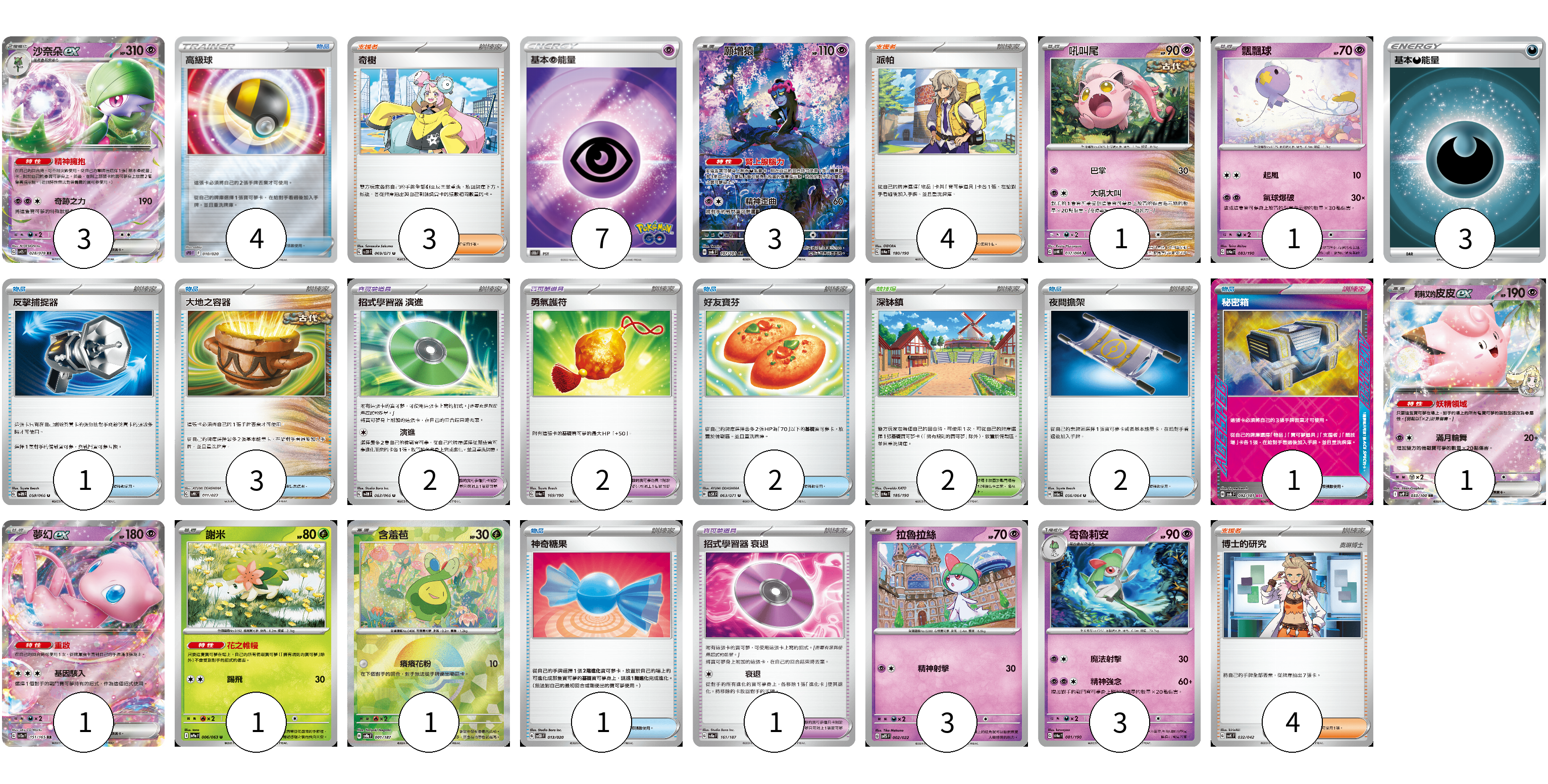 牌組構築方案 以此牌組為基礎新構築牌組 顯示卡面 顯示列表 寶可夢卡(18) 3 3 1 1 1 1 1 1 3 3 寶可夢道具(5) 2 2 1 物品卡(14) 4 1 3 2 2 1 1 支援者卡(11) 3 4 4 競技場卡(2) 2 能量卡(10) 7 3 寶可夢卡(18) 卡牌名稱 張數 卡牌名稱 張數 沙奈朵ex SV1S 028/078 03 願增猿 SV6 107/101 03 吼叫尾 SV4K 032/066 01 飄飄球 SV4a 083/190 01 莉莉艾的皮皮ex SV9 033/100 01 夢幻ex SV2a 151/165 01 謝米 SV9a 006/063 01 含羞苞 SV8a 001/187 01 拉魯拉絲 SVTS 002/022 03 奇魯莉安 SV4a 081/190 03 寶可夢道具(5) 卡牌名稱 張數 卡牌名稱 張數 招式學習器 演進 SV4M 063/066 02 勇氣護符 SV4a 169/190 02 招式學習器 衰退 SV8a 161/187 01 物品卡(14) 卡牌名稱 張數 卡牌名稱 張數 高級球 SPD 010/020 04 反擊捕捉器 SV4M 059/066 01 大地之容器 SVHK 011/022 03 好友寶芬 SV5K 063/071 02 夜間擔架 SV6a 056/064 02 秘密箱 SV6 092/101 01 神奇糖果 SVOD 013/020 01 支援者卡(11) 卡牌名稱 張數 卡牌名稱 張數 奇樹 SV2D 069/071 03 派帕 SV4a 180/190 04 博士的研究 SVK 032/042 04 競技場卡(2) 卡牌名稱 張數 卡牌名稱 張數 深缽鎮 SV4a 185/190 02 能量卡(10) 卡牌名稱 張數 卡牌名稱 張數 基本超能量 S10b PSY 07 基本惡能量 SLD DAR 03 以此牌組為基礎新構築牌組 牌組編碼 vnzxPu-wRcnRi-zKqUdK copy 列印牌組單 牌組編碼已複製 分享至SNS
