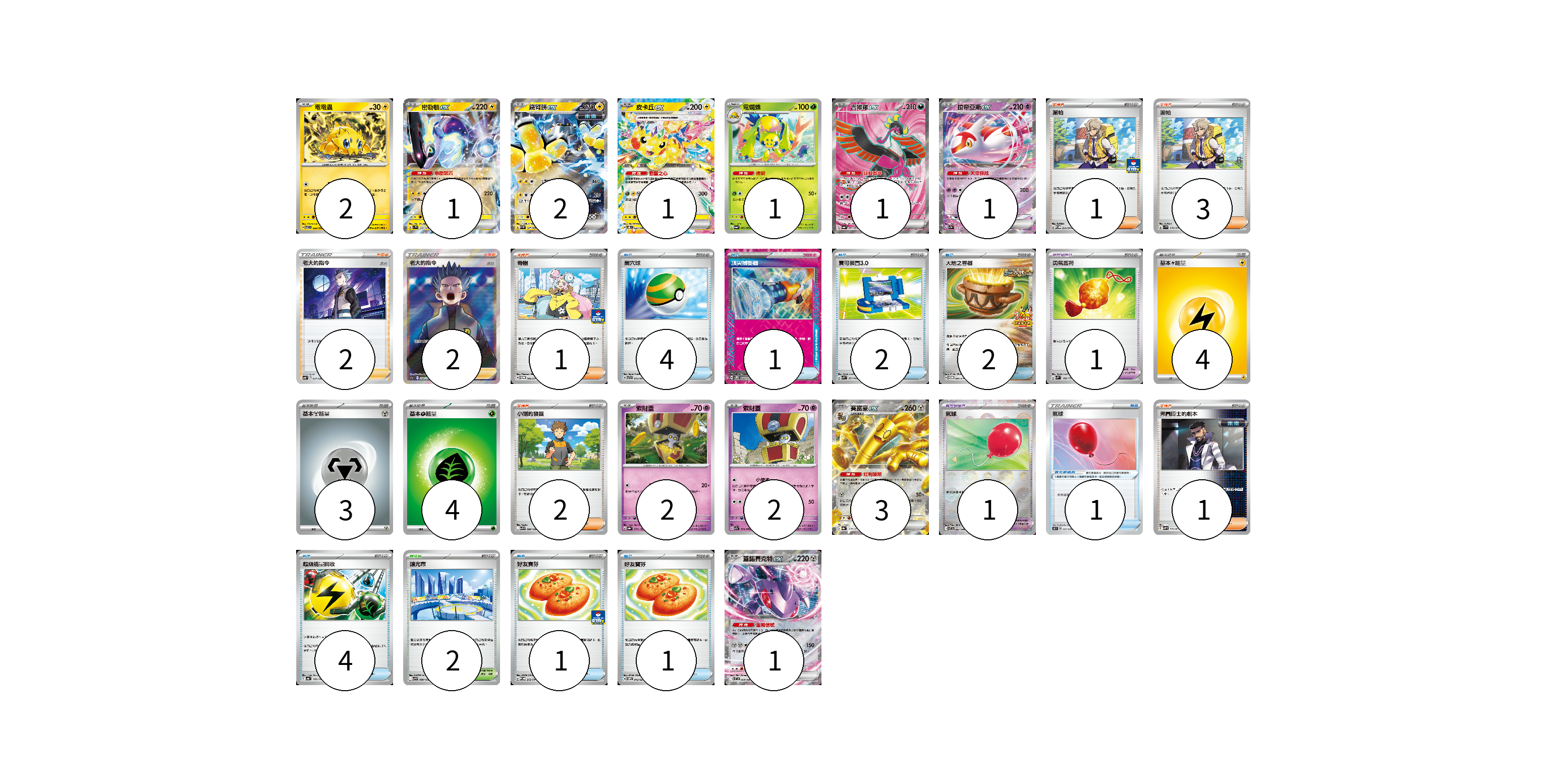 牌組構築方案 以此牌組為基礎新構築牌組 顯示卡面 顯示列表 寶可夢卡(17) 2 1 2 1 1 1 1 2 2 3 1 寶可夢道具(3) 1 1 1 物品卡(15) 4 1 2 2 4 1 1 支援者卡(12) 1 3 2 2 1 2 1 競技場卡(2) 2 能量卡(11) 4 3 4 寶可夢卡(17) 卡牌名稱 張數 卡牌名稱 張數 電電蟲 SV7 032/102 02 密勒頓ex SV1V 037/078 01 鐵臂膀ex SV4M 027/066 02 皮卡丘ex SV8 033/106 01 電蜘蛛 SV6a 002/064 01 吉雉雞ex SV6a 081/064 01 拉帝亞斯ex SV7a 019/064 01 索財靈 SV8a 073/187 02 索財靈 SV7a 024/064 02 賽富豪ex SV8a 117/187 03 蓋諾賽克特ex SV11B 069/086 01 寶可夢道具(3) 卡牌名稱 張數 卡牌名稱 張數 勇氣護符 SVM 142/175 01 氣球 SV11B 082/086 01 氣球 SK 021/030 01 物品卡(15) 卡牌名稱 張數 卡牌名稱 張數 巢穴球 SVTR 013/021 04 頂尖捕捉器 SV5M 062/071 01 寶可裝置3.0 SVK 021/042 02 大地之容器 SV-P 084/SV-P 02 超級能量回收 SV4a 157/190 04 好友寶芬 SV-P 212/SV-P 01 好友寶芬 SVOM 012/021 01 支援者卡(12) 卡牌名稱 張數 卡牌名稱 張數 派帕 SV-P 213/SV-P 01 派帕 SV1V 076/078 03 老大的指令(赤日) SVB 024/028 02 老大的指令(赤日) S12a 250/172 02 奇樹 SV-P 106/SV-P 01 小剛的發掘 SV9 096/100 02 弗圖博士的劇本 SVHM 021/022 01 競技場卡(2) 卡牌名稱 張數 卡牌名稱 張數 釀光市 SV9 098/100 02 能量卡(11) 卡牌名稱 張數 卡牌名稱 張數 基本【雷】能量 SVHM LIG 04 基本【鋼】能量 SVF MET 03 基本【草】能量 M-P GRA 04 以此牌組為基礎新構築牌組 牌組編碼 vqCUau-imcTxf-ykLMvO copy 列印牌組單 牌組編碼已複製 分享至SNS