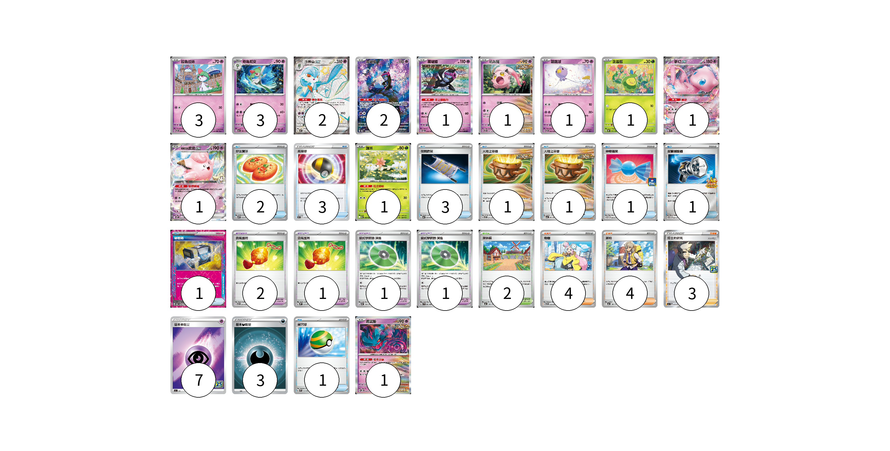 牌組構築方案 以此牌組為基礎新構築牌組 顯示卡面 顯示列表 寶可夢卡(18) 3 3 2 2 1 1 1 1 1 1 1 1 寶可夢道具(5) 2 1 1 1 物品卡(14) 2 3 3 1 1 1 1 1 1 支援者卡(11) 4 4 3 競技場卡(2) 2 能量卡(10) 7 3 寶可夢卡(18) 卡牌名稱 張數 卡牌名稱 張數 拉魯拉絲 SVTS 002/022 03 奇魯莉安 SV4a 081/190 03 沙奈朵ex SV4a 328/190 02 願增猿 SV6 107/101 02 願增猿 SV6 055/101 01 吼叫尾 SVTS 007/022 01 飄飄球 SVTS 005/022 01 含羞苞 SV8a 001/187 01 夢幻ex SV4a 076/190 01 莉莉艾的皮皮ex SV9 033/100 01 謝米 SV9a 006/063 01 振翼髮 SV5K 033/071 01 寶可夢道具(5) 卡牌名稱 張數 卡牌名稱 張數 勇氣護符 SVTS 017/022 02 勇氣護符 SV2D 067/071 01 招式學習器 演進 SV8a 160/187 01 招式學習器 演進 SV4M 063/066 01 物品卡(14) 卡牌名稱 張數 卡牌名稱 張數 好友寶芬 SV5K 063/071 02 高級球 SK 015/030 03 夜間擔架 SV6a 056/064 03 大地之容器 SVTS 011/022 01 大地之容器 SV4K 060/066 01 神奇糖果 SV-P 104/SV-P 01 反擊捕捉器 SV-P 083/SV-P 01 秘密箱 SV6 092/101 01 巢穴球 SVAW 014/023 01 支援者卡(11) 卡牌名稱 張數 卡牌名稱 張數 奇樹 SVTS 018/022 04 派帕 SV4a 180/190 04 博士的研究(大木博士) S8a 003/028 03 競技場卡(2) 卡牌名稱 張數 卡牌名稱 張數 深缽鎮 SV4a 185/190 02 能量卡(10) 卡牌名稱 張數 卡牌名稱 張數 基本超能量 S8a PSY 07 基本惡能量 SLD DAR 03 以此牌組為基礎新構築牌組 牌組編碼 vqJTJs-qsQgBa-sZFmlp copy 列印牌組單 牌組編碼已複製 分享至SNS