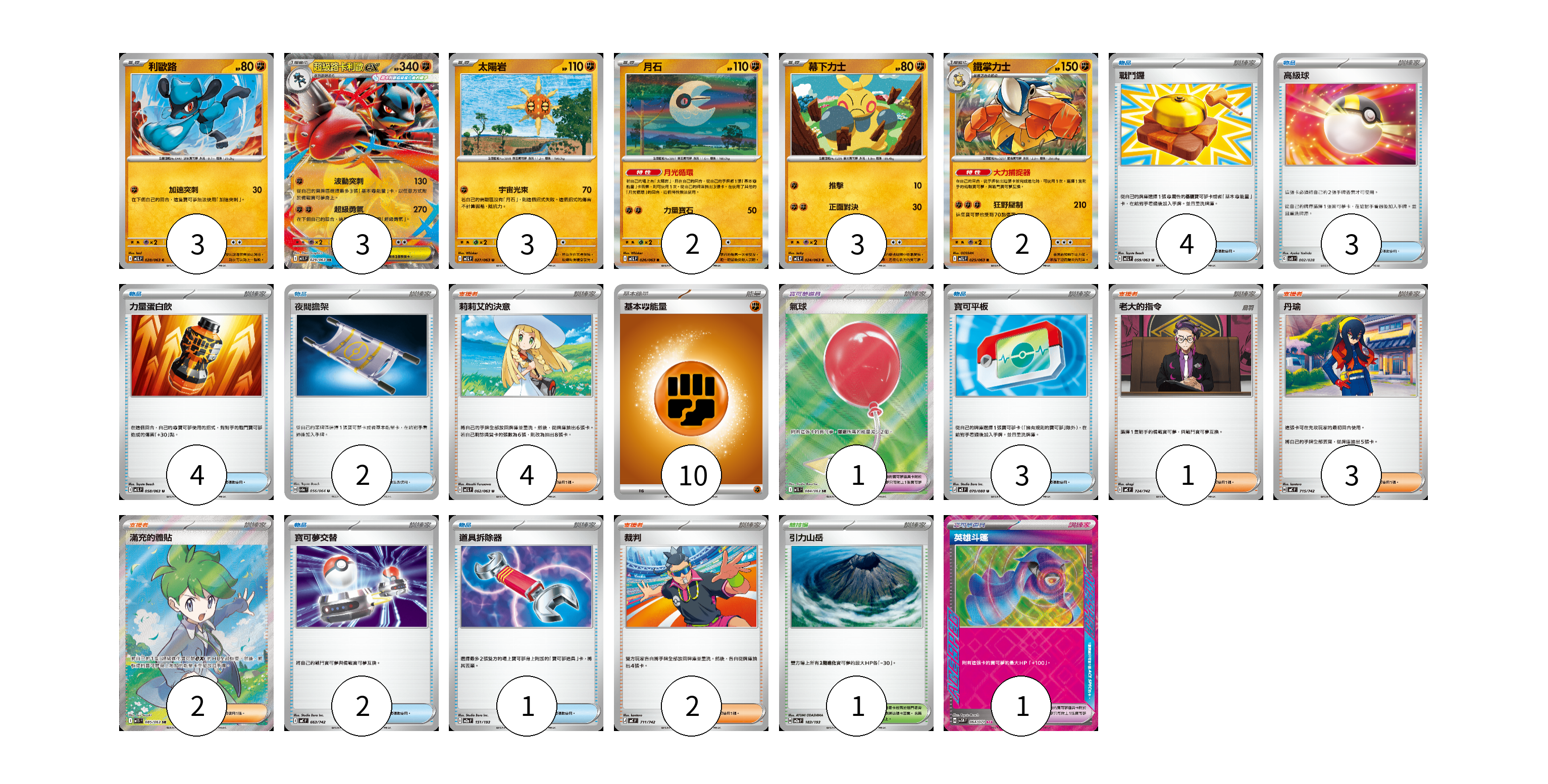 牌組構築方案 以此牌組為基礎新構築牌組 顯示卡面 顯示列表 寶可夢卡(16) 3 3 3 2 3 2 寶可夢道具(2) 1 1 物品卡(19) 4 3 4 2 3 2 1 支援者卡(12) 4 1 3 2 2 競技場卡(1) 1 能量卡(10) 10 寶可夢卡(16) 卡牌名稱 張數 卡牌名稱 張數 利歐路 M1L 028/063 03 超級路卡利歐ex M1L 029/063 03 太陽岩 M1L 027/063 03 月石 M1L 026/063 02 幕下力士 M1L 024/063 03 鐵掌力士 M1L 025/063 02 寶可夢道具(2) 卡牌名稱 張數 卡牌名稱 張數 氣球 M1L 084/063 01 英雄斗篷 SV5M 064/071 01 物品卡(19) 卡牌名稱 張數 卡牌名稱 張數 戰鬥鑼 M1L 059/063 04 高級球 SVB 002/028 03 力量蛋白飲 M1L 058/063 04 夜間擔架 SV6a 056/064 02 寶可平板 M3 070/080 03 寶可夢交替 MC 663/742 02 道具拆除器 M2a 151/193 01 支援者卡(12) 卡牌名稱 張數 卡牌名稱 張數 莉莉艾的決意 M1L 062/063 04 老大的指令 MC 724/742 01 丹瑜 MC 715/742 03 滿充的體貼 M1S 085/063 02 裁判 MC 711/742 02 競技場卡(1) 卡牌名稱 張數 卡牌名稱 張數 引力山岳 M2a 183/193 01 能量卡(10) 卡牌名稱 張數 卡牌名稱 張數 基本【鬥】能量 M-P FIG 10 以此牌組為基礎新構築牌組 牌組編碼 vqhvnS-hmYAlG-cycoQH copy 列印牌組單 牌組編碼已複製 分享至SNS