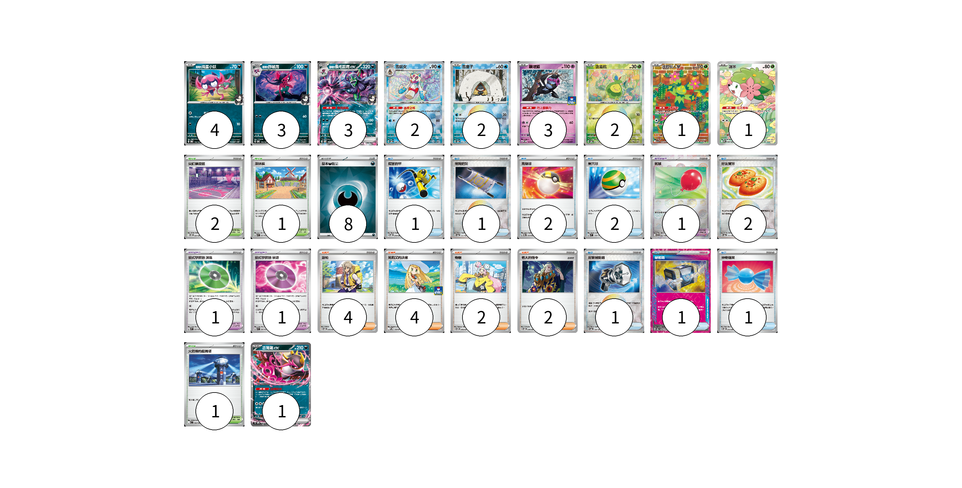 牌組構築方案 以此牌組為基礎新構築牌組 顯示卡面 顯示列表 寶可夢卡(22) 4 3 3 2 2 3 2 1 1 1 寶可夢道具(3) 1 1 1 物品卡(11) 1 1 2 2 2 1 1 1 支援者卡(12) 4 4 2 2 競技場卡(4) 2 1 1 能量卡(8) 8 寶可夢卡(22) 卡牌名稱 張數 卡牌名稱 張數 <瑪俐的>搗蛋小妖 SVOM 005/021 04 <瑪俐的>詐唬魔 SVOM 006/021 03 <瑪俐的>長毛巨魔ex SVOM 007/021 03 雪妖女 SV8a 038/187 02 雪童子 SV8a 037/187 02 願增猿 M-P 014/M-P 03 含羞苞 SV8a 001/187 02 沙鈴仙人掌 SV9 101/100 01 謝米 SV9a 066/063 01 吉雉雞ex SVOD 004/020 01 寶可夢道具(3) 卡牌名稱 張數 卡牌名稱 張數 氣球 SV11B 082/086 01 招式學習器 演進 SVK 025/042 01 招式學習器 衰退 SVK 026/042 01 物品卡(11) 卡牌名稱 張數 卡牌名稱 張數 厲害釣竿 SVOD 010/020 01 夜間擔架 SV8a 151/187 01 高級球 SVQL 015/022 02 巢穴球 SVM 133/175 02 好友寶芬 SV8a 147/187 02 反擊捕捉器 SV8a 139/187 01 秘密箱 SV6 092/101 01 神奇糖果 SVOD 013/020 01 支援者卡(12) 卡牌名稱 張數 卡牌名稱 張數 派帕 SVOD 018/020 04 莉莉艾的決意 M-P 018/M-P 04 奇樹 SVOM 018/021 02 老大的指令 SVOD 019/020 02 競技場卡(4) 卡牌名稱 張數 卡牌名稱 張數 尖釘鎮道館 SVOM 021/021 02 深缽鎮 SVK 039/042 01 火箭隊的監視塔 SV10 096/098 01 能量卡(8) 卡牌名稱 張數 卡牌名稱 張數 基本【惡】能量 SVOM DAR 08 以此牌組為基礎新構築牌組 牌組編碼 vtrPjI-ZIPvJI-YGccJy copy 列印牌組單 牌組編碼已複製 分享至SNS