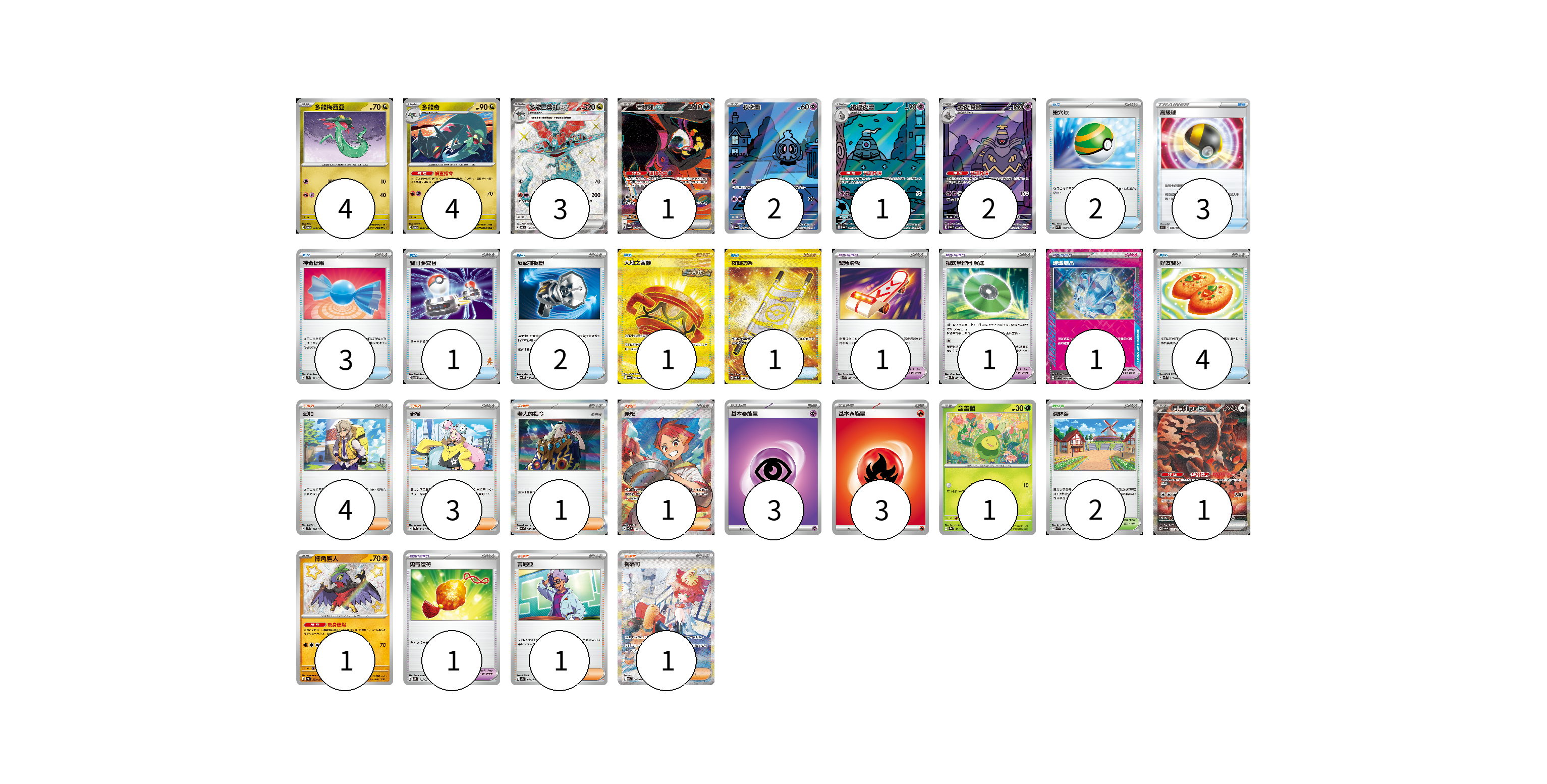 牌組構築方案 以此牌組為基礎新構築牌組 顯示卡面 顯示列表 寶可夢卡(20) 4 4 3 1 2 1 2 1 1 1 寶可夢道具(4) 1 1 1 1 物品卡(17) 2 3 3 1 2 1 1 4 支援者卡(11) 4 3 1 1 1 1 競技場卡(2) 2 能量卡(6) 3 3 寶可夢卡(20) 卡牌名稱 張數 卡牌名稱 張數 多龍梅西亞 SV6 079/101 04 多龍奇 SV6 080/101 04 多龍巴魯托ex SV6 120/101 03 吉雉雞ex SV6a 089/064 01 夜巡靈 SV6a 068/064 02 彷徨夜靈 SV6a 069/064 01 黑夜魔靈 SV6a 070/064 02 含羞苞 SV8a 001/187 01 月月熊 赫月ex SV8a 225/187 01 摔角鷹人 SV4a 282/190 01 寶可夢道具(4) 卡牌名稱 張數 卡牌名稱 張數 緊急滑板 SVK 023/042 01 招式學習器 演進 SV4M 063/066 01 璀璨結晶 SV7 094/102 01 勇氣護符 SV2D 067/071 01 物品卡(17) 卡牌名稱 張數 卡牌名稱 張數 巢穴球 SV1S 070/078 02 高級球 S9 089/100 03 神奇糖果 SV1V 072/078 03 寶可夢交替 SVI 054/066 01 反擊捕捉器 SV4M 059/066 02 大地之容器 SV6a 093/064 01 夜間擔架 SV8 137/106 01 好友寶芬 SVK 015/042 04 支援者卡(11) 卡牌名稱 張數 卡牌名稱 張數 派帕 SV1V 076/078 04 奇樹 SV2D 069/071 03 老大的指令 SV1a 069/073 01 赤松 SV7 123/102 01 吉尼亞 SV1S 074/078 01 梅洛可 SV4K 092/066 01 競技場卡(2) 卡牌名稱 張數 卡牌名稱 張數 深缽鎮 SVK 039/042 02 能量卡(6) 卡牌名稱 張數 卡牌名稱 張數 基本【超】能量 SVEM PSY 03 基本【火】能量 SVEL FIR 03 以此牌組為基礎新構築牌組 牌組編碼 vywnfy-reHDiT-nIZLoM copy 列印牌組單 牌組編碼已複製 分享至SNS