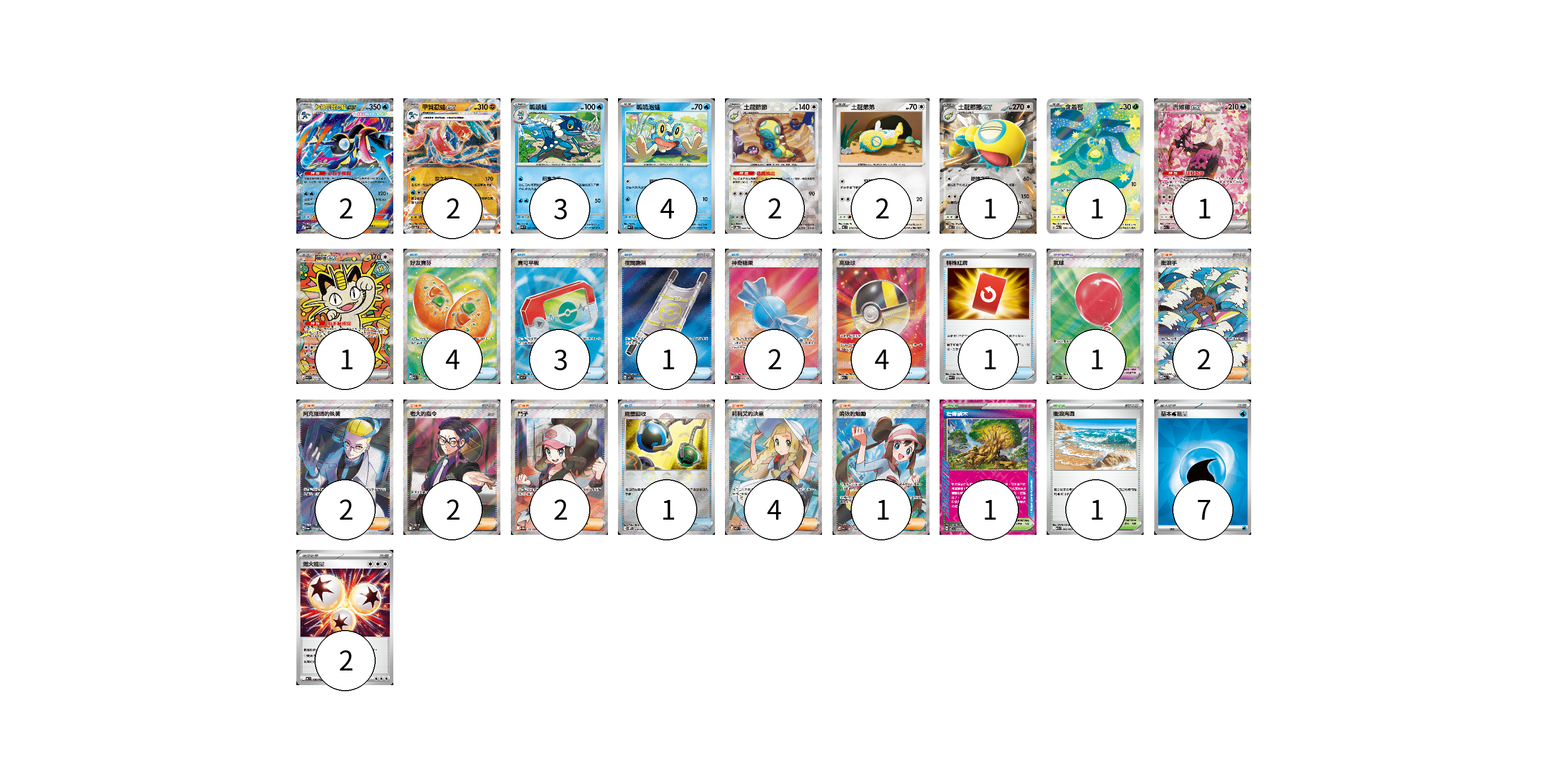 牌組構築方案 以此牌組為基礎新構築牌組 顯示卡面 顯示列表 寶可夢卡(19) 2 2 3 4 2 2 1 1 1 1 寶可夢道具(1) 1 物品卡(16) 4 3 1 2 4 1 1 支援者卡(13) 2 2 2 2 4 1 競技場卡(2) 1 1 能量卡(9) 7 2 寶可夢卡(19) 卡牌名稱 張數 卡牌名稱 張數 超級甲賀忍蛙ex M4 022/083 02 甲賀忍蛙ex SV5a 045/066 02 呱頭蛙 M4 021/083 03 呱呱泡蛙 M4 020/083 04 土龍節節 SV8a 130/187 02 土龍弟弟 MC 574/742 02 土龍節節ex MC 575/742 01 含羞苞 M2a 196/193 01 吉雉雞ex M2a 244/193 01 喵喵ex M3 114/080 01 寶可夢道具(1) 卡牌名稱 張數 卡牌名稱 張數 氣球 M1L 084/063 01 物品卡(16) 卡牌名稱 張數 卡牌名稱 張數 好友寶芬 M1S 081/063 04 寶可平板 M3 103/080 03 夜間擔架 M1L 083/063 01 神奇糖果 M1S 082/063 02 高級球 M2a 216/193 04 特殊紅牌 M4 072/083 01 能量回收 SV11W 079/086 01 支援者卡(13) 卡牌名稱 張數 卡牌名稱 張數 衝浪手 M2a 249/193 02 阿克羅瑪的執著 SV6a 083/064 02 老大的指令(烏羽) MC 760/742 02 鬥子 SV11W 166/086 02 莉莉艾的決意 M1L 086/063 04 鳴依的勉勵 M3 107/080 01 競技場卡(2) 卡牌名稱 張數 卡牌名稱 張數 壯偉碩木 SV7 101/102 01 衝浪海灘 M1S 062/063 01 能量卡(9) 卡牌名稱 張數 卡牌名稱 張數 基本【水】能量 SVM WAT 07 燃火能量 MC 736/742 02 以此牌組為基礎新構築牌組 牌組編碼 wBXwQM-nELZgC-diQtdJ copy 列印牌組單 牌組編碼已複製 分享至SNS