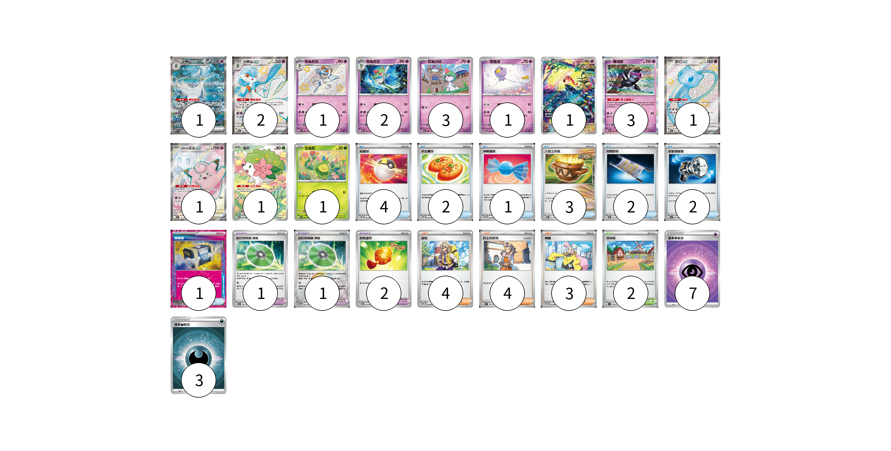 牌組構築方案 以此牌組為基礎新構築牌組 顯示卡面 顯示列表 寶可夢卡(18) 1 2 1 2 3 1 1 3 1 1 1 1 寶可夢道具(4) 1 1 2 物品卡(15) 4 2 1 3 2 2 1 支援者卡(11) 4 4 3 競技場卡(2) 2 能量卡(10) 7 3 寶可夢卡(18) 卡牌名稱 張數 卡牌名稱 張數 沙奈朵ex SV4a 348/190 01 沙奈朵ex SV4a 328/190 02 奇魯莉安 SV4a 259/190 01 奇魯莉安 SV4a 081/190 02 拉魯拉絲 SV4a 080/190 03 飄飄球 SVTS 005/022 01 吼叫尾 SV4K 071/066 01 願增猿 SV8a 075/187 03 夢幻ex SV4a 327/190 01 莉莉艾的皮皮ex SV9 115/100 01 謝米 SV9a 066/063 01 含羞苞 SV8a 001/187 01 寶可夢道具(4) 卡牌名稱 張數 卡牌名稱 張數 招式學習器 演進 SV8a 160/187 01 招式學習器 演進 SV8a 160/187 01 勇氣護符 SVTR 015/021 02 物品卡(15) 卡牌名稱 張數 卡牌名稱 張數 高級球 SVOD 012/020 04 好友寶芬 SVOD 011/020 02 神奇糖果 SVOD 013/020 01 大地之容器 SV8a 143/187 03 夜間擔架 SV8a 151/187 02 反擊捕捉器 SVK 009/042 02 秘密箱 SV6 092/101 01 支援者卡(11) 卡牌名稱 張數 卡牌名稱 張數 派帕 SVOD 018/020 04 博士的研究 SVM 170/175 04 奇樹 SVOD 016/020 03 競技場卡(2) 卡牌名稱 張數 卡牌名稱 張數 深缽鎮 SV1a 070/073 02 能量卡(10) 卡牌名稱 張數 卡牌名稱 張數 基本【超】能量 SI PSY 07 基本【惡】能量 SI DAR 03 以此牌組為基礎新構築牌組 牌組編碼 wBtVyi-uCYqxr-ZqLUZJ copy 列印牌組單 牌組編碼已複製 分享至SNS
