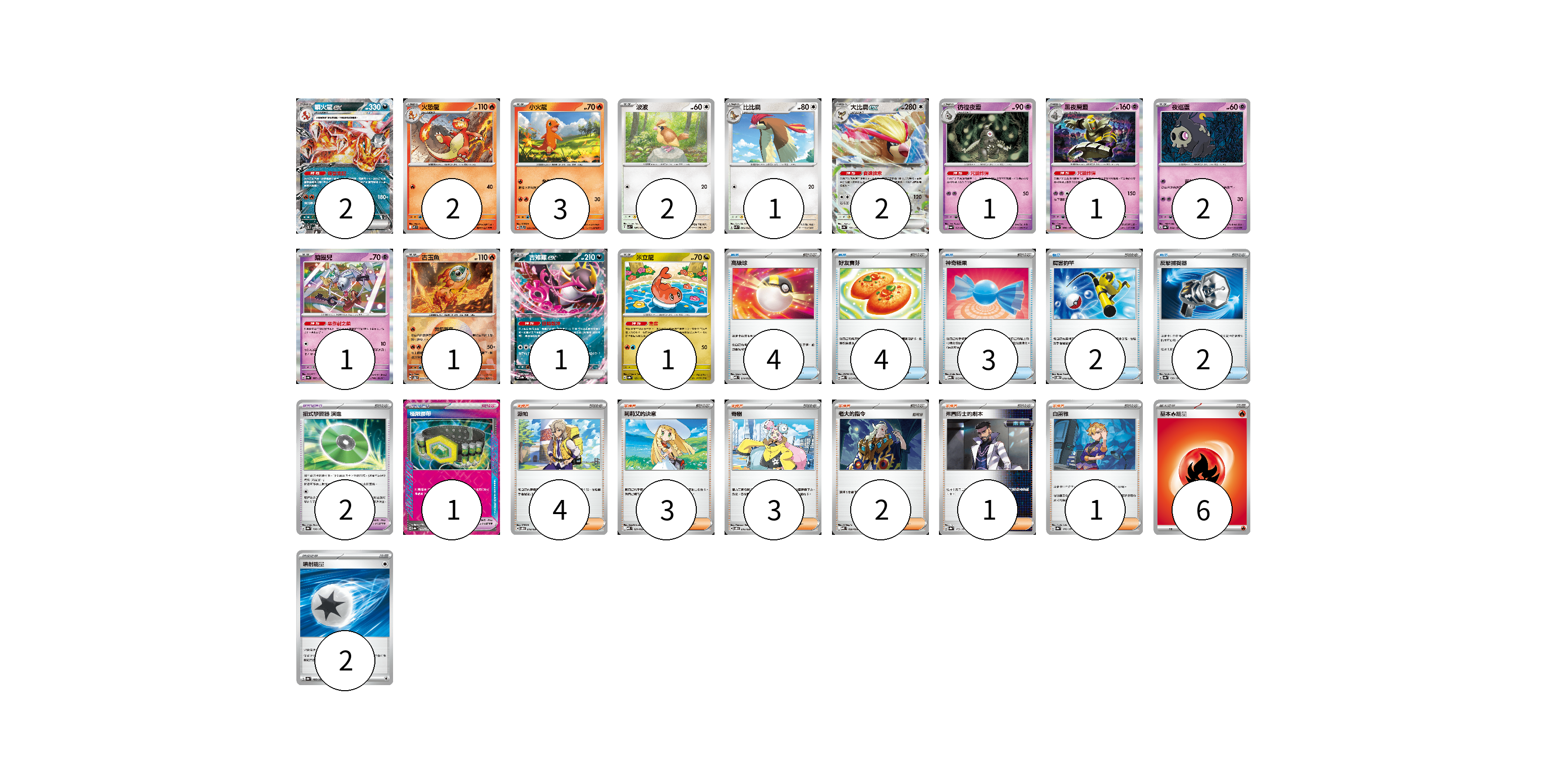 牌組構築方案 以此牌組為基礎新構築牌組 顯示卡面 顯示列表 寶可夢卡(20) 2 2 3 2 1 2 1 1 2 1 1 1 1 寶可夢道具(3) 2 1 物品卡(15) 4 4 3 2 2 支援者卡(14) 4 3 3 2 1 1 能量卡(8) 6 2 寶可夢卡(20) 卡牌名稱 張數 卡牌名稱 張數 噴火龍ex SVTL 006/021 02 火恐龍 M2 012/080 02 小火龍 SVTL 001/021 03 波波 SV3 087/108 02 比比鳥 SVK 004/042 01 大比鳥ex SV4a 139/190 02 彷徨夜靈 SV6a 019/064 01 黑夜魔靈 SV8a 066/187 01 夜巡靈 SV8a 064/187 02 鑰圈兒 SV4a 087/190 01 古玉魚 SV8a 025/187 01 吉雉雞ex SV8a 104/187 01 米立龍 SV8a 121/187 01 寶可夢道具(3) 卡牌名稱 張數 卡牌名稱 張數 招式學習器 演進 SV8a 160/187 02 極限腰帶 SV8a 159/187 01 物品卡(15) 卡牌名稱 張數 卡牌名稱 張數 高級球 MBD 014/022 04 好友寶芬 MBD 013/022 04 神奇糖果 MBG 013/022 03 厲害釣竿 SVOD 010/020 02 反擊捕捉器 SV8a 139/187 02 支援者卡(14) 卡牌名稱 張數 卡牌名稱 張數 派帕 SVOD 018/020 04 莉莉艾的決意 MBD 021/022 03 奇樹 SVOD 016/020 03 老大的指令 MBD 020/022 02 弗圖博士的劇本 SV8a 175/187 01 白蕾雅 SV8a 176/187 01 能量卡(8) 卡牌名稱 張數 卡牌名稱 張數 基本火能量 sv-p FIR 06 噴射能量 SV8a 185/187 02 以此牌組為基礎新構築牌組 牌組編碼 wDlJpb-DfAOzK-QqjyLF copy 列印牌組單 牌組編碼已複製 分享至SNS