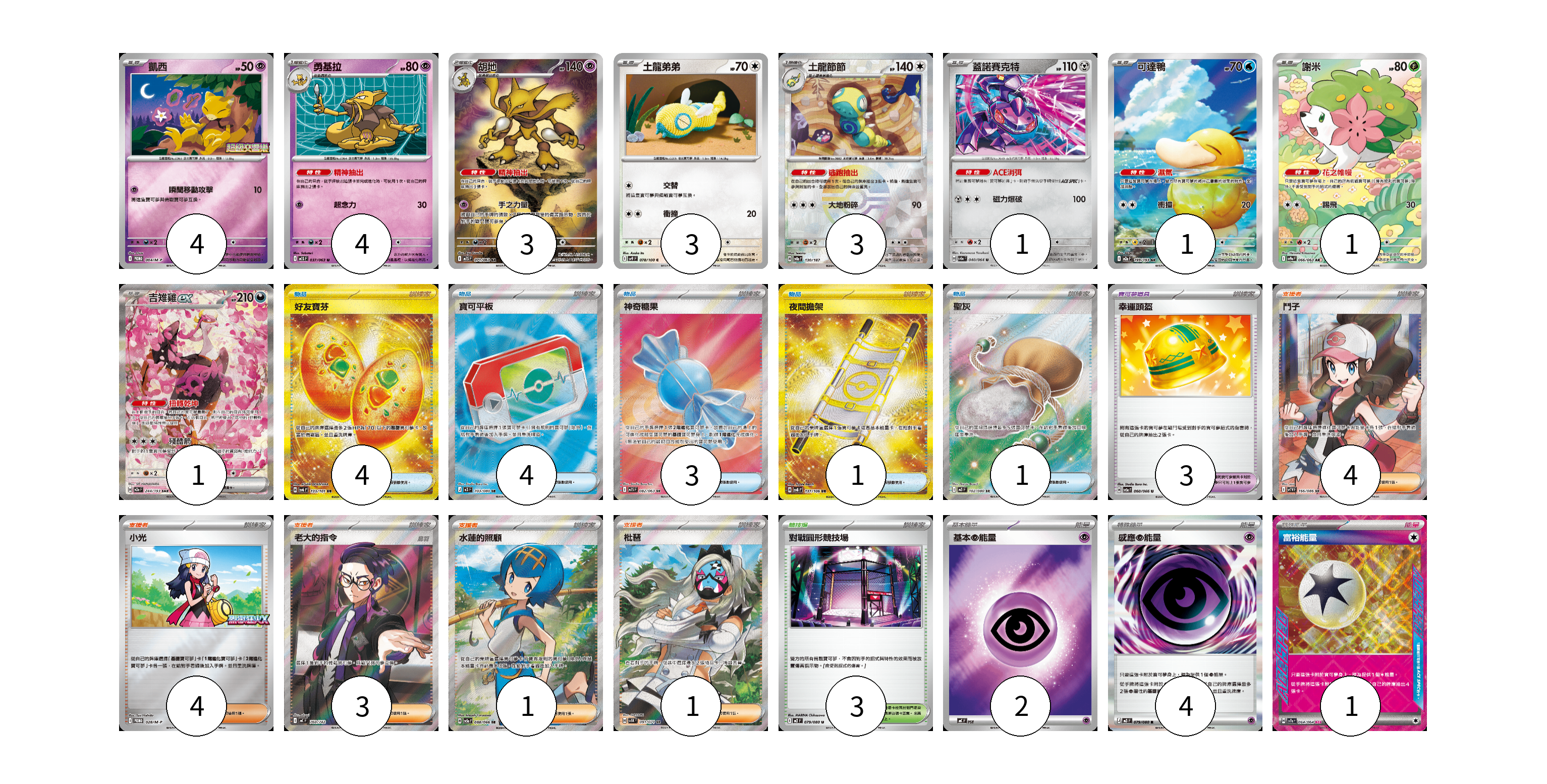 牌組構築方案 以此牌組為基礎新構築牌組 顯示卡面 顯示列表 寶可夢卡(21) 4 4 3 3 3 1 1 1 1 寶可夢道具(3) 3 物品卡(13) 4 4 3 1 1 支援者卡(13) 4 4 3 1 1 競技場卡(3) 3 能量卡(7) 2 4 1 寶可夢卡(21) 卡牌名稱 張數 卡牌名稱 張數 凱西 M-P 004/M-P 04 勇基拉 M1S 037/063 04 胡地 M1S 071/063 03 土龍弟弟 SV9 078/100 03 土龍節節 SV8a 130/187 03 蓋諾賽克特 SV6a 040/064 01 可達鴨 M2a 199/193 01 謝米 SV9a 066/063 01 吉雉雞ex M2a 244/193 01 寶可夢道具(3) 卡牌名稱 張數 卡牌名稱 張數 幸運頭盔 SV5a 060/066 03 物品卡(13) 卡牌名稱 張數 卡牌名稱 張數 好友寶芬 SV6 133/101 04 寶可平板 M3 103/080 04 神奇糖果 M1S 082/063 03 夜間擔架 SV8 137/106 01 聖灰 M3 102/080 01 支援者卡(13) 卡牌名稱 張數 卡牌名稱 張數 鬥子 SV11W 166/086 04 小光 M-P 028/M-P 04 老大的指令(烏羽) MC 760/742 03 水蓮的照顧 SV5a 088/066 01 枇琶 SV5K 091/071 01 競技場卡(3) 卡牌名稱 張數 卡牌名稱 張數 對戰圓形競技場 M2 079/080 03 能量卡(7) 卡牌名稱 張數 卡牌名稱 張數 基本【超】能量 MC PSY 02 感應【超】能量 M3 079/080 04 富裕能量 SV7a 064/064 01 以此牌組為基礎新構築牌組 牌組編碼 wEfyls-Htjirk-tcWvnh copy 列印牌組單 牌組編碼已複製 分享至SNS