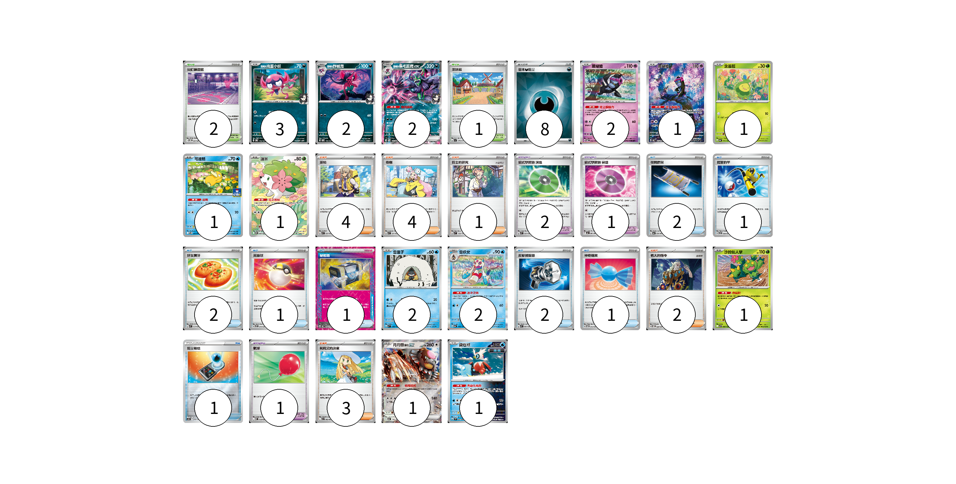 牌組構築方案 以此牌組為基礎新構築牌組 顯示卡面 顯示列表 寶可夢卡(20) 3 2 2 2 1 1 1 1 2 2 1 1 1 寶可夢道具(4) 2 1 1 物品卡(11) 2 1 2 1 1 2 1 1 支援者卡(14) 4 4 1 2 3 競技場卡(3) 2 1 能量卡(8) 8 寶可夢卡(20) 卡牌名稱 張數 卡牌名稱 張數 <瑪俐的>搗蛋小妖 SVOM 005/021 03 <瑪俐的>詐唬魔 SVOM 006/021 02 <瑪俐的>長毛巨魔ex SVOM 007/021 02 願增猿 SV6 055/101 02 願增猿 SV6 107/101 01 含羞苞 SV8a 001/187 01 可達鴨 SV-P 220/SV-P 01 謝米 SV9a 066/063 01 雪童子 SVM 034/175 02 雪妖女 SV8a 038/187 02 沙鈴仙人掌 SV9 006/100 01 月月熊 赫月ex SV8a 134/187 01 鐵包袱 SV4M 020/066 01 寶可夢道具(4) 卡牌名稱 張數 卡牌名稱 張數 招式學習器 演進 SVK 025/042 02 招式學習器 衰退 SV4K 063/066 01 氣球 MBD 018/022 01 物品卡(11) 卡牌名稱 張數 卡牌名稱 張數 夜間擔架 SV6a 056/064 02 厲害釣竿 SVTL 009/021 01 好友寶芬 SVK 015/042 02 高級球 SVTS 014/022 01 秘密箱 SV6 092/101 01 反擊捕捉器 SVK 009/042 02 神奇糖果 SVTM 013/022 01 能量輸送 SO 018/030 01 支援者卡(14) 卡牌名稱 張數 卡牌名稱 張數 派帕 SVK 035/042 04 奇樹 SVK 031/042 04 博士的研究 SVM 169/175 01 老大的指令 SVOM 020/021 02 莉莉艾的決意 M1L 062/063 03 競技場卡(3) 卡牌名稱 張數 卡牌名稱 張數 尖釘鎮道館 SVOM 021/021 02 深缽鎮 SV1a 070/073 01 能量卡(8) 卡牌名稱 張數 卡牌名稱 張數 基本【惡】能量 SVOM DAR 08 以此牌組為基礎新構築牌組 牌組編碼 wJsEYy-qQYWXK-qlskEK copy 列印牌組單 牌組編碼已複製 分享至SNS