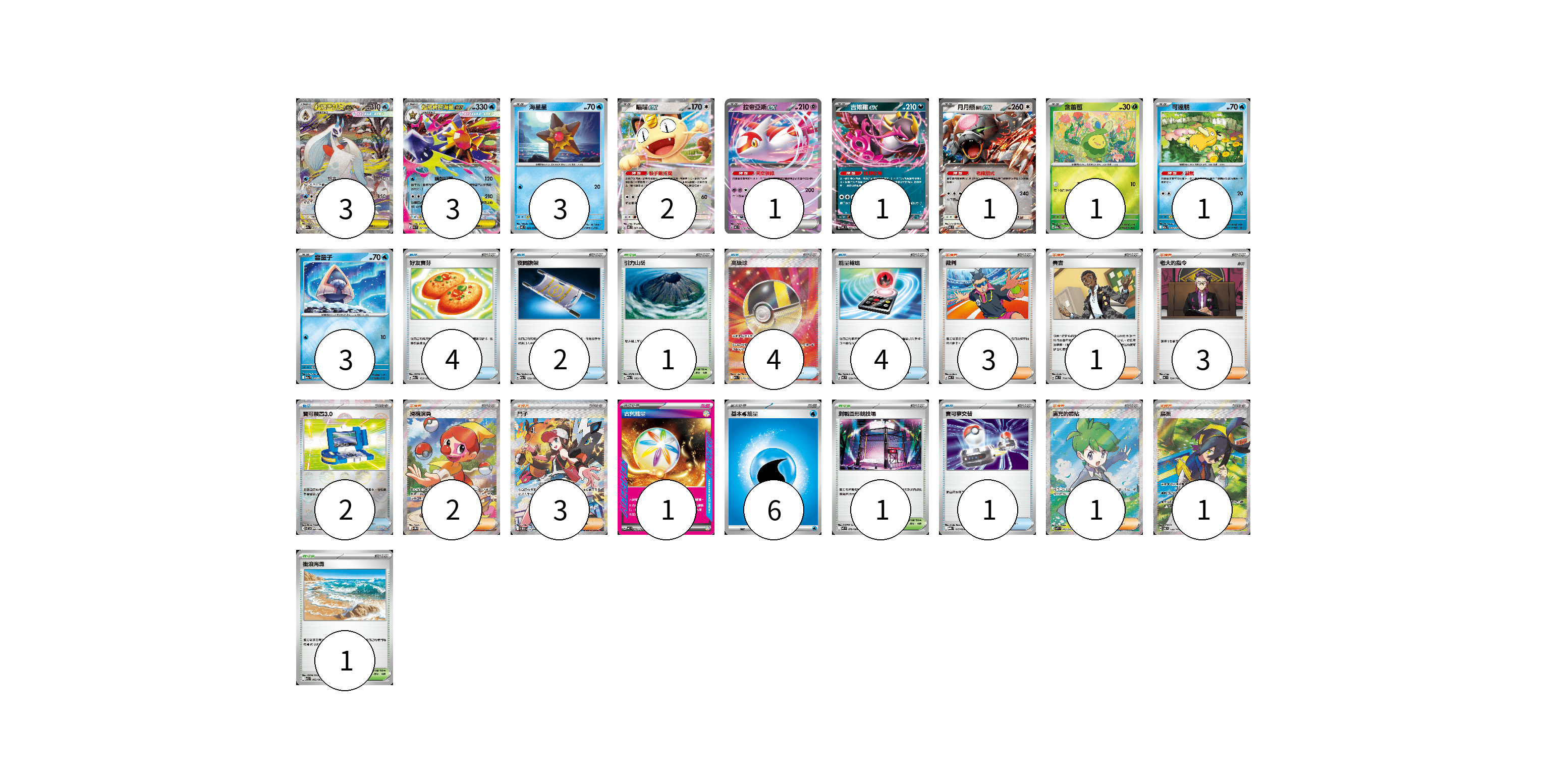 牌組構築方案 以此牌組為基礎新構築牌組 顯示卡面 顯示列表 寶可夢卡(19) 3 3 3 2 1 1 1 1 1 3 物品卡(17) 4 2 4 4 2 1 支援者卡(14) 3 1 3 2 3 1 1 競技場卡(3) 1 1 1 能量卡(7) 1 6 寶可夢卡(19) 卡牌名稱 張數 卡牌名稱 張數 超級雪妖女ex M2a 233/193 03 超級寶石海星ex M3 021/080 03 海星星 M3 020/080 03 喵喵ex M3 061/080 02 拉帝亞斯ex MC 312/742 01 吉雉雞ex MC 489/742 01 月月熊 赫月 ex MC 625/742 01 含羞苞 M2a 011/193 01 可達鴨 M2a 032/193 01 雪童子 M2a 035/193 03 物品卡(17) 卡牌名稱 張數 卡牌名稱 張數 好友寶芬 M2a 153/193 04 夜間擔架 M2a 159/193 02 高級球 M2a 216/193 04 能量輸送 MC 639/742 04 寶可裝置3.0 SV11B 081/086 02 寶可夢交替 MBG 015/022 01 支援者卡(14) 卡牌名稱 張數 卡牌名稱 張數 裁判 MC 711/742 03 賽吉 MC 714/742 01 老大的指令 MC 724/742 03 滑稽演員 SV11W 165/086 02 鬥子 SV11W 173/086 03 滿充的體貼 M1S 085/063 01 烏栗 SV6 122/101 01 競技場卡(3) 卡牌名稱 張數 卡牌名稱 張數 引力山岳 M2a 183/193 01 對戰圓形競技場 M2 079/080 01 衝浪海灘 M1S 062/063 01 能量卡(7) 卡牌名稱 張數 卡牌名稱 張數 古舊能量 MC 741/742 01 基本【水】能量 MC WAT 06 以此牌組為基礎新構築牌組 牌組編碼 wJyMQx-pknxvY-firVoy copy 列印牌組單 牌組編碼已複製 分享至SNS