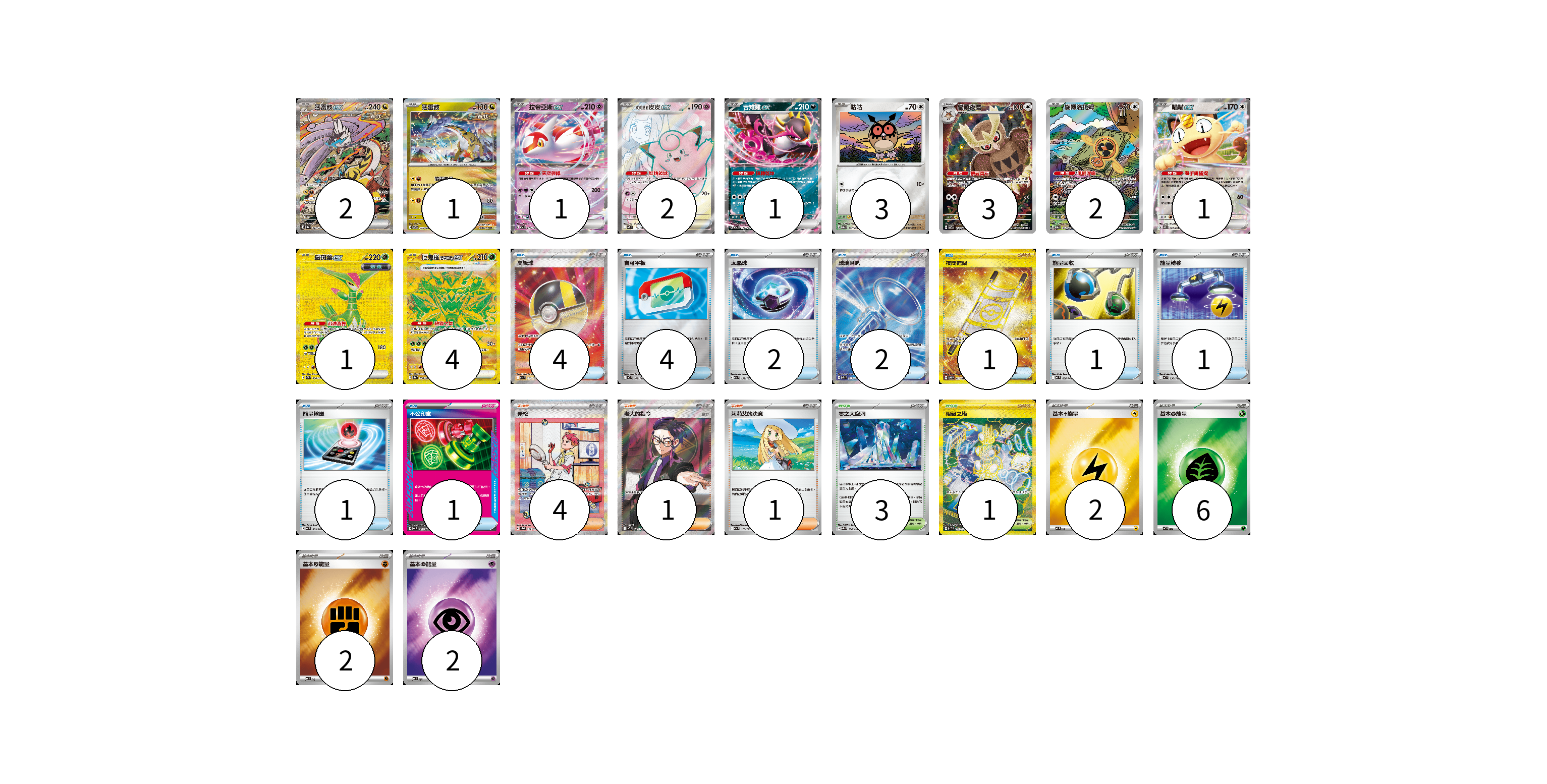 牌組構築方案 以此牌組為基礎新構築牌組 顯示卡面 顯示列表 寶可夢卡(21) 2 1 1 2 1 3 3 2 1 1 4 物品卡(17) 4 4 2 2 1 1 1 1 1 支援者卡(6) 4 1 1 競技場卡(4) 3 1 能量卡(12) 2 6 2 2 寶可夢卡(21) 卡牌名稱 張數 卡牌名稱 張數 猛雷鼓ex SV8a 222/187 02 猛雷鼓 SV7 075/102 01 拉帝亞斯ex M2a 075/193 01 莉莉艾的皮皮ex SV9 115/100 02 吉雉雞ex M2a 114/193 01 咕咕 M2a 137/193 03 貓頭夜鷹 SV7 114/102 03 旋轉洛托姆 M2a 213/193 02 喵喵ex M3 061/080 01 鐵斑葉ex SV5M 098/071 01 厄鬼椪 碧草面具ex SV8a 234/187 04 物品卡(17) 卡牌名稱 張數 卡牌名稱 張數 高級球 M2a 216/193 04 寶可平板 MC 662/742 04 太晶珠 M2a 152/193 02 玻璃喇叭 M2a 215/193 02 夜間擔架 SV8 137/106 01 能量回收 MC 636/742 01 能量轉移 MC 638/742 01 能量輸送 MC 639/742 01 不公印章 MC 633/742 01 支援者卡(6) 卡牌名稱 張數 卡牌名稱 張數 赤松 SV8a 227/187 04 老大的指令(烏羽) MC 760/742 01 莉莉艾的決意 M2a 175/193 01 競技場卡(4) 卡牌名稱 張數 卡牌名稱 張數 零之大空洞 M2a 184/193 03 阻礙之塔 SV10 132/098 01 能量卡(12) 卡牌名稱 張數 卡牌名稱 張數 基本【雷】能量 MC LIG 02 基本【草】能量 MC GRA 06 基本【鬥】能量 MC FIG 02 基本【超】能量 MC PSY 02 以此牌組為基礎新構築牌組 牌組編碼 wNOpYa-VmILZC-CfTBbv copy 列印牌組單 牌組編碼已複製 分享至SNS