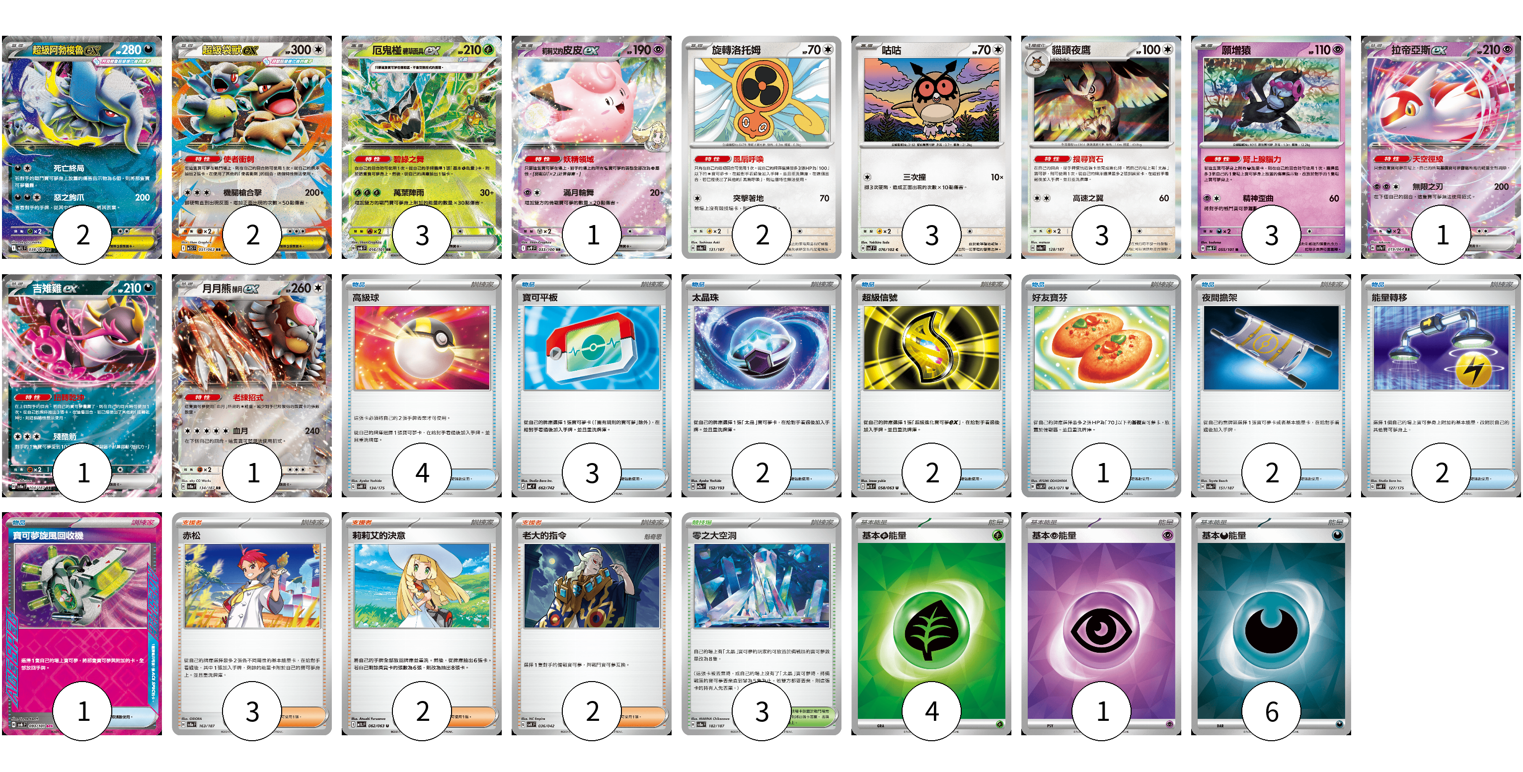 牌組構築方案 以此牌組為基礎新構築牌組 顯示卡面 顯示列表 寶可夢卡(22) 2 2 3 1 2 3 3 3 1 1 1 物品卡(17) 4 3 2 2 1 2 2 1 支援者卡(7) 3 2 2 競技場卡(3) 3 能量卡(11) 4 1 6 寶可夢卡(22) 卡牌名稱 張數 卡牌名稱 張數 超級阿勃梭魯ex M1L 038/063 02 超級袋獸ex M1S 051/063 02 厄鬼椪 碧草面具ex SV6 016/101 03 莉莉艾的皮皮ex SV9 033/100 01 旋轉洛托姆 SV8a 131/187 02 咕咕 SV7 076/102 03 貓頭夜鷹 SV8a 128/187 03 願增猿 SV6 055/101 03 拉帝亞斯ex SV7a 019/064 01 吉雉雞ex SV8a 104/187 01 月月熊 赫月ex SV8a 134/187 01 物品卡(17) 卡牌名稱 張數 卡牌名稱 張數 高級球 SVM 134/175 04 寶可平板 MC 662/742 03 太晶珠 M2a 152/193 02 超級信號 M1S 058/063 02 好友寶芬 SV5K 063/071 01 夜間擔架 SV8a 151/187 02 能量轉移 SVM 127/175 02 寶可夢旋風回收機 SV6 093/101 01 支援者卡(7) 卡牌名稱 張數 卡牌名稱 張數 赤松 SV8a 163/187 03 莉莉艾的決意 M1L 062/063 02 老大的指令 SVK 036/042 02 競技場卡(3) 卡牌名稱 張數 卡牌名稱 張數 零之大空洞 SV8a 182/187 03 能量卡(11) 卡牌名稱 張數 卡牌名稱 張數 基本【草】能量 SVK GRA 04 基本【超】能量 SVK PSY 01 基本【惡】能量 SVK DAR 06 以此牌組為基礎新構築牌組 牌組編碼 wOaAwJ-iARjOS-bOrwxh copy 列印牌組單 牌組編碼已複製 分享至SNS