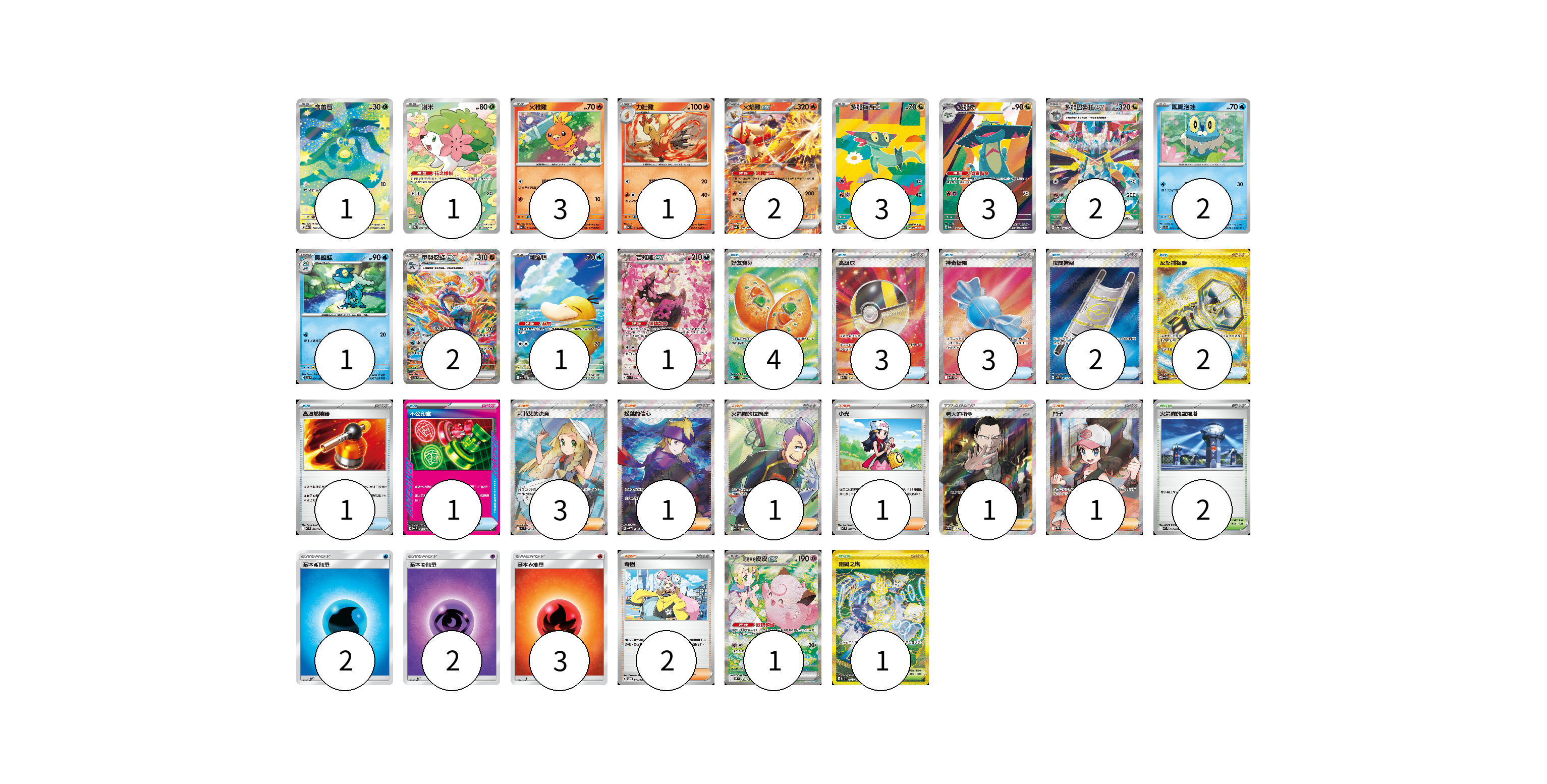 牌組構築方案 以此牌組為基礎新構築牌組 顯示卡面 顯示列表 寶可夢卡(24) 1 1 3 1 2 3 3 2 2 1 2 1 1 1 物品卡(16) 4 3 3 2 2 1 1 支援者卡(10) 3 1 1 1 1 1 2 競技場卡(3) 2 1 能量卡(7) 2 2 3 寶可夢卡(24) 卡牌名稱 張數 卡牌名稱 張數 含羞苞 M2a 196/193 01 謝米 SV9a 066/063 01 火稚雞 SV10 018/098 03 力壯雞 SV10 019/098 01 火焰雞ex SVM 016/175 02 多龍梅西亞 M2a 211/193 03 多龍奇 M2a 212/193 03 多龍巴魯托ex SV8a 221/187 02 呱呱泡蛙 SVD 027/139 02 呱頭蛙 SV5a 024/066 01 甲賀忍蛙ex SV5a 090/066 02 可達鴨 M2a 199/193 01 吉雉雞ex M2a 244/193 01 莉莉艾的皮皮ex SV9 126/100 01 物品卡(16) 卡牌名稱 張數 卡牌名稱 張數 好友寶芬 M1S 081/063 04 高級球 M2a 216/193 03 神奇糖果 M1S 082/063 03 夜間擔架 M1L 083/063 02 反擊捕捉器 SV4M 094/066 02 高溫燃燒器 M2 074/080 01 不公印章 MC 633/742 01 支援者卡(10) 卡牌名稱 張數 卡牌名稱 張數 莉莉艾的決意 M1L 086/063 03 松葉的信心 SV5K 092/071 01 火箭隊的拉姆達 SV10 122/098 01 小光 M2 077/080 01 老大的指令(坂木) SC1b 170/153 01 鬥子 SV11W 166/086 01 奇樹 SVOD 016/020 02 競技場卡(3) 卡牌名稱 張數 卡牌名稱 張數 火箭隊的監視塔 SV10 096/098 02 阻礙之塔 SV10 132/098 01 能量卡(7) 卡牌名稱 張數 卡牌名稱 張數 基本水能量 AS6D WAT 02 基本超能量 AS6D PSY 02 基本火能量 AS6D FIR 03 以此牌組為基礎新構築牌組 牌組編碼 wPgbTU-eJqjgH-QsXOVZ copy 列印牌組單 牌組編碼已複製 分享至SNS