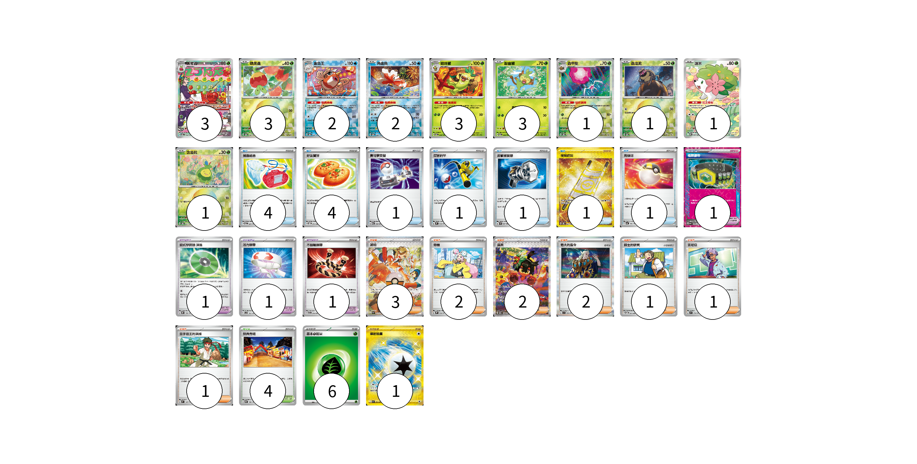 牌組構築方案 以此牌組為基礎新構築牌組 顯示卡面 顯示列表 寶可夢卡(20) 3 3 2 2 3 3 1 1 1 1 寶可夢道具(4) 1 1 1 1 物品卡(13) 4 4 1 1 1 1 1 支援者卡(12) 3 2 2 2 1 1 1 競技場卡(4) 4 能量卡(7) 6 1 寶可夢卡(20) 卡牌名稱 張數 卡牌名稱 張數 裹蜜蟲 SV6 103/101 03 啃果蟲 SV8a 008/187 03 金魚王 SV8a 029/187 02 角金魚 SV8a 028/187 02 啪咚猴 SV6 009/101 03 敲音猴 SV6 008/101 03 蟲甲聖 SV8a 014/187 01 蟲滾泥 SV8a 013/187 01 謝米 SV9a 066/063 01 含羞苞 SV8a 001/187 01 寶可夢道具(4) 卡牌名稱 張數 卡牌名稱 張數 極限腰帶 SV5K 066/071 01 招式學習器 演進 SV8a 160/187 01 活力頭帶 SVD 125/139 01 不服輸頭帶 SVTL 016/021 01 物品卡(13) 卡牌名稱 張數 卡牌名稱 張數 捕蟲組合 SV6 094/101 04 好友寶芬 SVOD 011/020 04 寶可夢交替 SV9a 058/063 01 厲害釣竿 SV2P 066/071 01 反擊捕捉器 SV4M 059/066 01 夜間擔架 SV8 137/106 01 高級球 SV4a 161/190 01 支援者卡(12) 卡牌名稱 張數 卡牌名稱 張數 派帕 SV4a 353/190 03 奇樹 SV2D 069/071 02 烏栗 SV6 129/101 02 老大的指令 SV1a 069/073 02 博士的研究 SVOD 017/020 01 吉尼亞 SV1S 074/078 01 空手道王的演練 SVM 147/175 01 競技場卡(4) 卡牌名稱 張數 卡牌名稱 張數 祭典會場 SV8a 180/187 04 能量卡(7) 卡牌名稱 張數 卡牌名稱 張數 基本【草】能量 SVF GRA 06 噴射能量 SV7a 094/064 01 以此牌組為基礎新構築牌組 牌組編碼 wQMGNg-UXolwa-TfUIgu copy 列印牌組單 牌組編碼已複製 分享至SNS