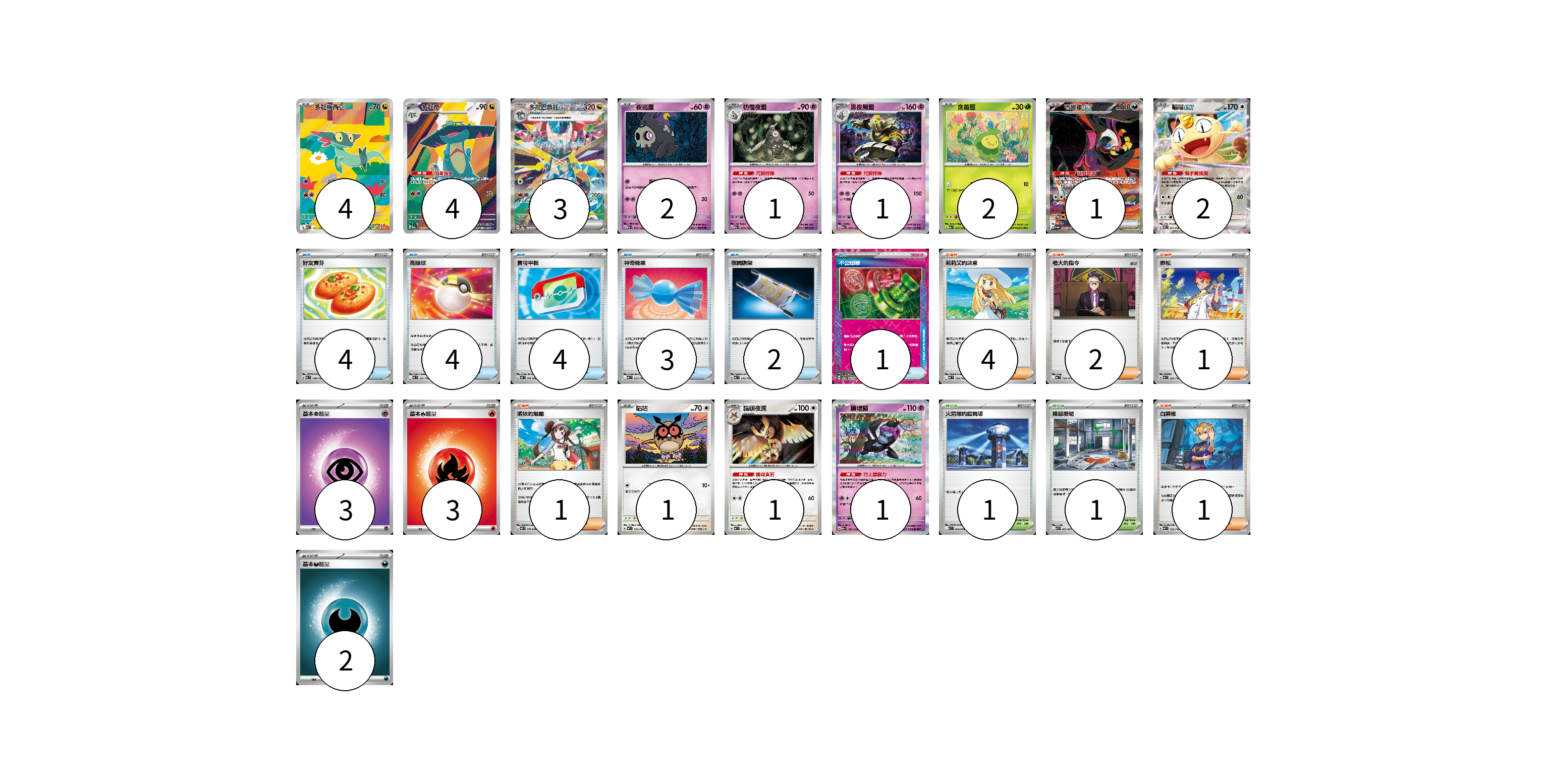 牌組構築方案 以此牌組為基礎新構築牌組 顯示卡面 顯示列表 寶可夢卡(23) 4 4 3 2 1 1 2 1 2 1 1 1 物品卡(18) 4 4 4 3 2 1 支援者卡(9) 4 2 1 1 1 競技場卡(2) 1 1 能量卡(8) 3 3 2 寶可夢卡(23) 卡牌名稱 張數 卡牌名稱 張數 多龍梅西亞 M2a 211/193 04 多龍奇 M2a 212/193 04 多龍巴魯托ex SV8a 221/187 03 夜巡靈 M2a 072/193 02 彷徨夜靈 M2a 073/193 01 黑夜魔靈 M2a 074/193 01 含羞苞 M2a 011/193 02 吉雉雞ex SV6a 089/064 01 喵喵ex M3 061/080 02 咕咕 MC 572/742 01 貓頭夜鷹 MC 573/742 01 願增猿 M2a 081/193 01 物品卡(18) 卡牌名稱 張數 卡牌名稱 張數 好友寶芬 MC 648/742 04 高級球 MC 651/742 04 寶可平板 M3 070/080 04 神奇糖果 MC 655/742 03 夜間擔架 MC 670/742 02 不公印章 SV5a 053/066 01 支援者卡(9) 卡牌名稱 張數 卡牌名稱 張數 莉莉艾的決意 MC 729/742 04 老大的指令 MC 724/742 02 赤松 MC 696/742 01 鳴依的勉勵 M3 075/080 01 白蕾雅 MC 722/742 01 競技場卡(2) 卡牌名稱 張數 卡牌名稱 張數 火箭隊的監視塔 SV10 096/098 01 險惡廢墟 M1L 063/063 01 能量卡(8) 卡牌名稱 張數 卡牌名稱 張數 基本【超】能量 MC PSY 03 基本【火】能量 MC FIR 03 基本【惡】能量 MC DAR 02 以此牌組為基礎新構築牌組 牌組編碼 wQUbwb-WlPPnW-seAVFK copy 列印牌組單 牌組編碼已複製 分享至SNS