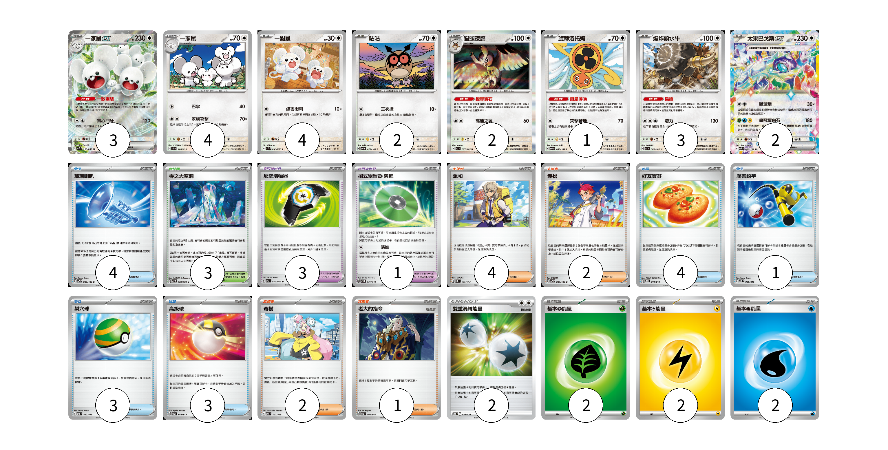 牌組構築方案 以此牌組為基礎新構築牌組 顯示卡面 顯示列表 寶可夢卡(21) 3 4 4 2 2 1 3 2 寶可夢道具(4) 3 1 物品卡(15) 4 4 1 3 3 支援者卡(9) 4 2 2 1 競技場卡(3) 3 能量卡(8) 2 2 2 2 寶可夢卡(21) 卡牌名稱 張數 卡牌名稱 張數 一家鼠ex SV4M 057/066 03 一家鼠 SVD 106/139 04 一對鼠 SV4M 055/066 04 咕咕 SV7 076/102 02 貓頭夜鷹 SV7 077/102 02 旋轉洛托姆 SV7 080/102 01 爆炸頭水牛 SV7 081/102 03 太樂巴戈斯ex SV7 088/102 02 寶可夢道具(4) 卡牌名稱 張數 卡牌名稱 張數 反擊增幅器 SV7a 059/064 03 招式學習器 演進 SVK 025/042 01 物品卡(15) 卡牌名稱 張數 卡牌名稱 張數 玻璃喇叭 SV7 089/102 04 好友寶芬 SVTG 011/019 04 厲害釣竿 SVTG 009/019 01 巢穴球 SVTG 012/019 03 高級球 SVTG 013/019 03 支援者卡(9) 卡牌名稱 張數 卡牌名稱 張數 派帕 SVK 035/042 04 赤松 SV7 097/102 02 奇樹 SVTG 017/019 02 老大的指令 SVTG 019/019 01 競技場卡(3) 卡牌名稱 張數 卡牌名稱 張數 零之大空洞 SV7 102/102 03 能量卡(8) 卡牌名稱 張數 卡牌名稱 張數 雙重渦輪能量 SVTM 022/022 02 基本【草】能量 SVTM GRA 02 基本【雷】能量 SVTR LIG 02 基本【水】能量 SVF WAT 02 以此牌組為基礎新構築牌組 牌組編碼 wRQNkE-rGLqrW-YKTvNz copy 列印牌組單 牌組編碼已複製 分享至SNS