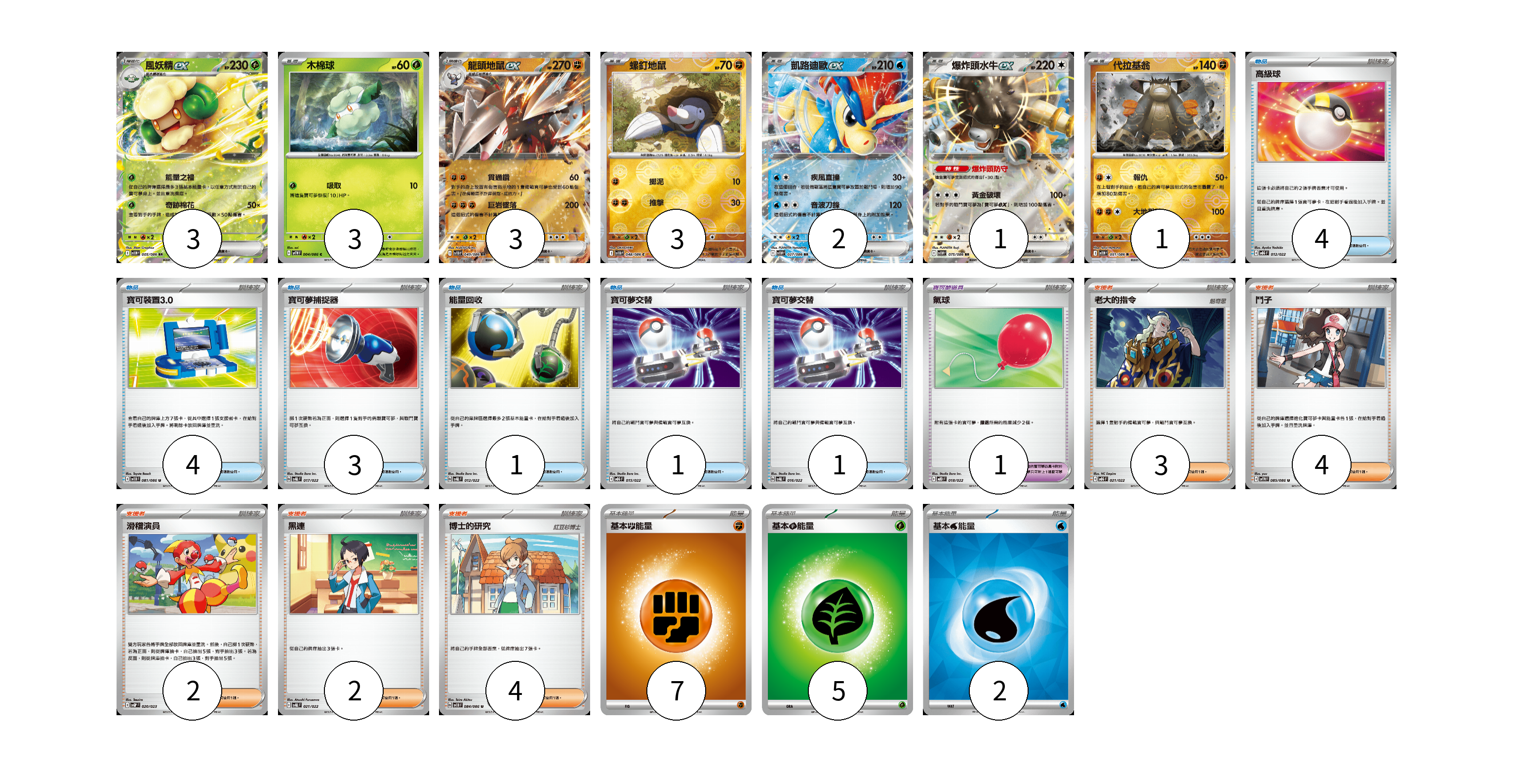 牌組構築方案 以此牌組為基礎新構築牌組 顯示卡面 顯示列表 寶可夢卡(16) 3 3 3 3 2 1 1 寶可夢道具(1) 1 物品卡(14) 4 4 3 1 1 1 支援者卡(15) 3 4 2 2 4 能量卡(14) 7 5 2 寶可夢卡(16) 卡牌名稱 張數 卡牌名稱 張數 風妖精ex SV11W 005/086 03 木棉球 SV11W 004/086 03 龍頭地鼠ex SV11B 049/086 03 螺釘地鼠 SV11B 048/086 03 凱路迪歐ex SV11W 027/086 02 爆炸頭水牛ex SV11W 075/086 01 代拉基翁 SV11W 051/086 01 寶可夢道具(1) 卡牌名稱 張數 卡牌名稱 張數 氣球 MBD 018/022 01 物品卡(14) 卡牌名稱 張數 卡牌名稱 張數 高級球 MBG 012/022 04 寶可裝置3.0 SV11B 081/086 04 寶可夢捕捉器 SVQL 017/022 03 能量回收 SVQL 012/022 01 寶可夢交替 MBG 015/022 01 寶可夢交替 SVQL 016/022 01 支援者卡(15) 卡牌名稱 張數 卡牌名稱 張數 老大的指令 MBG 021/022 03 鬥子 SV11W 085/086 04 滑稽演員 SVQP 020/023 02 黑連 SVQL 021/022 02 博士的研究 SV11B 084/086 04 能量卡(14) 卡牌名稱 張數 卡牌名稱 張數 基本【鬥】能量 M-P FIG 07 基本【草】能量 M-P GRA 05 基本【水】能量 SVK WAT 02 以此牌組為基礎新構築牌組 牌組編碼 wSmQqX-rCddOr-pNKGkB copy 列印牌組單 牌組編碼已複製 分享至SNS