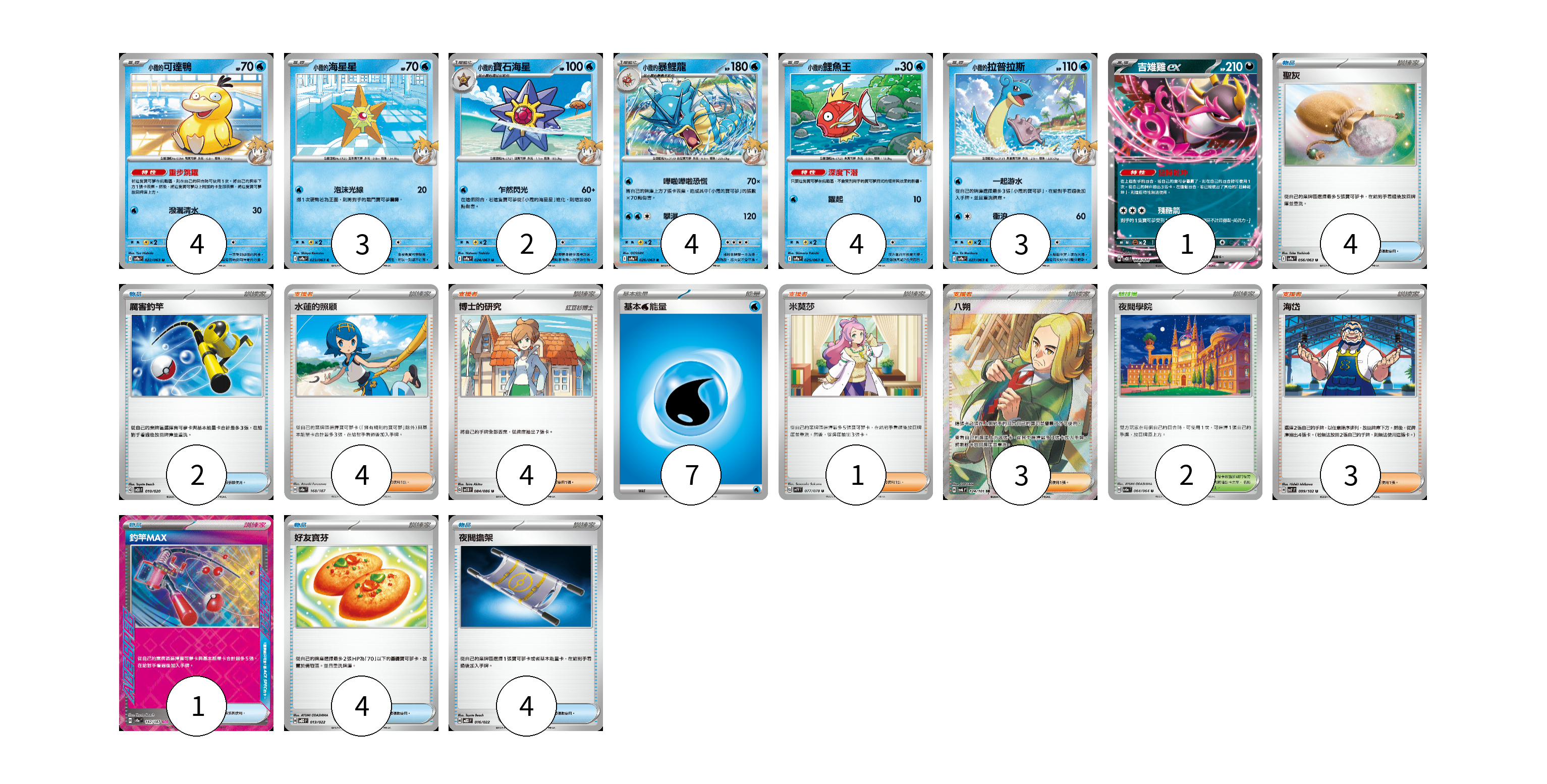 牌組構築方案 以此牌組為基礎新構築牌組 顯示卡面 顯示列表 寶可夢卡(21) 4 3 2 4 4 3 1 物品卡(15) 4 2 1 4 4 支援者卡(15) 4 4 1 3 3 競技場卡(2) 2 能量卡(7) 7 寶可夢卡(21) 卡牌名稱 張數 卡牌名稱 張數 <小霞的>可達鴨 SV9a 022/063 04 <小霞的>海星星 SV9a 023/063 03 <小霞的>寶石海星 SV9a 024/063 02 <小霞的>暴鯉龍 SV9a 026/063 04 <小霞的>鯉魚王 SV9a 025/063 04 <小霞的>拉普拉斯 SV9a 027/063 03 吉雉雞ex SVOD 004/020 01 物品卡(15) 卡牌名稱 張數 卡牌名稱 張數 聖灰 SV9a 056/063 04 厲害釣竿 SVOD 010/020 02 釣竿MAX SV8a 142/187 01 好友寶芬 MBD 013/022 04 夜間擔架 MBD 016/022 04 支援者卡(15) 卡牌名稱 張數 卡牌名稱 張數 水蓮的照顧 SV8a 168/187 04 博士的研究 SV11B 084/086 04 米莫莎 SV1V 077/078 01 八朔 SV6 124/101 03 海岱 SV7 099/102 03 競技場卡(2) 卡牌名稱 張數 卡牌名稱 張數 夜間學院 SV6a 064/064 02 能量卡(7) 卡牌名稱 張數 卡牌名稱 張數 基本水能量 sv-p WAT 07 以此牌組為基礎新構築牌組 牌組編碼 wTlQyZ-XyXetd-SFFrxF copy 列印牌組單 牌組編碼已複製 分享至SNS