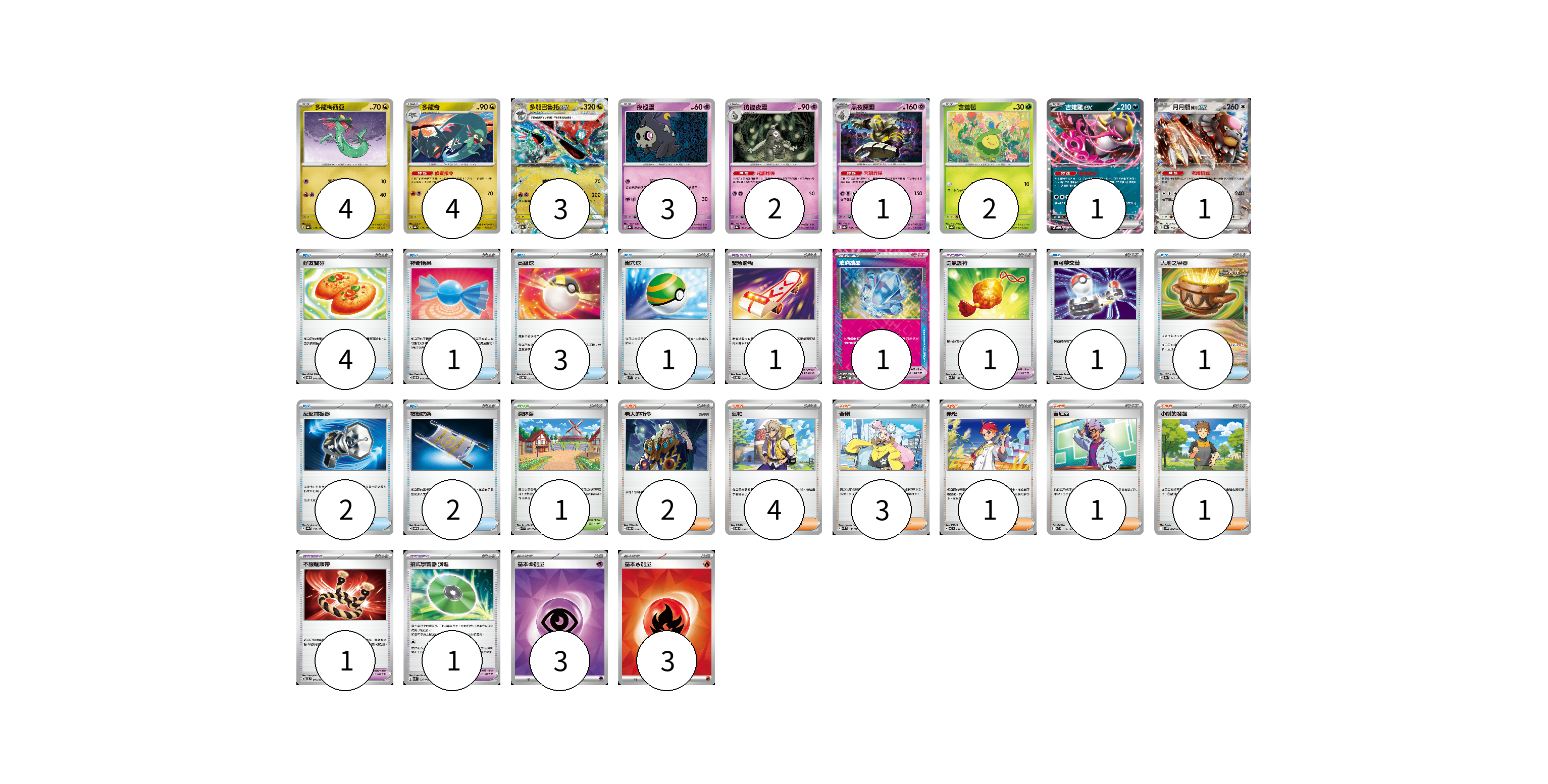 牌組構築方案 以此牌組為基礎新構築牌組 顯示卡面 顯示列表 寶可夢卡(21) 4 4 3 3 2 1 2 1 1 寶可夢道具(5) 1 1 1 1 1 物品卡(15) 4 1 3 1 1 1 2 2 支援者卡(12) 2 4 3 1 1 1 競技場卡(1) 1 能量卡(6) 3 3 寶可夢卡(21) 卡牌名稱 張數 卡牌名稱 張數 多龍梅西亞 SV8a 118/187 04 多龍奇 SV8a 119/187 04 多龍巴魯托ex SV8a 120/187 03 夜巡靈 SV8a 064/187 03 彷徨夜靈 SV8a 065/187 02 黑夜魔靈 SV8a 066/187 01 含羞苞 SV8a 001/187 02 吉雉雞ex SVOD 004/020 01 月月熊 赫月ex SV8a 134/187 01 寶可夢道具(5) 卡牌名稱 張數 卡牌名稱 張數 緊急滑板 SVOD 015/020 01 璀璨結晶 SV8a 152/187 01 勇氣護符 SVM 142/175 01 不服輸頭帶 SVTL 016/021 01 招式學習器 演進 SVK 025/042 01 物品卡(15) 卡牌名稱 張數 卡牌名稱 張數 好友寶芬 SVOD 011/020 04 神奇糖果 SVOD 013/020 01 高級球 SVOD 012/020 03 巢穴球 SVM 133/175 01 寶可夢交替 SV9a 058/063 01 大地之容器 SV8a 143/187 01 反擊捕捉器 SV8a 139/187 02 夜間擔架 SVOM 016/021 02 支援者卡(12) 卡牌名稱 張數 卡牌名稱 張數 老大的指令 SVOD 019/020 02 派帕 SVOD 018/020 04 奇樹 SVM 160/175 03 赤松 SV7 097/102 01 吉尼亞 SVD 129/139 01 小剛的發掘 SV9 096/100 01 競技場卡(1) 卡牌名稱 張數 卡牌名稱 張數 深缽鎮 SVK 039/042 01 能量卡(6) 卡牌名稱 張數 卡牌名稱 張數 基本【超】能量 SVOD PSY 03 基本【火】能量 SVK FIR 03 以此牌組為基礎新構築牌組 牌組編碼 wUnVgb-FoWuYT-Duqaux copy 列印牌組單 牌組編碼已複製 分享至SNS