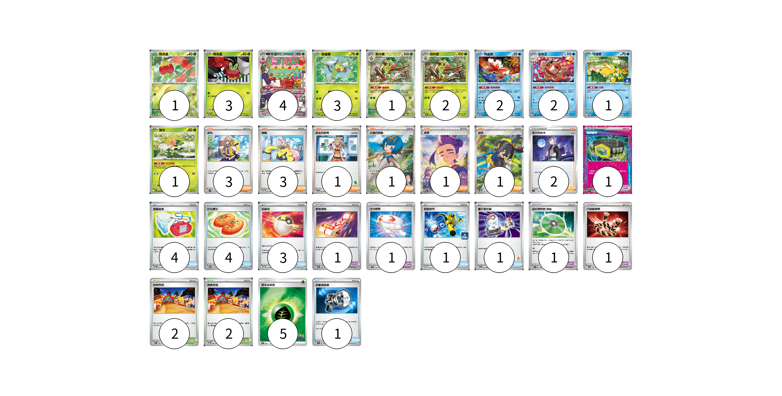 牌組構築方案 以此牌組為基礎新構築牌組 顯示卡面 顯示列表 寶可夢卡(20) 1 3 4 3 1 2 2 2 1 1 寶可夢道具(5) 1 1 1 1 1 物品卡(14) 4 4 3 1 1 1 支援者卡(12) 3 3 1 1 1 1 2 競技場卡(4) 2 2 能量卡(5) 5 寶可夢卡(20) 卡牌名稱 張數 卡牌名稱 張數 啃果蟲 SV8a 008/187 01 啃果蟲 SV6 011/101 03 裹蜜蟲 SV6 103/101 04 敲音猴 SV6 008/101 03 啪咚猴 SV8a 007/187 01 啪咚猴 SV8a 007/187 02 角金魚 SV6 026/101 02 金魚王 SV8a 029/187 02 可達鴨 SV-P 220/SV-P 01 謝米 SV9a 006/063 01 寶可夢道具(5) 卡牌名稱 張數 卡牌名稱 張數 極限腰帶 SV5K 066/071 01 緊急滑板 SV5K 064/071 01 活力頭帶 SVAW 019/023 01 招式學習器 演進 SV4M 063/066 01 不服輸頭帶 SV4a 168/190 01 物品卡(14) 卡牌名稱 張數 卡牌名稱 張數 捕蟲組合 SV6 094/101 04 好友寶芬 SV5K 063/071 04 高級球 SVOD 012/020 03 厲害釣竿 SV-P 112/SV-P 01 寶可夢交替 SVI 054/066 01 反擊捕捉器 SV4M 059/066 01 支援者卡(12) 卡牌名稱 張數 卡牌名稱 張數 派帕 SV1V 076/078 03 奇樹 SVOD 016/020 03 博士的研究 SVI 063/066 01 水蓮的照顧 SV5a 088/066 01 烏栗 SV8a 230/187 01 烏栗 SV6 122/101 01 老大的指令(赤日) SI 406/414 02 競技場卡(4) 卡牌名稱 張數 卡牌名稱 張數 祭典會場 SV8a 180/187 02 祭典會場 SV6 099/101 02 能量卡(5) 卡牌名稱 張數 卡牌名稱 張數 基本草能量 S10b GRA 05 以此牌組為基礎新構築牌組 牌組編碼 wYpuqd-hxJzVL-DwfFYQ copy 列印牌組單 牌組編碼已複製 分享至SNS