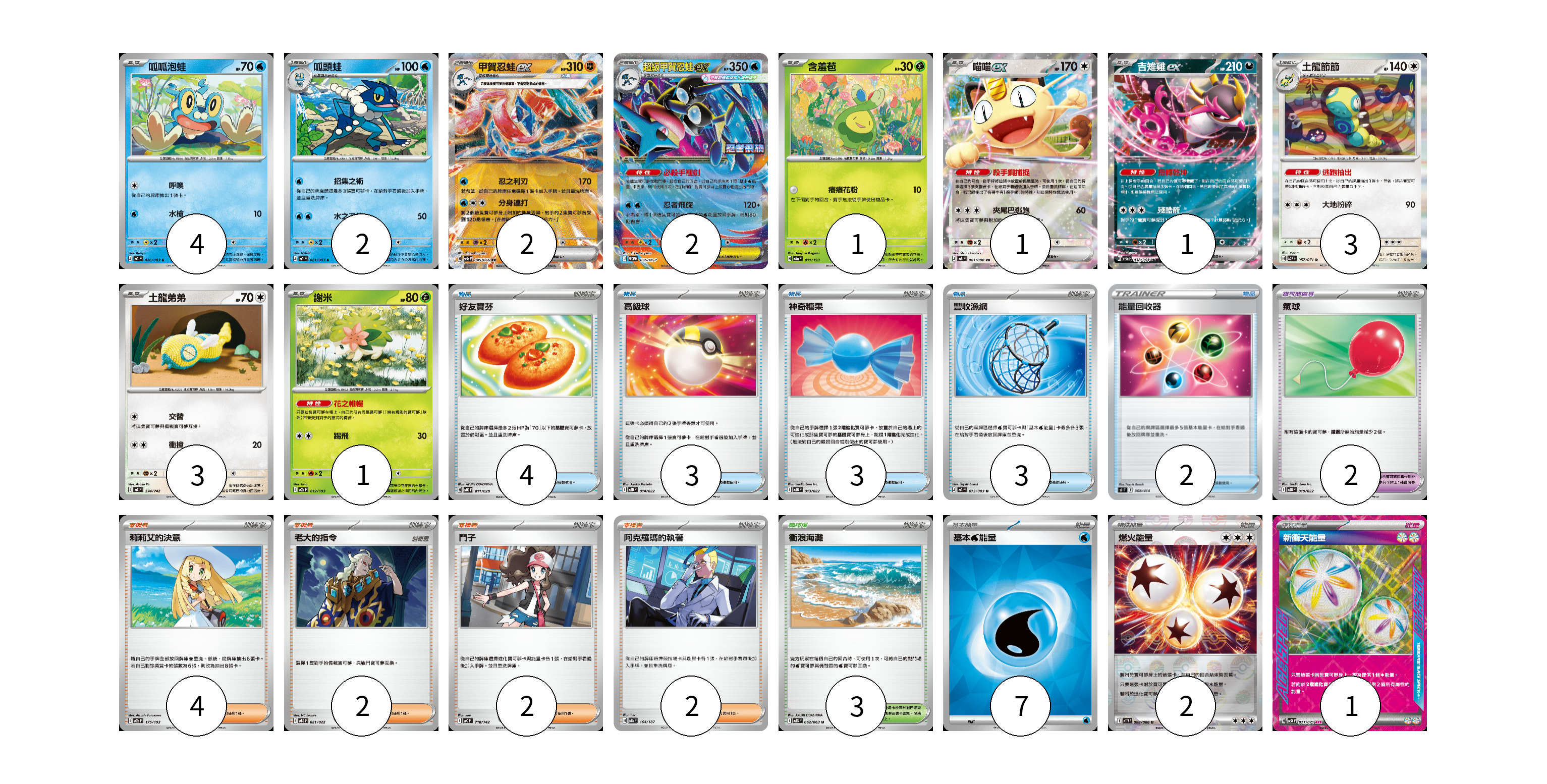 牌組構築方案 以此牌組為基礎新構築牌組 顯示卡面 顯示列表 寶可夢卡(20) 4 2 2 2 1 1 1 3 3 1 寶可夢道具(2) 2 物品卡(15) 4 3 3 3 2 支援者卡(10) 4 2 2 2 競技場卡(3) 3 能量卡(10) 7 2 1 寶可夢卡(20) 卡牌名稱 張數 卡牌名稱 張數 呱呱泡蛙 M4 020/083 04 呱頭蛙 M4 021/083 02 甲賀忍蛙ex SV5a 045/066 02 超級甲賀忍蛙ex M-P 095/M-P 02 含羞苞 M2a 011/193 01 喵喵ex M3 061/080 01 吉雉雞ex SV6a 038/064 01 土龍節節 SV5K 057/071 03 土龍弟弟 MC 574/742 03 謝米 M2a 012/193 01 寶可夢道具(2) 卡牌名稱 張數 卡牌名稱 張數 氣球 MBG 019/022 02 物品卡(15) 卡牌名稱 張數 卡牌名稱 張數 好友寶芬 SVOD 011/020 04 高級球 MBD 014/022 03 神奇糖果 MBG 013/022 03 豐收漁網 M4 073/083 03 能量回收器 SI 368/414 02 支援者卡(10) 卡牌名稱 張數 卡牌名稱 張數 莉莉艾的決意 M2a 175/193 04 老大的指令 MBG 021/022 02 鬥子 MC 718/742 02 阿克羅瑪的執著 SV8a 164/187 02 競技場卡(3) 卡牌名稱 張數 卡牌名稱 張數 衝浪海灘 M1S 062/063 03 能量卡(10) 卡牌名稱 張數 卡牌名稱 張數 基本【水】能量 SVM WAT 07 燃火能量 SV11W 086/086 02 新衝天能量 SV5K 071/071 01 以此牌組為基礎新構築牌組 牌組編碼 wZJBYs-KOSBiH-McDCvA copy 列印牌組單 牌組編碼已複製 分享至SNS