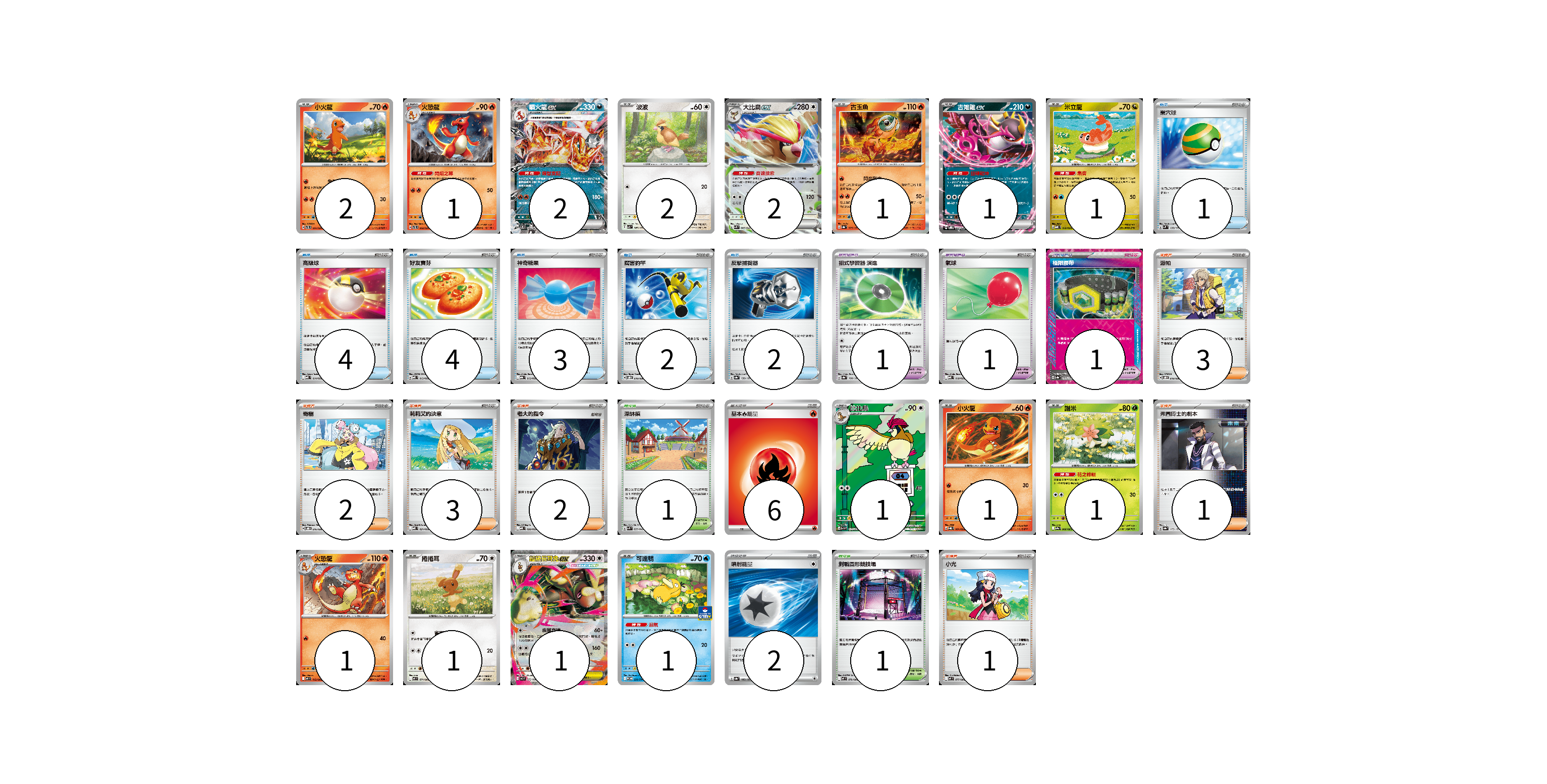 牌組構築方案 以此牌組為基礎新構築牌組 顯示卡面 顯示列表 寶可夢卡(19) 2 1 2 2 2 1 1 1 1 1 1 1 1 1 1 寶可夢道具(3) 1 1 1 物品卡(16) 1 4 4 3 2 2 支援者卡(12) 3 2 3 2 1 1 競技場卡(2) 1 1 能量卡(8) 6 2 寶可夢卡(19) 卡牌名稱 張數 卡牌名稱 張數 小火龍 SVTL 001/021 02 火恐龍 SVTL 002/021 01 噴火龍ex SVTL 006/021 02 波波 SV3 087/108 02 大比鳥ex SVK 005/042 02 古玉魚 SV8a 025/187 01 吉雉雞ex SVOD 004/020 01 米立龍 MBD 010/022 01 比比鳥 SV3 119/108 01 小火龍 SVQL 001/022 01 謝米 SV9a 006/063 01 火恐龍 M2 012/080 01 捲捲耳 M2 071/080 01 超級長耳兔ex M2 072/080 01 可達鴨 SV-P 220/SV-P 01 寶可夢道具(3) 卡牌名稱 張數 卡牌名稱 張數 招式學習器 演進 SV8a 160/187 01 氣球 MBD 018/022 01 極限腰帶 SV8a 159/187 01 物品卡(16) 卡牌名稱 張數 卡牌名稱 張數 巢穴球 SVM 133/175 01 高級球 MBD 014/022 04 好友寶芬 MBD 013/022 04 神奇糖果 MBG 013/022 03 厲害釣竿 SVOD 010/020 02 反擊捕捉器 SV8a 139/187 02 支援者卡(12) 卡牌名稱 張數 卡牌名稱 張數 派帕 SVOD 018/020 03 奇樹 SVOD 016/020 02 莉莉艾的決意 MBD 021/022 03 老大的指令 MBD 020/022 02 弗圖博士的劇本 SV8a 175/187 01 小光 M2 077/080 01 競技場卡(2) 卡牌名稱 張數 卡牌名稱 張數 深缽鎮 SVK 039/042 01 對戰圓形競技場 M2 079/080 01 能量卡(8) 卡牌名稱 張數 卡牌名稱 張數 基本火能量 sv-p FIR 06 噴射能量 SV8a 185/187 02 以此牌組為基礎新構築牌組 牌組編碼 waPIgg-NdCpfM-QdkOVl copy 列印牌組單 牌組編碼已複製 分享至SNS