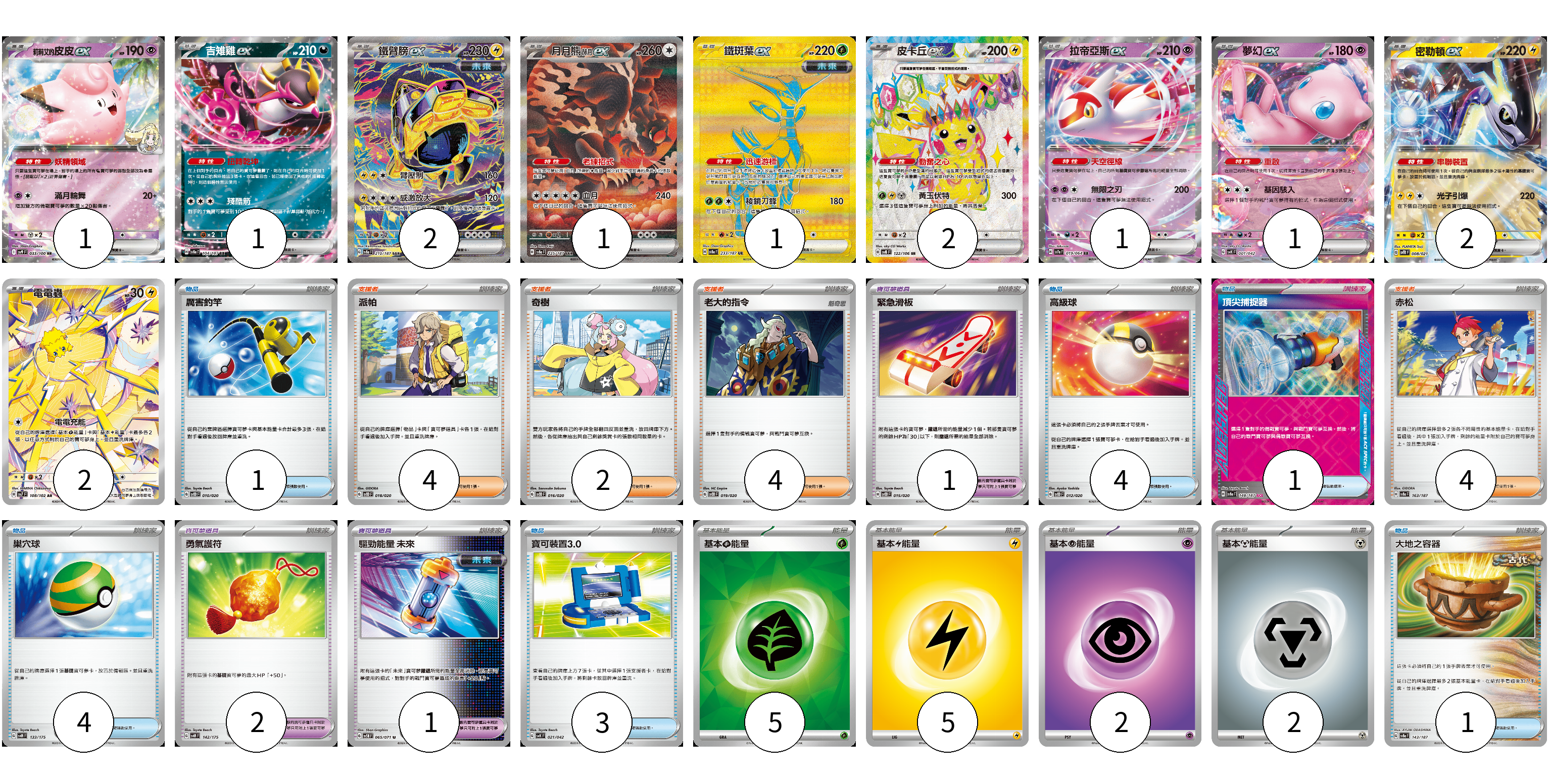 牌組構築方案 以此牌組為基礎新構築牌組 顯示卡面 顯示列表 寶可夢卡(14) 1 1 2 1 1 2 1 1 2 2 寶可夢道具(4) 1 2 1 物品卡(14) 1 4 1 4 3 1 支援者卡(14) 4 2 4 4 能量卡(14) 5 5 2 2 寶可夢卡(14) 卡牌名稱 張數 卡牌名稱 張數 莉莉艾的皮皮ex SV9 033/100 01 吉雉雞ex SV8a 104/187 01 鐵臂膀ex SV8a 210/187 02 月月熊 赫月ex SV8a 225/187 01 鐵斑葉ex SV8a 233/187 01 皮卡丘ex SV8 122/106 02 拉帝亞斯ex SV7a 019/064 01 夢幻ex SVK 001/042 01 密勒頓ex SVTR 008/021 02 電電蟲 SV7 108/102 02 寶可夢道具(4) 卡牌名稱 張數 卡牌名稱 張數 緊急滑板 SVOD 015/020 01 勇氣護符 SVM 142/175 02 驅勁能量 未來 SV5M 065/071 01 物品卡(14) 卡牌名稱 張數 卡牌名稱 張數 厲害釣竿 SVOD 010/020 01 高級球 SVOD 012/020 04 頂尖捕捉器 SV8a 148/187 01 巢穴球 SVM 133/175 04 寶可裝置3.0 SVK 021/042 03 大地之容器 SV8a 143/187 01 支援者卡(14) 卡牌名稱 張數 卡牌名稱 張數 派帕 SVOD 018/020 04 奇樹 SVOD 016/020 02 老大的指令 SVOD 019/020 04 赤松 SV8a 163/187 04 能量卡(14) 卡牌名稱 張數 卡牌名稱 張數 基本【草】能量 SVK GRA 05 基本【雷】能量 SVF LIG 05 基本【超】能量 SVF PSY 02 基本【鋼】能量 SVF MET 02 以此牌組為基礎新構築牌組 牌組編碼 wcUqRx-wstxwe-Gmcnoy copy 列印牌組單 牌組編碼已複製 分享至SNS
