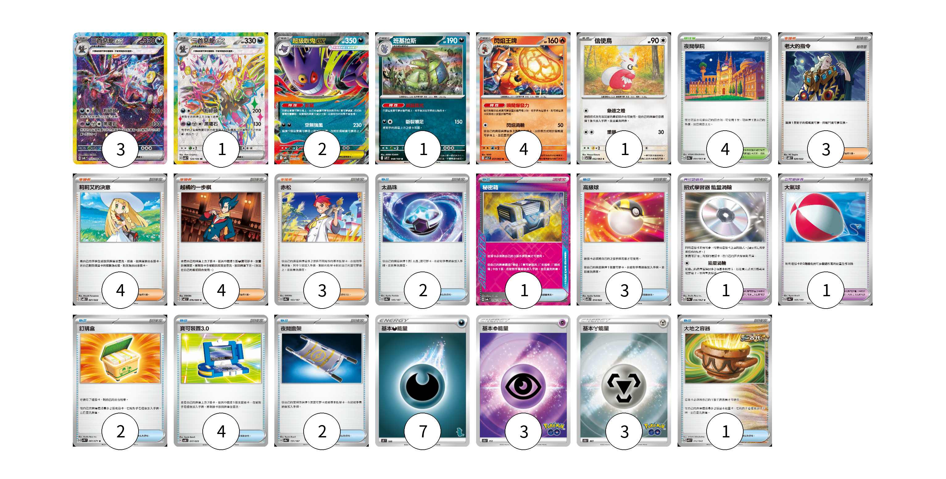 牌組構築方案 以此牌組為基礎新構築牌組 顯示卡面 顯示列表 寶可夢卡(12) 3 1 2 1 4 1 寶可夢道具(2) 1 1 物品卡(15) 2 1 3 2 4 2 1 支援者卡(14) 3 4 4 3 競技場卡(4) 4 能量卡(13) 7 3 3 寶可夢卡(12) 卡牌名稱 張數 卡牌名稱 張數 三首惡龍ex SV8 133/106 03 三首惡龍ex SV8 124/106 01 超級耿鬼ex MBG 003/022 02 班基拉斯 SV9 058/100 01 閃焰王牌 M1L 017/063 04 信使鳥 M1S 052/063 01 寶可夢道具(2) 卡牌名稱 張數 卡牌名稱 張數 招式學習器 能量渦輪 SV3a 056/062 01 大氣球 SV4a 165/190 01 物品卡(15) 卡牌名稱 張數 卡牌名稱 張數 太晶珠 SV8a 145/187 02 秘密箱 SV6 092/101 01 高級球 SVTS 014/022 03 訂購盒 SV5K 061/071 02 寶可裝置3.0 SVAM 017/023 04 夜間擔架 SV8a 151/187 02 大地之容器 SVK 012/042 01 支援者卡(14) 卡牌名稱 張數 卡牌名稱 張數 老大的指令 MBD 020/022 03 莉莉艾的決意 MBD 021/022 04 越橘的一步棋 M2 076/080 04 赤松 SV8a 163/187 03 競技場卡(4) 卡牌名稱 張數 卡牌名稱 張數 夜間學院 SV6a 064/064 04 能量卡(13) 卡牌名稱 張數 卡牌名稱 張數 基本惡能量 SH DAR 07 基本超能量 S10b PSY 03 基本鋼能量 S10b MET 03 以此牌組為基礎新構築牌組 牌組編碼 wceYGi-nMEnmf-fqjTtQ copy 列印牌組單 牌組編碼已複製 分享至SNS